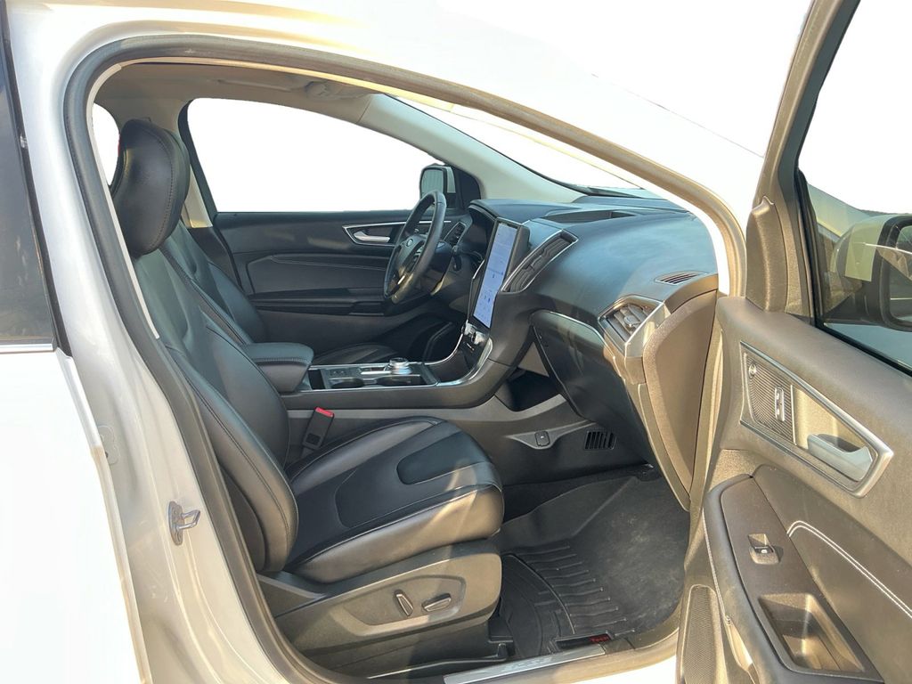 2022 Ford Edge Titanium White Metallic Titanium AWD 8-Speed Automatic EcoBoost 2.0L I4 GTDi DOHC Turbocharged VCT AWD, 12 Speakers, 3.80 Axle Ratio, 4-Wheel Disc Brakes, ABS brakes, Adaptive Cruise Control w/Stop & Go, Adaptive LED Headlamps, Air Conditioning, Alloy wheels, AM/FM radio: SiriusXM with 360L, Auto High-beam Headlights, Auto-Dimming Driver's Sideview Mirror, Auto-dimming Rear-View mirror, Automatic temperature control, Brake assist, Bumpers: body-color, Compass, Connected Built-In Navigation, Delay-off headlights, Driver door bin, Driver vanity mirror, Dual front impact airbags, Dual front side impact airbags, Electronic Stability Control, Emergency communication system: SYNC 4 911 Assist, Equipment Group 301A, Evasive Steering Assist, FordPass Connect, Four wheel independent suspension, Front 180-Degree Camera w/Split View, Front anti-roll bar, Front Bucket Seats, Front Center Armrest w/Storage, Front dual zone A/C, Front fog lights, Front reading lights, Fully automatic headlights, Garage door transmitter, Heated door mirrors, Heated front seats, Heated Rear Seats, Heated steering wheel, Illuminated entry, Knee airbag, Lane Centering, Leather-Trimmed Heated Sport Bucket Seats, Leather-Trimmed Heated/Cooled Sport Bucket Seats, Low tire pressure warning, Memory seat, Occupant sensing airbag, Outside temperature display, Overhead airbag, Overhead console, Panic alarm, Panoramic Vista Roof, Passenger door bin, Passenger vanity mirror, Power door mirrors, Power driver seat, Power Liftgate, Power passenger seat, Power steering, Power Tilt/Telescoping Steering Column w/Memory, Power windows, Radio: B&O Sound System by Bang & Olufsen, Rain sensing wipers, Rear anti-roll bar, Rear reading lights, Rear seat center armrest, Rear window defroster, Rear window wiper, Remote keyless entry, Security system, SiriusXM w/360L, Speed control, Speed-Sensitive Wipers, Split folding rear seat, Spoiler, Steering wheel mounted audio controls, SYNC 4A w/Enhanced Voice Recognition, Tachometer, Telescoping steering wheel, Tilt steering wheel, Traction control, Trip computer, Turn signal indicator mirrors, Variably intermittent wipers, Wheels: 19" Luster Nickel-Painted Aluminum, Wheels: 20" Bright-Machined Aluminum, AWD.
