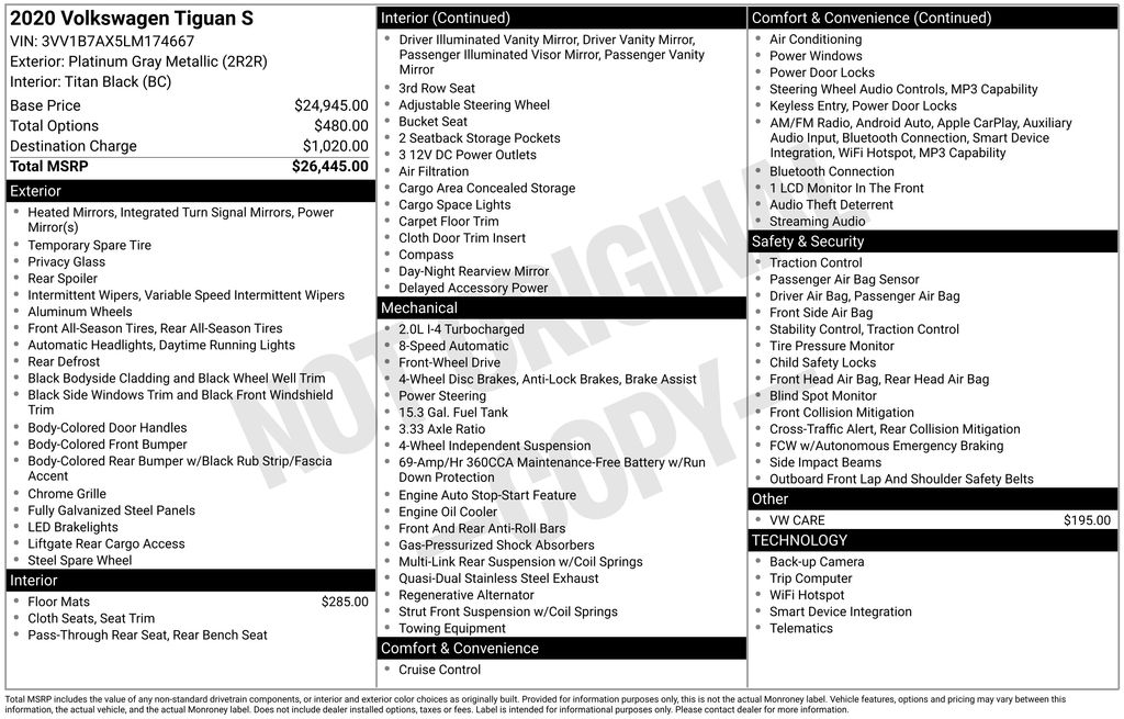 2020 Volkswagen Tiguan 2.0T S Certified. Platinum Gray Metallic 2.0T S FWD 8-Speed Automatic with Tiptronic 2.0L TSI DOHC Volkswagen Certified, 17" 10-Spoke Alloy Wheels, 3-Row Rubber Monster Mats w/Logo Kit (Set of 5), 3.33 Axle Ratio, 3rd row seats: bench, 4-Wheel Disc Brakes, 4-Wheel Independent Suspension, 6 Speakers, ABS brakes, Air Conditioning, Alloy wheels, AM/FM radio, Brake assist, Bumpers: body-color, Cloth Seating Surfaces, Compass, Delay-off headlights, Driver door bin, Driver vanity mirror, Dual front impact airbags, Dual front side impact airbags, Electronic Stability Control, Emergency communication system: VW Car-Net services (capabilities require enrollment or subscription), Exterior Parking Camera Rear, Forward collision: FCW w/Autonomous Emergency Braking mitigation, Four wheel independent suspension, Front anti-roll bar, Front Bucket Seats, Front Center Armrest, Front reading lights, Fully automatic headlights, Heated door mirrors, Heavy Duty Trunk Liner w/VW CarGo Blocks, Illuminated entry, Low tire pressure warning, Occupant sensing airbag, Outside temperature display, Overhead airbag, Overhead console, Panic alarm, Passenger door bin, Passenger vanity mirror, Power door mirrors, Power steering, Power windows, Radio data system, Radio: Composition Color AM/FM, Rear anti-roll bar, Rear reading lights, Rear seat center armrest, Rear window defroster, Rear window wiper, Remote keyless entry, Roof rack: rails only, Speed control, Speed-sensing steering, Split folding rear seat, Spoiler, Steering wheel mounted audio controls, Tachometer, Telescoping steering wheel, Tilt steering wheel, Traction control, Trip computer, Turn signal indicator mirrors, Variably intermittent wipers, VW App-Connect (w/Apple CarPlay, Android Auto & MirrorLink), VW Care.