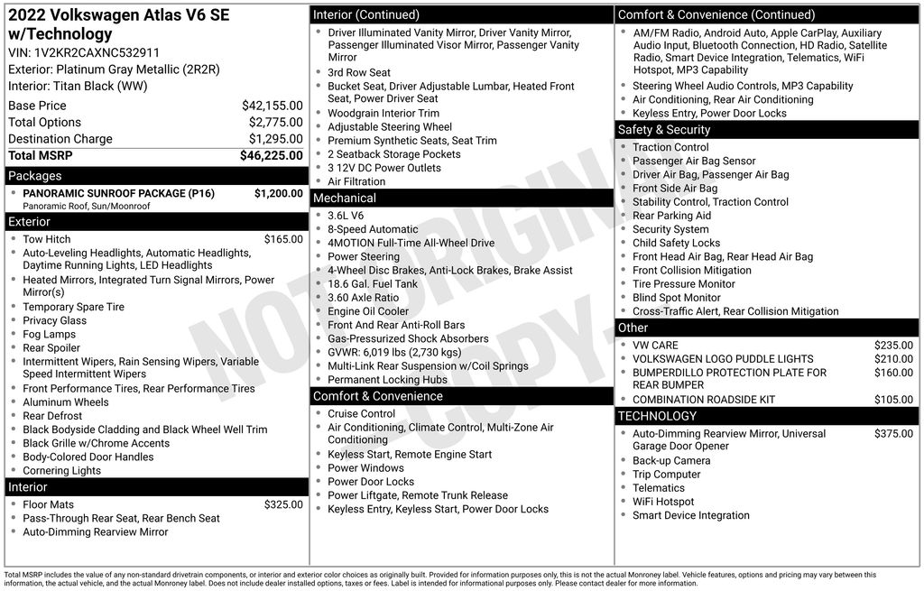 2022 Volkswagen Atlas 3.6L V6 SE w/Technology Certified. Platinum Gray Metallic 3.6L V6 SE w/Technology AWD 8-Speed Automatic with Tiptronic 3.6L VR6 Volkswagen Certified, 3.60 Axle Ratio, 3rd row seats: split-bench, 4-Wheel Disc Brakes, 6 Speakers, ABS brakes, Air Conditioning, Alloy wheels, AM/FM radio: SiriusXM with 360L, Auto-Dimming Rear-View Mirror, Auto-dimming Rear-View mirror, Automatic temperature control, Brake assist, Bumperdillo Protection Plate for Rear Bumper, Bumpers: body-color, Compass, Delay-off headlights, Driver door bin, Driver vanity mirror, Dual front impact airbags, Dual front side impact airbags, Electronic Stability Control, Emergency communication system, Exterior Parking Camera Rear, First Aid Kit, Four wheel independent suspension, Front anti-roll bar, Front Bucket Seats, Front Center Armrest, Front dual zone A/C, Front fog lights, Front reading lights, Fully automatic headlights, Heated Comfort Front Bucket Seats, Heated door mirrors, Heated front seats, Illuminated entry, Leather Shift Knob, Low tire pressure warning, Occupant sensing airbag, Outside temperature display, Overhead airbag, Overhead console, Panic alarm, Panoramic Sunroof Package, Passenger door bin, Passenger vanity mirror, Perforated V-Tex Leatherette Seating Surfaces, Power door mirrors, Power driver seat, Power Liftgate, Power steering, Power Tilting & Sliding Panoramic Sunroof, Power windows, Radio data system, Radio: MIB3 Composition Media w/8" Touchscreen, Rain sensing wipers, Rear air conditioning, Rear anti-roll bar, Rear reading lights, Rear seat center armrest, Rear window defroster, Rear window wiper, Remote keyless entry, Roadside Assistance Kit, Roof rack: rails only, Rubber Mats Kit - Bench Seats, Security system, Speed control, Speed-sensing steering, Split folding rear seat, Spoiler, Standard Suspension, Steering wheel mounted audio controls, Tachometer, Telescoping steering wheel, Tilt steering wheel, Traction control, Trailer Hitch Extras, Trip computer, Trunk Liner w/VW CarGo Blocks, Turn signal indicator mirrors, Variably intermittent wipers, Volkswagen Logo Puddle Lights, VW Care, Wheels: 20" x 8J 5-Spoke Silver Painted Alloy.