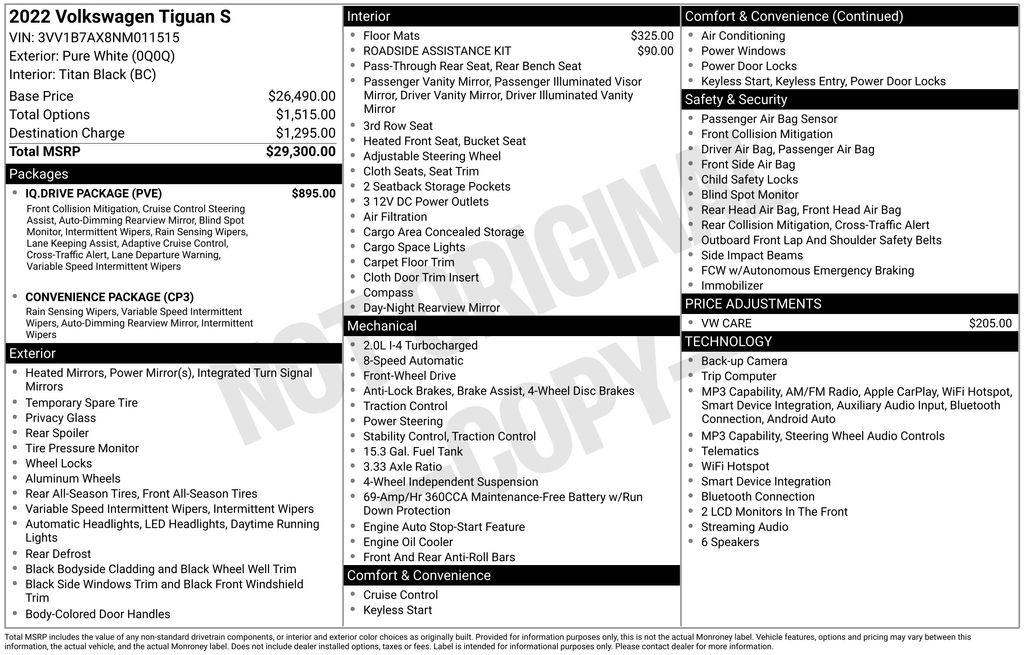 2022 Volkswagen Tiguan 2.0T S Certified. Pure White 2.0T S FWD 8-Speed Automatic with Tiptronic 2.0L TSI DOHC Volkswagen Certified, 3-Row Rubber Monster Mats w/Logo Kit (Set of 5), 3.33 Axle Ratio, 3rd row seats: bench, 4-Wheel Disc Brakes, 4-Wheel Independent Suspension, 6 Speakers, ABS brakes, Active Side Assist (Blind Spot Monitor), Adaptive Cruise Control (ACC) w/Stop & Go, Air Conditioning, Alloy wheels, AM/FM radio, Auto-Dimming Interior Rear-View Mirror, Automatic Rain-Sensing Front Wipers, Brake assist, Bumpers: body-color, Cloth Seating Surfaces, Compass, Convenience Package, Delay-off headlights, Driver door bin, Driver vanity mirror, Dual front impact airbags, Dual front side impact airbags, Electronic Stability Control, Emergency Assist, Emergency communication system: Car-Net, Exterior Parking Camera Rear, Forward collision: FCW w/Autonomous Emergency Braking mitigation, Four wheel independent suspension, Front anti-roll bar, Front Assist, Front Bucket Seats, Front Center Armrest, Front reading lights, Fully automatic headlights, Hands-On Detection Sensors in Steering Wheel, Heated door mirrors, Heated Front Bucket Seats, Heated front seats, Heavy Duty Trunk Liner w/VW CarGo Blocks, Illuminated entry, IQ.DRIVE Package, Lane Assist (Lane Keeping System), Leather Shift Knob, Leatherette-Wrapped Steering Wheel, Low tire pressure warning, Occupant sensing airbag, Outside temperature display, Overhead airbag, Overhead console, Panic alarm, Passenger door bin, Passenger vanity mirror, Power door mirrors, Power steering, Power windows, Radio data system, Radio: Composition Color AM/FM, Rear anti-roll bar, Rear reading lights, Rear seat center armrest, Rear Traffic Alert, Rear window defroster, Rear window wiper, Remote keyless entry, Roadside Assistance Kit, Roof rack: rails only, Speed control, Speed-sensing steering, Split folding rear seat, Spoiler, Steering wheel mounted audio controls, Tachometer, Telescoping steering wheel, Tilt steering wheel, Traction control, Travel Assist (Semi-Automated Driving Assistance), Trip computer, Turn signal indicator mirrors, Variably intermittent wipers, VW Care, Wheels: 17" 2-Tone Machined Twin 5-Spoke Alloy.