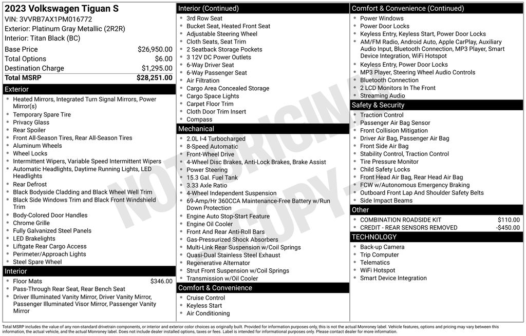 2023 Volkswagen Tiguan 2.0T S Certified. Gray 2.0T S FWD 8-Speed Automatic with Tiptronic 2.0L TSI DOHC Volkswagen Certified, 3.33 Axle Ratio, 3rd row seats: bench, 4-Wheel Disc Brakes, 4-Wheel Independent Suspension, 6 Speakers, ABS brakes, Air Conditioning, Alloy wheels, AM/FM radio, Brake assist, Bumpers: body-color, Cloth Seating Surfaces, Compass, Delay-off headlights, Driver door bin, Driver vanity mirror, Dual front impact airbags, Dual front side impact airbags, Electronic Stability Control, Emergency communication system: VW Car-Net Safe & Secure 5-year, Exterior Parking Camera Rear, Forward collision: FCW w/Autonomous Emergency Braking mitigation, Four wheel independent suspension, Front anti-roll bar, Front Bucket Seats, Front Center Armrest, Front reading lights, Fully automatic headlights, Heated door mirrors, Heated Front Bucket Seats, Heated front seats, Illuminated entry, Leather Shift Knob, Low tire pressure warning, Occupant sensing airbag, Outside temperature display, Overhead airbag, Overhead console, Panic alarm, Passenger door bin, Passenger vanity mirror, Power door mirrors, Power steering, Power windows, Radio data system, Radio: Composition Color AM/FM, Rear anti-roll bar, Rear reading lights, Rear seat center armrest, Rear window defroster, Rear window wiper, Remote keyless entry, Speed control, Speed-sensing steering, Split folding rear seat, Spoiler, Steering wheel mounted audio controls, Tachometer, Telescoping steering wheel, Tilt steering wheel, Traction control, Trip computer, Turn signal indicator mirrors, Variably intermittent wipers, Wheels: 17" 2-Tone Machined Twin 5-Spoke Alloy.