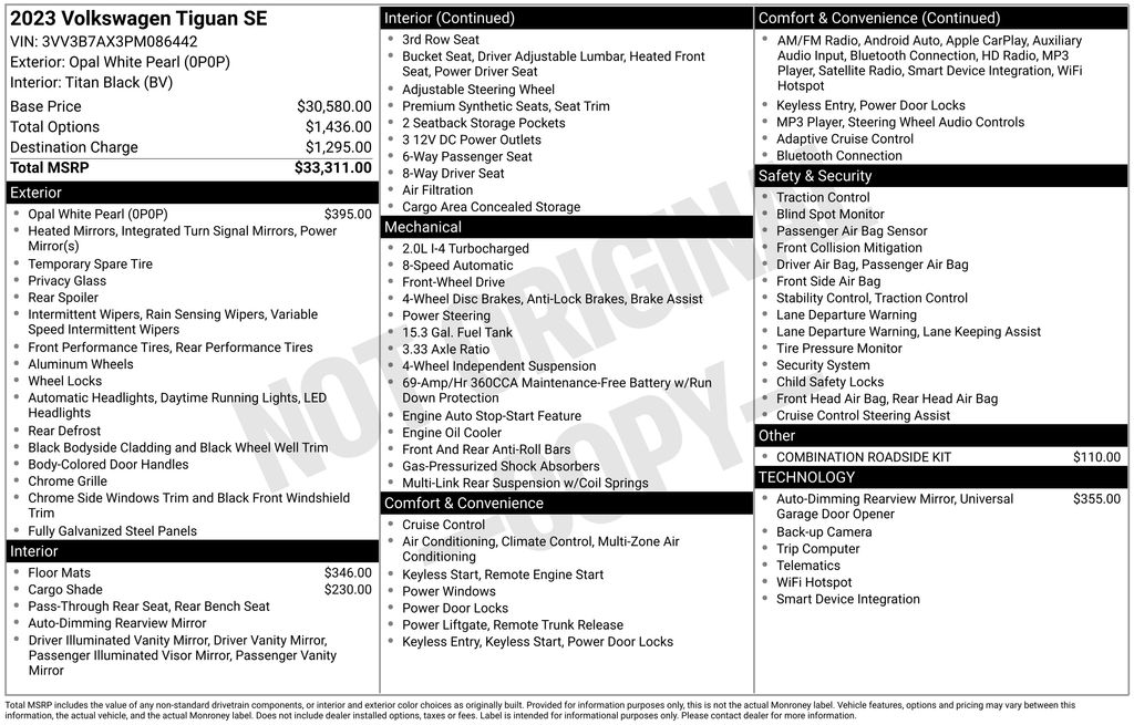 2023 Volkswagen Tiguan 2.0T SE Certified. Opal White 2.0T SE FWD 8-Speed Automatic with Tiptronic 2.0L TSI DOHC Volkswagen Certified, 3-Row Rubber Monster Mats w/Logo Kit (Set of 5), 3.33 Axle Ratio, 3rd row seats: bench, 4-Wheel Disc Brakes, 4-Wheel Independent Suspension, 6 Speakers, ABS brakes, Air Conditioning, Alloy wheels, AM/FM radio: SiriusXM with 360L, Auto-dimming Rear-View mirror, Auto-Dimming Rearview Mirror w/Compass/HomeLink (DISC), Automatic temperature control, Brake assist, Bumpers: body-color, Cargo Area Retractable Privacy Cover, Compass, Delay-off headlights, Driver door bin, Driver vanity mirror, Dual front impact airbags, Dual front side impact airbags, Electronic Stability Control, Emergency communication system: VW Car-Net Safe & Secure 5-year, Exterior Parking Camera Rear, First Aid Kit, Four wheel independent suspension, Front anti-roll bar, Front Bucket Seats, Front Center Armrest, Front dual zone A/C, Front reading lights, Fully automatic headlights, Heated door mirrors, Heated Front Comfort Seats, Heated front seats, Heavy Duty Trunk Liner w/VW CarGo Blocks, Illuminated entry, Leather Shift Knob, Low tire pressure warning, Occupant sensing airbag, Outside temperature display, Overhead airbag, Overhead console, Panic alarm, Passenger door bin, Passenger vanity mirror, Perforated V-Tex Leatherette Seating Surfaces, Power door mirrors, Power driver seat, Power Liftgate, Power steering, Power windows, Radio data system, Radio: MIB3 Composition Media AM/FM/HD, Rain sensing wipers, Rear anti-roll bar, Rear reading lights, Rear seat center armrest, Rear window defroster, Rear window wiper, Remote keyless entry, Roadside Assistance Kit, Security system, Speed control, Speed-sensing steering, Split folding rear seat, Spoiler, Steering wheel mounted audio controls, Tachometer, Telescoping steering wheel, Tilt steering wheel, Traction control, Trip computer, Turn signal indicator mirrors, Variably intermittent wipers, Wheels: 18" Dark Graphite Painted 10-Spoke Alloy.