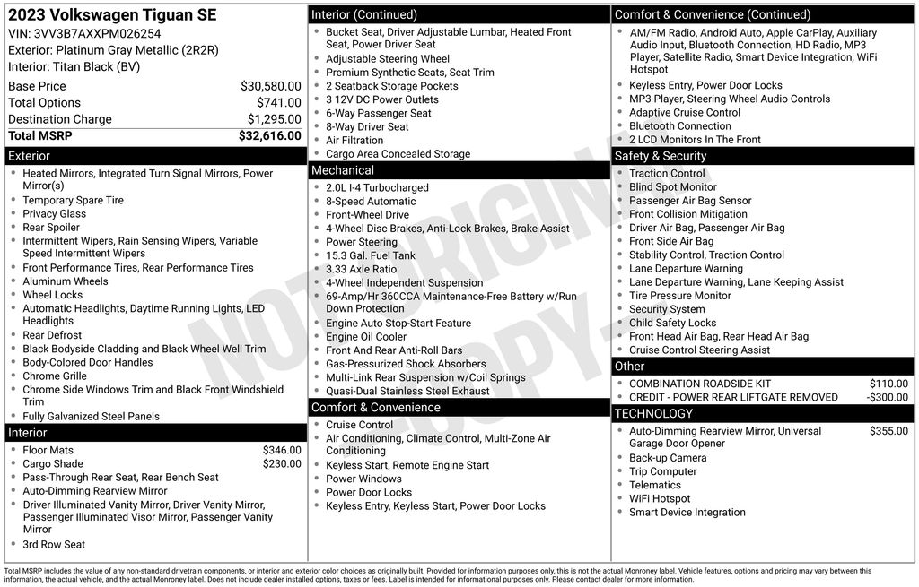 2023 Volkswagen Tiguan 2.0T SE Certified. Platinum Gray Metallic 2.0T SE FWD 8-Speed Automatic with Tiptronic 2.0L TSI DOHC Volkswagen Certified, 3-Row Rubber Monster Mats w/Logo Kit (Set of 5), 3.33 Axle Ratio, 3rd row seats: bench, 4-Wheel Disc Brakes, 4-Wheel Independent Suspension, 6 Speakers, ABS brakes, Air Conditioning, Alloy wheels, AM/FM radio: SiriusXM with 360L, Auto-dimming Rear-View mirror, Auto-Dimming Rearview Mirror w/Compass/HomeLink (DISC), Automatic temperature control, Brake assist, Bumpers: body-color, Cargo Area Retractable Privacy Cover, Compass, Credit - Power Rear Liftgate Removed, Delay-off headlights, Driver door bin, Driver vanity mirror, Dual front impact airbags, Dual front side impact airbags, Electronic Stability Control, Emergency communication system: VW Car-Net Safe & Secure 5-year, Exterior Parking Camera Rear, First Aid Kit, Four wheel independent suspension, Front anti-roll bar, Front Bucket Seats, Front Center Armrest, Front dual zone A/C, Front reading lights, Fully automatic headlights, Heated door mirrors, Heated Front Comfort Seats, Heated front seats, Heavy Duty Trunk Liner w/VW CarGo Blocks, Illuminated entry, Leather Shift Knob, Low tire pressure warning, Occupant sensing airbag, Outside temperature display, Overhead airbag, Overhead console, Panic alarm, Passenger door bin, Passenger vanity mirror, Perforated V-Tex Leatherette Seating Surfaces, Power door mirrors, Power driver seat, Power Liftgate, Power steering, Power windows, Radio data system, Radio: MIB3 Composition Media AM/FM/HD, Rain sensing wipers, Rear anti-roll bar, Rear reading lights, Rear seat center armrest, Rear window defroster, Rear window wiper, Remote keyless entry, Roadside Assistance Kit, Security system, Speed control, Speed-sensing steering, Split folding rear seat, Spoiler, Steering wheel mounted audio controls, Tachometer, Telescoping steering wheel, Tilt steering wheel, Traction control, Trip computer, Turn signal indicator mirrors, Variably intermittent wipers, Wheels: 18" Dark Graphite Painted 10-Spoke Alloy.