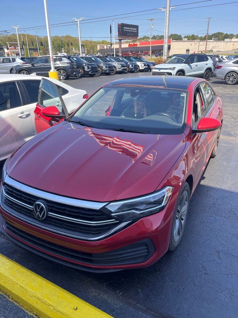 2024 Volkswagen Jetta 1.5T SE Certified. Red Metallic 1.5T SE FWD 8-Speed Automatic with Tiptronic 1.5L I-4 DI DOHC Turbocharged Volkswagen Certified, Titan Black Premium Synthetic, 4 Speakers, 4-Wheel Disc Brakes, ABS brakes, Active Blind Spot Monitor, Air Conditioning, Alloy wheels, Auto-dimming Rear-View mirror, Automatic temperature control, Brake assist, Bumpers: body-color, Delay-off headlights, Driver door bin, Driver vanity mirror, Dual front impact airbags, Dual Front Reading Lights, Dual front side impact airbags, Electronic Stability Control, Emergency communication system: VW Car-Net Safe & Secure 5-year, Exterior Parking Camera Rear, Front anti-roll bar, Front Bucket Seats, Front Center Armrest, Front dual zone A/C, Front wheel independent suspension, Fully automatic headlights, Heated door mirrors, Heated Front Seats, Heated front seats, Illuminated entry, Illuminated Vanity Mirrors, Leather Shift Knob, Leather steering wheel, Low tire pressure warning, Occupant sensing airbag, Outside temperature display, Overhead airbag, Overhead console, Overhead Storage Compartment, Panic alarm, Panoramic Sunroof Package, Passenger door bin, Passenger vanity mirror, Power door mirrors, Power driver seat, Power steering, Power Tilting & Sliding Panoramic Sunroof, Power windows, Radio data system, Radio: MIB3 Composition Color w/6.5" Touchscreen, Rain sensing wipers, Rear anti-roll bar, Rear reading lights, Rear seat center armrest, Rear window defroster, Remote keyless entry, Rubber Monster Mats (Set of 4), Speed control, Speed-sensing steering, Split folding rear seat, Steering wheel mounted audio controls, Tachometer, Telescoping steering wheel, Tilt steering wheel, Traction control, Trip computer, V-Tex Leatherette Seat Trim, Variably intermittent wipers, Wheels: 17" Twin 5-Spoke Silver Painted Alloy, Titan Black Premium Synthetic.