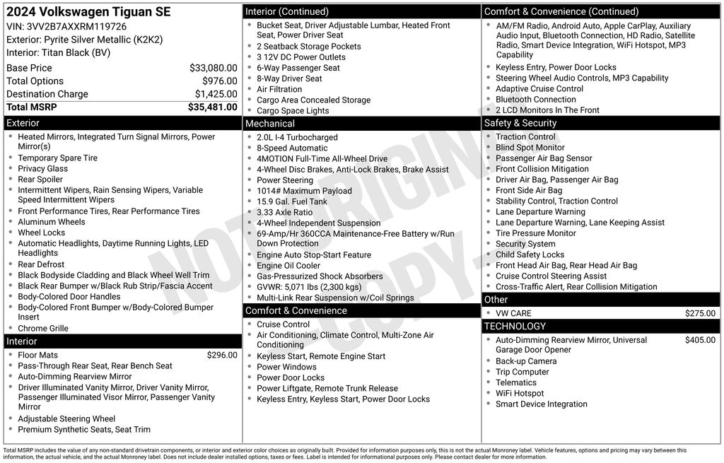 2024 Volkswagen Tiguan 2.0T SE Certified. Pyrite Silver Metallic 2.0T SE AWD 8-Speed Automatic with Tiptronic 2.0L TSI DOHC Volkswagen Certified, AWD, 2-Row Rubber Monster Mats Kit (Set of 4), 3.33 Axle Ratio, 4-Wheel Disc Brakes, 4-Wheel Independent Suspension, 6 Speakers, ABS brakes, Air Conditioning, Alloy wheels, AM/FM radio: SiriusXM with 360L, Auto-dimming Rear-View mirror, Auto-Dimming Rearview Mirror w/HomeLink Connect, Automatic temperature control, Brake assist, Bumpers: body-color, Compass, Delay-off headlights, Driver door bin, Driver vanity mirror, Dual front impact airbags, Dual front side impact airbags, Electronic Stability Control, Emergency communication system: VW Car-Net Safe & Secure 5-year, Exterior Parking Camera Rear, Four wheel independent suspension, Front anti-roll bar, Front Bucket Seats, Front Center Armrest, Front dual zone A/C, Front reading lights, Fully automatic headlights, Heated door mirrors, Heated Front Seats, Heated front seats, Heavy Duty Trunk Liner w/VW CarGo Blocks, Illuminated entry, Leather Shift Knob, Low tire pressure warning, Occupant sensing airbag, Outside temperature display, Overhead airbag, Overhead console, Panic alarm, Passenger door bin, Passenger vanity mirror, Perforated V-Tex Leatherette Seating Surfaces, Power door mirrors, Power driver seat, Power Liftgate, Power steering, Power windows, Radio data system, Radio: MIB3 Composition Media AM/FM/HD, Rain sensing wipers, Rear anti-roll bar, Rear reading lights, Rear seat center armrest, Rear window defroster, Rear window wiper, Remote keyless entry, Security system, Speed control, Speed-sensing steering, Split folding rear seat, Spoiler, Steering wheel mounted audio controls, Tachometer, Telescoping steering wheel, Tilt steering wheel, Traction control, Trip computer, Turn signal indicator mirrors, Variably intermittent wipers, VW Care, Wheels: 18" Dark Graphite Painted 10-Spoke Alloy, AWD.