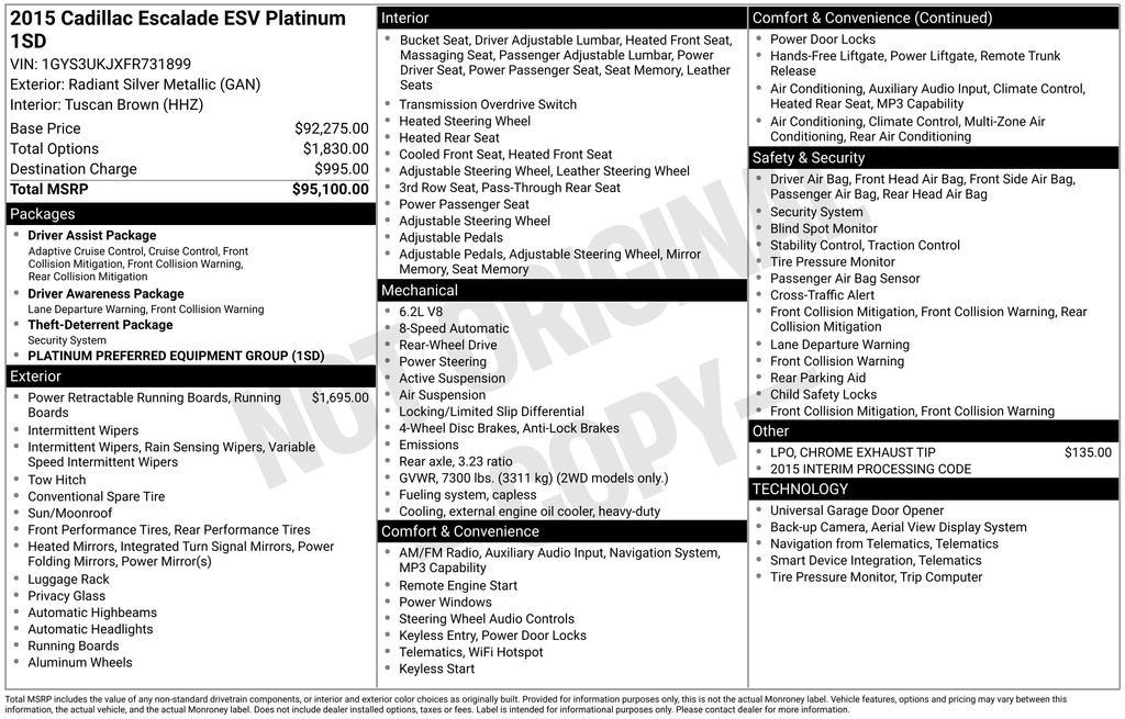 2015 Cadillac Escalade ESV Platinum Edition Radiant Silver Metallic Platinum Edition RWD 8-Speed Automatic Vortec 6.2L V8 SIDI 16 Speakers, 3.23 Axle Ratio, 3rd Row DVD Screen, 3rd row seats: split-bench, 4-Wheel Disc Brakes, A/V remote, ABS brakes, Adaptive Full-Speed Range Cruise Control, Adaptive suspension, Adjustable pedals, Air Conditioning, Alloy wheels, AM/FM radio: SiriusXM, Auto High-beam Headlights, Auto tilt-away steering wheel, Auto-dimming door mirrors, Auto-dimming Rear-View mirror, Auto-leveling suspension, Automatic Safety Belt Tightening, Automatic temperature control, Bodyside moldings, Bose Centerpoint Surround Sound System, Brake assist, Bumpers: body-color, CD player, Chrome Exhaust Tip, Compass, Cooled Console w/Covered Storage, Delay-off headlights, Driver Assist Package, Driver Awareness Package, Driver door bin, Driver vanity mirror, Dual front impact airbags, Dual front side impact airbags, Dual Independent DVD Screens, DVD-Audio, Electronic Powered Parking Brake, Electronic Stability Control, Emergency communication system: OnStar Directions & Connections, Exterior Parking Camera Rear, Forward Collision Alert, Front & Rear Automatic Braking, Front anti-roll bar, Front Bucket Seats, Front Center Armrest w/Storage, Front dual zone A/C, Front reading lights, Front wheel independent suspension, Full Semi-Aniline Leather Nappa Seat Trim, Fully automatic headlights, Garage door transmitter, Genuine wood dashboard insert, Headphones, Heads-Up Display, Heated & Cooled Front Bucket Seats, Heated door mirrors, Heated front seats, Heated rear seats, Heated steering wheel, Illuminated Door Handles, Illuminated entry, IntelliBeam Headlamps, Lane Change Alert, Lane Departure Warning System, Leather Shift Knob, Leather steering wheel, Leather Wrapped IP/Console/Door, Low tire pressure warning, Magnetic Ride Control Suspension, Memory seat, Microfiber Sueded Headliner, Navigation System, NavTraffic, Occupant sensing airbag, Outside temperature display, Overhead airbag, Overhead console, Panic alarm, Passenger door bin, Passenger vanity mirror, Pedal memory, Platinum Badge, Platinum Package, Platinum Sill Plates, Power door mirrors, Power driver seat, Power Liftgate, Power moonroof, Power passenger seat, Power steering, Power Tilt-Sliding Sunroof w/Express-Open/Close, Power windows, Power-Retractable Assist Steps, Preferred Equipment Group 1SD, Premium Floor Mats, Radio data system, Radio: Cadillac CUE Info/Media Ctrl Sys w/Embd Nav, Rain sensing wipers, Rear air conditioning, Rear anti-roll bar, Rear audio controls, Rear Cross-Traffic Alert, Rear reading lights, Rear Seat Entertainment System, Rear window defroster, Rear window wiper, Reconfigurable 4-Color Head-Up Display, Remote keyless entry, Roof rack: rails only, Second Row Bucket Seats, Security system, Side Blind Zone Alert, SiriusXM Satellite Audio System, Speed control, Split folding rear seat, Spoiler, Steering wheel memory, Steering wheel mounted audio controls, Tachometer, Telescoping steering wheel, Theft-Deterrent Alarm System, Theft-Deterrent Package, Tilt steering wheel, Traction control, Trip computer, Turn signal indicator mirrors, Unique Exotic Wood, Unique Grille Design, VAC Power 17" Disc Brakes, Variably intermittent wipers, Vehicle Inclination Sensor, Vehicle Interior Movement Sensor, Ventilated front seats, Wheels: 22" x 9" Premium Painted w/Chrome Inserts.