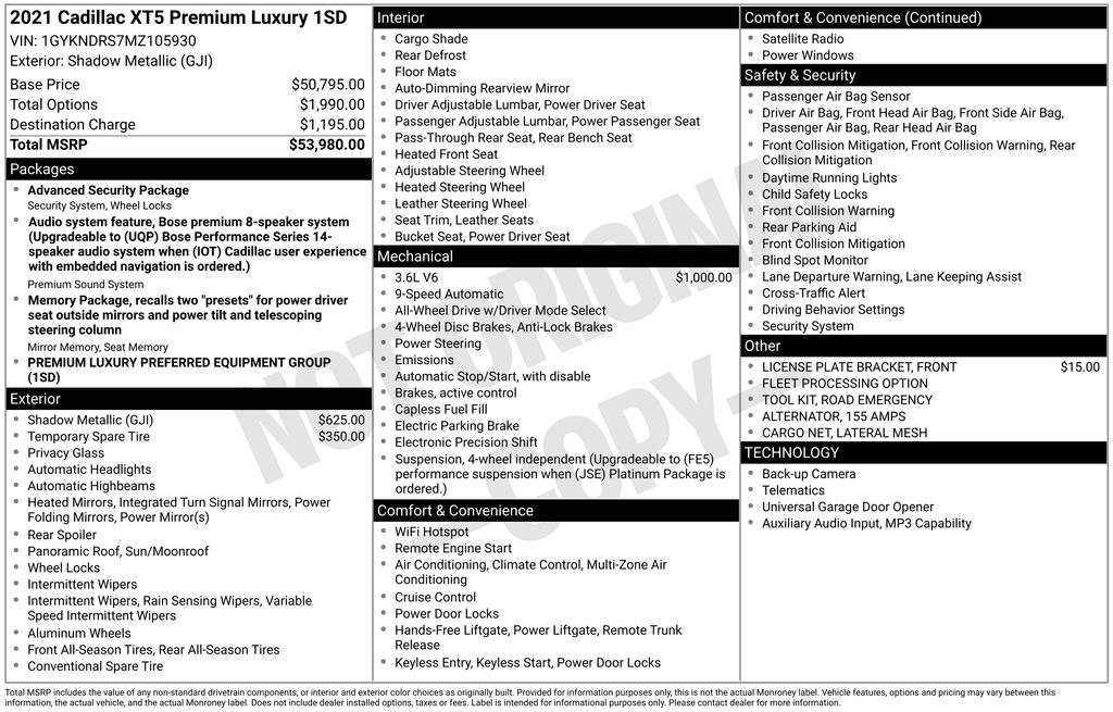 2021 Cadillac XT5 Premium Luxury Shadow Metallic Premium Luxury AWD 9-Speed Automatic 3.6L V6 DI VVT 155 Amp Alternator, 2-Way Power Driver Lumbar Control Seat Adjuster, 2-Way Power Passenger Lumbar Control Seat Adjuster, 3.47 Axle Ratio, 4-Wheel Disc Brakes, 4-Wheel Independent Suspension, 8 Speakers, ABS brakes, Air Conditioning, Alloy wheels, AM/FM radio: SiriusXM, Apple CarPlay/Android Auto, Audio memory, Auto High-beam Headlights, Auto-dimming door mirrors, Auto-dimming Rear-View mirror, Automatic Dual-Zone Climate Control, Automatic Emergency Braking, Automatic Stop/Start w/Disable, Automatic temperature control, Bodyside moldings, Bose Premium 8-Speaker Audio System Feature, Brake assist, Bumpers: body-color, Compass, Delay-off headlights, Driver door bin, Driver vanity mirror, Dual Driver Info Center Display Gauge Cluster, Dual front impact airbags, Dual front side impact airbags, Electronic Stability Control, Emergency communication system: OnStar and Cadillac connected services capable, Exterior Parking Camera Rear, Four wheel independent suspension, Front & Rear Park Assist, Front anti-roll bar, Front Bucket Seats, Front Center Armrest, Front dual zone A/C, Front License Plate Bracket, Front reading lights, Fully automatic headlights, Garage door transmitter, HD Rear Vision Camera, Heated door mirrors, Heated Driver & Front Passenger Seats, Heated front seats, Heated steering wheel, Illuminated entry, Inside Rear-View Auto-Dimming Mirror, Knee airbag, Lateral Mesh Cargo Net, Leather Seating Surfaces w/Mini Perforated Inserts, Leather steering wheel, Low tire pressure warning, Memory seat, Occupant sensing airbag, Outside temperature display, Overhead airbag, Overhead console, Panic alarm, Passenger door bin, Passenger vanity mirror, Power door mirrors, Power driver seat, Power Liftgate, Power moonroof: UltraView, Power passenger seat, Power steering, Power windows, Premium Luxury Package 1SD, Radio data system, Radio: Cadillac User Experience AM/FM Stereo, Rain sensing wipers, Rear anti-roll bar, Rear reading lights, Rear seat center armrest, Rear window defroster, Rear window wiper, Remote keyless entry, Road Emergency Tool Kit, Security system, SiriusXM w/360L, Speed control, Speed-sensing steering, Split folding rear seat, Spoiler, Steering wheel memory, Steering wheel mounted audio controls, Tachometer, Teen Driver, Telescoping steering wheel, Tilt steering wheel, Traction control, Trip computer, Turn signal indicator mirrors, Variably intermittent wipers, Voltmeter, Wheels: 18" 6-Split Spoke Alloy.
