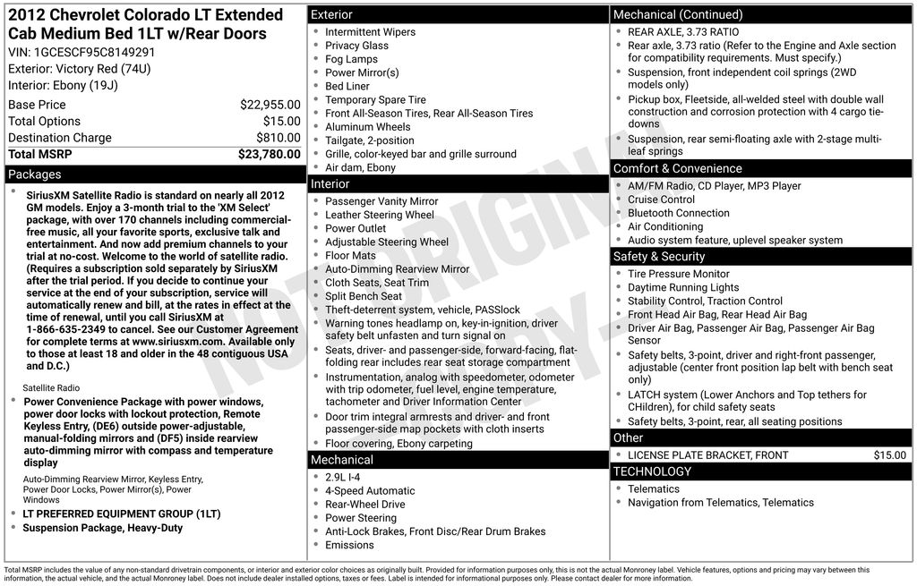 2012 Chevrolet Colorado 1LT Victory Red 1LT RWD 4-Speed Automatic with Overdrive 2.9L 4-Cylinder SFI DOHC 16" x 6" Aluminum Wheels, 3.73 Rear Axle Ratio, 6 Speakers, ABS brakes, Air Conditioning, Alloy wheels, AM/FM radio: SiriusXM, AM/FM Stereo w/CD/MP3 Player, Auto-dimming Rear-View mirror, Body-Color Power-Adjustable Outside Mirrors, CD player, Compass, Compass & Outside Temperature Display, Deluxe Cloth Seat Trim, Driver door bin, Dual front impact airbags, Electronic Stability Control, Emergency communication system: OnStar Directions & Connections, Front 60/40 Split-Bench Seat, Front anti-roll bar, Front Center Armrest w/Storage, Front fog lights, Front License Plate Bracket, Front reading lights, Front wheel independent suspension, Fully automatic headlights, Heavy-Duty Suspension Package, Illuminated entry, Inside Rear-View Auto-Dimming Mirror, LATCH System, Leather steering wheel, Low tire pressure warning, Occupant sensing airbag, Outside temperature display, Overhead airbag, Panic alarm, Passenger door bin, Passenger vanity mirror, Power Convenience Package, Power Door Locks w/Lockout Protection, Power door mirrors, Power steering, Power Windows, Power windows, Preferred Equipment Group 1LT, Radio data system, Rear All Seating Positions 3-Point Safety Belts, Rear Forward-Facing Driver & Passenger Side Seats, Rear step bumper, Remote Keyless Entry, Remote keyless entry, Security system, SIRIUSXM Satellite Radio, Solar-Ray Deep-Tinted Glass, Speed control, Tachometer, Tilt steering wheel, Traction control, Variably intermittent wipers.