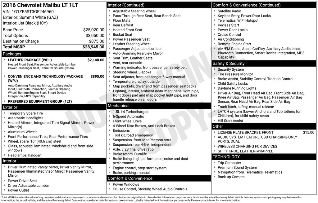 2016 Chevrolet Malibu LT 1LT Summit White LT 1LT FWD 6-Speed Automatic 1.5L DOHC Black Leather, 120-Volt Power Outlet, 17" Aluminum Wheels, 3-Spoke Leather-Wrapped Steering Wheel, 4-Wheel Disc Brakes, 6 Speakers, 6-Way Power Front Passenger Seat Adjuster, 8-Way Power Driver Seat Adjuster, ABS brakes, Air Conditioning, Alloy wheels, AM/FM radio: SiriusXM, AM/FM Stereo w/Seek & Scan/Digital Clock, Apple CarPlay/Android Auto, Bose Premium 9-Speaker System, Brake assist, Bumpers: body-color, Compass, Convenience & Technology Package, Delay-off headlights, Driver door bin, Driver Information System w/Color Display, Driver vanity mirror, Dual front impact airbags, Dual front side impact airbags, Electronic Stability Control, Emergency communication system: OnStar, Exterior Parking Camera Rear, Four wheel independent suspension, Front anti-roll bar, Front Bucket Seats, Front Center Armrest w/Storage, Front License Plate Bracket, Front Passenger 6-Way Manual Seat Adjuster, Front Passenger Power Lumbar Seat Adjuster, Front reading lights, Fully automatic headlights, Heated door mirrors, Heated Driver & Front Passenger Seats, Illuminated entry, Inside Rear-View Auto-Dimming Mirror, Knee airbag, Leather Appointed Seat Trim, Leather Package, Leather Wrapped Shift Knob, Low tire pressure warning, Occupant sensing airbag, Outside temperature display, Overhead airbag, Overhead console, Panic alarm, Passenger door bin, Passenger vanity mirror, Power door mirrors, Power Driver Lumbar Control Seat Adjuster, Power driver seat, Power steering, Power windows, Preferred Equipment Group 1LT, Premium Cloth Seat Trim, Radio data system, Radio: AM/FM Stereo w/Seek-and-Scan/Digital Clock, Rear anti-roll bar, Rear reading lights, Rear seat center armrest, Rear side impact airbag, Rear window defroster, Remote keyless entry, Remote Vehicle Starter System, Security system, SiriusXM Satellite Radio, Speed control, Split folding rear seat, Steering wheel mounted audio controls, Tachometer, Teen Driver, Telescoping steering wheel, Tilt steering wheel, Traction control, Trip computer, Turn signal indicator mirrors, USB Charging Port in Console, Variably intermittent wipers, Wireless Charging For Devices, Black Leather.