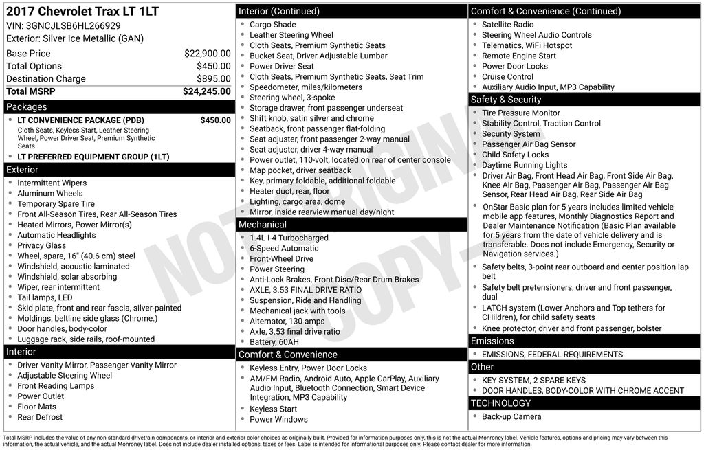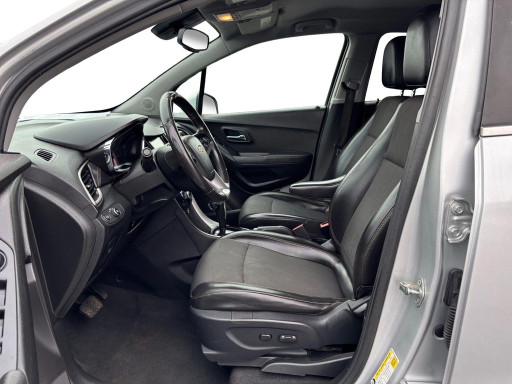 2017 Chevrolet Trax LT Silver Ice Metallic LT FWD 6-Speed Automatic ECOTEC 1.4L I4 SMPI DOHC Turbocharged VVT 16" Aluminum Wheels, 2 Spare Keys Key System, 2 USB Ports w/Auxiliary Input Jack, 2-Way Manual Front Passenger Seat Adjuster, 3-Spoke Leather-Wrapped Steering Wheel, 3.53 Final Drive Axle Ratio, 4-Way Manual Driver Seat Adjuster, 6 Speakers, 6-Speaker Audio System Feature, 6-Way Power Driver Seat Adjuster, ABS brakes, Air Conditioning, Alloy wheels, AM/FM radio: SiriusXM, Apple CarPlay/Android Auto, Body-Color Door Handles w/Chrome Accent, Brake assist, Bumpers: body-color, Compass, Delay-off headlights, Deluxe Cloth Seat Trim, Deluxe Cloth/Leatherette Seat Trim, Driver door bin, Driver vanity mirror, Driver's Seat Mounted Armrest, Dual front impact airbags, Dual front side impact airbags, Electronic Stability Control, Emergency communication system: OnStar Guidance, Exterior Parking Camera Rear, Front anti-roll bar, Front Bucket Seats, Front Bucket Seats w/Driver Power Lumbar, Front reading lights, Front wheel independent suspension, Fully automatic headlights, Heated door mirrors, Illuminated entry, Keyless Open, Keyless Start, Knee airbag, Low tire pressure warning, LT Convenience Package, Occupant sensing airbag, Outside temperature display, Overhead airbag, Panic alarm, Passenger door bin, Passenger vanity mirror, Power door mirrors, Power steering, Power windows, Preferred Equipment Group 1LT, Premium audio system: Chevrolet MyLink, Radio data system, Radio: Chevrolet MyLink Audio System, Rear seat center armrest, Rear side impact airbag, Rear window defroster, Rear window wiper, Remote keyless entry, Roof rack: rails only, Security system, SiriusXM Satellite Radio, Speed control, Speed-sensing steering, Split folding rear seat, Spoiler, Steering wheel mounted audio controls, Tachometer, Telescoping steering wheel, Tilt steering wheel, Traction control, Trip computer, Variably intermittent wipers.