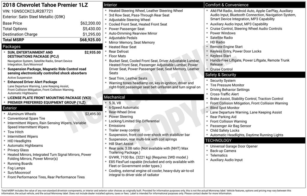 2018 Chevrolet Tahoe Premier Satin Steel Metallic Premier RWD 6-Speed Automatic Electronic with Overdrive EcoTec3 5.3L V8 Jet Black Leather, 10 Speakers, 1st & 2nd Row Color-Keyed Carpeted Floor Mats, 3.08 Rear Axle Ratio, 3rd Row 60/40 Power Fold Split-Bench, 3rd row seats: split-bench, 4-Wheel Antilock Disc Brakes w/Brake Assist, 4-Wheel Disc Brakes, 5 12-Volt Auxiliary Power Outlets, ABS brakes, Adaptive suspension, Adjustable pedals, Air Conditioning, Alloy wheels, AM/FM radio: SiriusXM, Apple CarPlay/Android Auto, Auto High-beam Headlights, Auto-dimming door mirrors, Auto-Dimming Inside Rear-View Mirror, Auto-dimming Rear-View mirror, Automatic temperature control, Black Assist Steps w/Chrome Accent Strip, Bluetooth® For Phone, Bodyside moldings, Bose Centerpoint Premium 10-Speaker Surround Sound, Brake assist, Bumpers: body-color, Cargo Net, CD player, Color-Keyed Carpeting Floor Covering, Compass, Delay-off headlights, Driver door bin, Driver Inboard & Front Passenger Airbags, Driver vanity mirror, Dual front impact airbags, Dual front side impact airbags, Electronic Cruise Control w/Set & Resume Speed, Electronic Stability Control, Emergency communication system: OnStar Guidance, Enhanced Driver Alert Package (Y86), Exterior Parking Camera Rear, Floor Console, Fog Lamps, Forward Collision Alert, Front & Rear Park Assist, Front anti-roll bar, Front Bucket Seats, Front Center Armrest, Front dual zone A/C, Front fog lights, Front Heated Reclining Bucket Seats, Front Passenger 6-Way Power Seat Adjuster, Front reading lights, Front wheel independent suspension, Fully automatic headlights, Garage door transmitter, Hands Free Power Liftgate, HD Radio, Heated & Ventilated Driver & Front Passenger Seats, Heated 2nd Row Seats, Heated door mirrors, Heated front seats, Heated Leather Wrapped Steering Wheel, Heated rear seats, Heated steering wheel, High-Intensity Discharge Headlights, Illuminated entry, IntelliBeam Headlamps, Lane Change Alert w/Side Blind Zone Alert, Lane Keep Assist w/Lane Departure Warning, License Plate Front Mounting Package, Low Speed Forward Automatic Braking, Low tire pressure warning, Magnetic Ride Control Suspension Package, Memory seat, Memory Settings, Navigation System, Occupant sensing airbag, OnStar Basic Plan For 5 Years, Outside temperature display, Overhead airbag, Overhead console, Panic alarm, Passenger door bin, Passenger vanity mirror, Passive Entry System, Pedal memory, Perforated Leather-Appointed Seat Trim, Power door mirrors, Power driver seat, Power Liftgate, Power passenger seat, Power Release 2nd Row Bucket Seats, Power steering, Power Sunroof, Power Tilt & Telescopic Steering Column, Power windows, Power-Adjustable Accelerator & Brake Pedals, Power-Folding Heated Outside Mirrors, Preferred Equipment Group 1LZ, Premium audio system: Chevrolet MyLink, Push Button Keyless Start, Radio: Chevrolet MyLink w/Nav/AM/FM Stereo, Rain sensing wipers, Rear air conditioning, Rear anti-roll bar, Rear Cross-Traffic Alert, Rear reading lights, Rear Seat Blu-Ray/DVD Entertainment System, Rear window defroster, Rear window wiper, Remote Keyless Entry, Remote keyless entry, Remote Vehicle Start, Roof rack: rails only, Roof-Mounted Luggage Rack Side Rails, Security system, Single-Slot CD/MP3 Player, SiriusXM NavTraffic, SiriusXM Satellite Radio, Speed control, Speed-sensing steering, Split folding rear seat, Spoiler, Steering wheel memory, Steering wheel mounted audio controls, Sun, Entertainment & Destinations Package, Tachometer, Telescoping steering wheel, Tilt steering wheel, Traction control, Trip computer, Turn signal indicator mirrors, Universal Home Remote, Variably intermittent wipers, Ventilated front seats, Voltmeter, Wheels: 20" x 9" Polished-Aluminum, Wheels: 22" Premium Painted w/Chrome Inserts, Wireless Charging, Jet Black Leather.