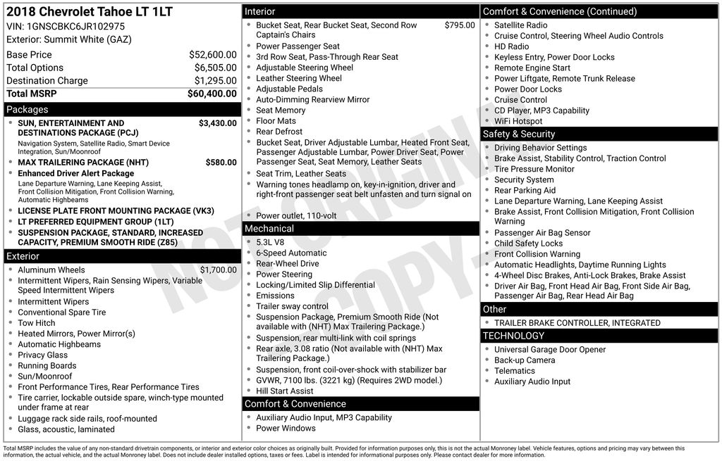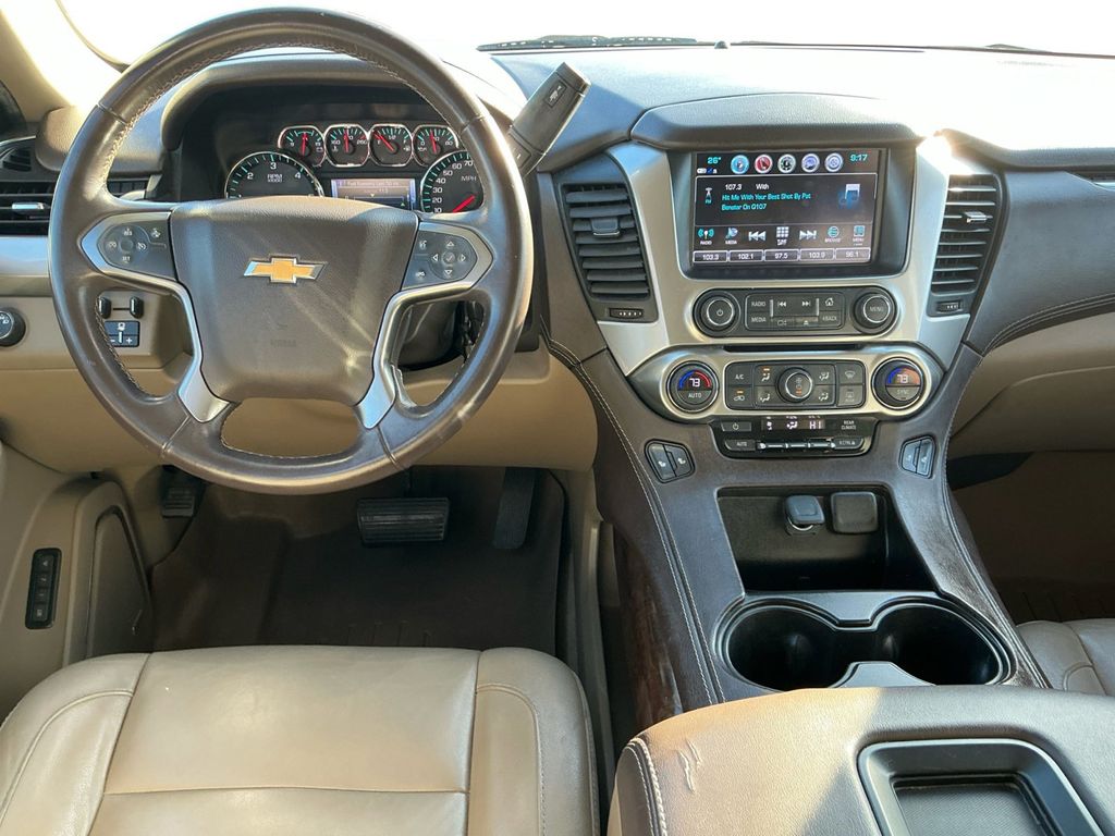 2018 Chevrolet Tahoe LT Summit White LT RWD 6-Speed Automatic Electronic with Overdrive EcoTec3 5.3L V8 Cocoa/Dune Leather, 18" x 8.5" Aluminum Wheels, 1st & 2nd Row Color-Keyed Carpeted Floor Mats, 2nd Row 60/40 Split-Folding Manual Bench, 2nd Row Manual Bucket Seats, 3rd Row Manual 60/40 Split-Folding Fold Flat Bench, 3rd row seats: split-bench, 4-Wheel Antilock Disc Brakes w/Brake Assist, 4-Wheel Disc Brakes, 5 12-Volt Auxiliary Power Outlets, 9 Speakers, ABS brakes, Adjustable pedals, Air Conditioning, Alloy wheels, AM/FM radio: SiriusXM, Apple CarPlay/Android Auto, Auto High-beam Headlights, Auto-Dimming Inside Rear-View Mirror, Auto-dimming Rear-View mirror, Automatic temperature control, Black Assist Steps, Bluetooth® For Phone, Bose Premium 9-Speaker System, Brake assist, Bumpers: body-color, Cargo Net, CD player, Color-Keyed Carpeting Floor Covering, Compass, Delay-off headlights, Driver door bin, Driver Inboard & Front Passenger Airbags, Driver vanity mirror, Dual front impact airbags, Dual front side impact airbags, Electronic Cruise Control w/Set & Resume Speed, Electronic Stability Control, Emergency communication system: OnStar Guidance, Enhanced Driver Alert Package (Y86), Extended-Range Remote Keyless Entry, Exterior Parking Camera Rear, Floor Console, Forward Collision Alert, Front anti-roll bar, Front Bucket Seats, Front Center Armrest, Front dual zone A/C, Front Heated Reclining Bucket Seats, Front Passenger 6-Way Power Seat Adjuster, Front reading lights, Front wheel independent suspension, Fully automatic headlights, Garage door transmitter, HD Radio, Heated door mirrors, Heated front seats, Illuminated entry, Integrated Trailer Brake Controller, IntelliBeam Headlamps, Lane Keep Assist w/Lane Departure Warning, Leather-Appointed Seat Trim, Leather-Wrapped Steering Wheel, License Plate Front Mounting Package, Low Speed Forward Automatic Braking, Low tire pressure warning, Max Trailering Package, Memory seat, Memory Settings, Occupant sensing airbag, OnStar Basic Plan For 5 Years, Outside temperature display, Overhead airbag, Overhead console, Panic alarm, Passenger door bin, Passenger vanity mirror, Pedal memory, Power door mirrors, Power driver seat, Power Liftgate, Power passenger seat, Power steering, Power Sunroof, Power windows, Power-Adjustable Accelerator & Brake Pedals, Preferred Equipment Group 1LT, Premium audio system: Chevrolet MyLink, Premium Smooth Ride Suspension Package, Radio: Chevrolet MyLink AM/FM Stereo, Radio: Chevrolet MyLink w/Nav/AM/FM Stereo, Rain sensing wipers, Rear air conditioning, Rear anti-roll bar, Rear Park Assist w/Audible Warning, Rear reading lights, Rear Seat Blu-Ray/DVD Entertainment System, Rear seat center armrest, Rear window defroster, Rear window wiper, Remote keyless entry, Remote Vehicle Start, Roof rack: rails only, Roof-Mounted Luggage Rack Side Rails, Security system, Single-Slot CD/MP3 Player, SiriusXM NavTraffic, SiriusXM Satellite Radio, Speed control, Speed-sensing steering, Split folding rear seat, Spoiler, Standard Suspension Package, Steering wheel mounted audio controls, Sun, Entertainment & Destinations Package, Tachometer, Telescoping steering wheel, Tilt steering wheel, Traction control, Trip computer, Universal Home Remote, Variably intermittent wipers, Voltmeter, Wheels: 20" x 9" Polished-Aluminum, Cocoa/Dune Leather.