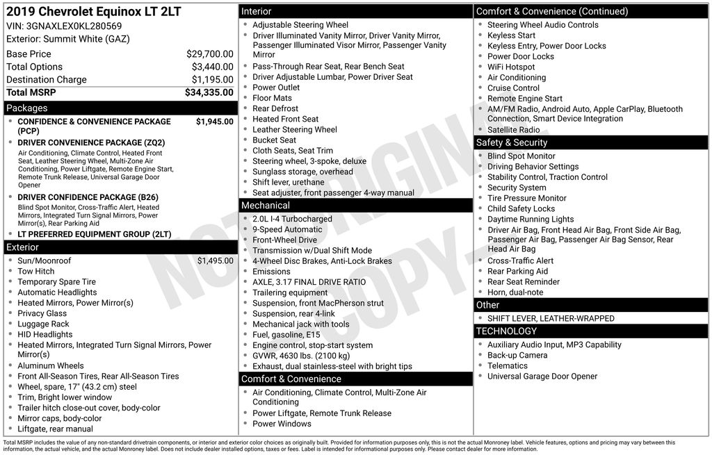 2019 Chevrolet Equinox LT Summit White LT FWD 9-Speed Automatic with Overdrive 2.0L Turbocharged 18" Aluminum Wheels, 2 Rear USB Charging-Only Ports, 2 USB Ports & Auxiliary Input Jack, 2-Way Power Driver Lumbar Control Seat Adjuster, 3-Spoke Leather-Wrapped Steering Wheel, 3.17 Final Drive Axle Ratio, 4-Wheel Antilock 4-Wheel Disc Brakes, 4-Wheel Disc Brakes, 6 Speaker Audio System Feature, 6 Speakers, 8-Way Power Driver Seat Adjuster, ABS brakes, Air Conditioning, Alloy wheels, AM/FM radio: SiriusXM, Apple CarPlay/Android Auto, Bluetooth® For Phone, Body-Color Trailer Hitch Close-Out Cover, Brake assist, Bumpers: body-color, Compass, Confidence & Convenience Package, Delay-off headlights, Driver Confidence Package, Driver Convenience Package, Driver door bin, Driver vanity mirror, Dual front impact airbags, Dual front side impact airbags, Dual Stainless-Steel Exhaust w/Bright Tips, Dual Zone Automatic Climate Control, Electronic Stability Control, Emergency communication system: OnStar and Chevrolet connected services capable, Factory Installed Trailer Hitch, Four wheel independent suspension, Front anti-roll bar, Front Bucket Seats, Front Center Armrest, Front Passenger 4-Way Manual Seat Adjuster, Front reading lights, Fully automatic headlights, Heated door mirrors, Heated Driver & Front Passenger Seats, High-Intensity Discharge Headlights, Illuminated entry, Lane Change Alert w/Side Blind Zone Alert, Leather-Wrapped Shift Lever, Low tire pressure warning, Occupant sensing airbag, Outside Heated Power-Adjustable Mirrors, Outside temperature display, Overhead airbag, Overhead console, Panic alarm, Passenger door bin, Passenger vanity mirror, Power door mirrors, Power driver seat, Power steering, Power Sunroof, Power windows, Preferred Equipment Group 2LT, Premium audio system: Chevrolet MyLink, Premium Cloth Seat Trim, Radio data system, Radio: Chevrolet Infotainment 3 System w/AM/FM, Rear anti-roll bar, Rear Cross Traffic Alert, Rear Park Assist w/Audible Warning, Rear Power Liftgate, Rear reading lights, Rear seat center armrest, Rear window defroster, Rear window wiper, Remote keyless entry, Remote Vehicle Starter System, Roof rack: rails only, Security system, SiriusXM Radio, Speed control, Speed-sensing steering, Split folding rear seat, Spoiler, Steering wheel mounted audio controls, Tachometer, Telescoping steering wheel, Tilt steering wheel, Traction control, Trailering Equipment, Trip computer, Universal Home Remote, Variably intermittent wipers.