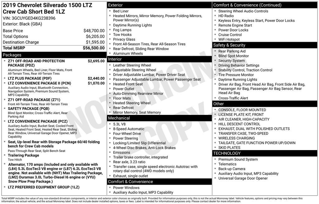2019 Chevrolet Silverado 1500 LTZ Black LTZ 4WD 8-Speed Automatic EcoTec3 5.3L V8 8-Speed Automatic, 4WD, Jet Black Leather, 10-Way Power Driver Seat w/Lumbar, 10-Way Power Passenger Seat Adjuster w/Lumbar, 12-Volt Rear Auxiliary Power Outlet, 120-Volt Bed Mounted Power Outlet, 120-Volt Instrument Panel Power Outlet, 170 Amp Alternator, 2 USB Ports (First Row), 2nd Row Heated Outboard Seats, 3.23 Rear Axle Ratio, 4-Wheel Disc Brakes, 4.2" Diagonal Color Display Driver Info Center, 40/20/40 Front Split-Bench Seat, 6 Speakers, 6-Speaker Audio System, ABS brakes, Advanced Trailering System, Air Conditioning, All-Weather Floor Liner (LPO) (AAK), Alloy wheels, AM/FM radio: SiriusXM, Apple CarPlay/Android Auto, Auto-dimming door mirrors, Auto-Dimming Inside Rear-View Mirror, Auto-dimming Rear-View mirror, Automatic temperature control, Auxiliary External Transmission Oil Cooler, Bluetooth® For Phone, Brake assist, Bumpers: chrome, Chevrolet Connected Access, Chevrolet w/4G LTE, Chevytec Spray-On Black Bedliner, Chrome Grille, Chrome Mirror Caps, Color-Keyed Carpeting Floor Covering, Compass, Deep-Tinted Glass, Delay-off headlights, Driver door bin, Driver Memory, Driver vanity mirror, Dual Exhaust w/Polished Outlets, Dual front impact airbags, Dual front side impact airbags, Electric Rear-Window Defogger, Electrical Lock Control Steering Column, Electronic Cruise Control, Electronic Stability Control, EZ Lift Power Lock & Release Tailgate, Floor Mounted Console, Front anti-roll bar, Front Bucket Seats, Front Center Armrest w/Storage, Front dual zone A/C, Front fog lights, Front Frame-Mounted Black Recovery Hooks, Front LED Fog Lamps, Front License Plate Kit, Front reading lights, Front Rubberized Vinyl Floor Mats, Front wheel independent suspension, Fully automatic headlights, HD Radio, HD Rear Vision Camera, Heated door mirrors, Heated Driver & Front Passenger Seats, Heated front seats, Heated Steering Wheel, Heated steering wheel, Heavy Duty Suspension, Heavy-Duty Rear Locking Differential, High Capacity Air Filter, Hill Descent Control, Hitch Guidance, Hitch Guidance w/Hitch View, Illuminated entry, Integrated Trailer Brake Controller, Keyless Open & Start, Lane Change Alert w/Side Blind Zone Alert, Leather Wrapped Steering Wheel, LED Cargo Area Lighting, Low tire pressure warning, LTZ Convenience Package, LTZ Convenience Package II, LTZ Plus Package, Manual Tilt/Telescoping Steering Column, Memory seat, Occupant sensing airbag, Off-Road Suspension, OnStar & Chevrolet Connected Services Capable, Outside Heated Power-Adjustable Mirrors, Outside temperature display, Overhead airbag, Overhead console, Panic alarm, Passenger door bin, Passenger vanity mirror, Perforated Leather Appointed Seat Trim, Perimeter Lighting, Power Door Locks, Power door mirrors, Power driver seat, Power Front Passenger Windows w/Express Up/Down, Power Front Windows w/Driver Express Up/Down, Power passenger seat, Power Rear Windows w/Express Down, Power Sliding Rear Window w/Rear Defogger, Power steering, Power Tailgate, Power windows, Preferred Equipment Group 1LZ, Premium audio system: Chevrolet Infotainment System 3, Premium Bose 7-Speaker Sound System, Radio data system, Radio: Chevrolet Infotainment 3 Plus System, Radio: Chevrolet Infotainment 3 Premium System, Rear Cross Traffic Alert, Rear Dual USB Charging-Only Ports, Rear reading lights, Rear Rubberized-Vinyl Floor Mats, Rear seat center armrest, Rear step bumper, Rear Wheelhouse Liners, Rear window defroster, Remote keyless entry, Remote Vehicle Starter System, Safety Package, Security system, SiriusXM Radio, Speed control, Speed-sensing steering, Split folding rear seat, Steering Wheel Audio Controls, Steering wheel mounted audio controls, Tachometer, Telescoping steering wheel, Theft Deterrent System (Unauthorized Entry), Tilt steering wheel, Traction control, Trailer Tire Pressure Monitor System, Trailering Package, Trip computer, Ultrasonic Front & Rear Park Assist, Universal Home Remote, Up-L