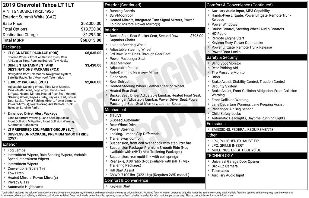 2019 Chevrolet Tahoe LT Summit White LT RWD 6-Speed Automatic Electronic with Overdrive EcoTec3 5.3L V8 Black Leather, 18" x 8.5" Aluminum Wheels, 1st & 2nd Row Color-Keyed Carpeted Floor Mats, 2nd Row 60/40 Split-Folding Manual Bench, 2nd Row Pwr Release 60/40 Split Folding Bench Seat, 3.08 Rear Axle Ratio, 3rd Row 60/40 Power Fold Split-Bench, 3rd Row Manual 60/40 Split-Folding Fold Flat Bench, 3rd row seats: split-bench, 4-Wheel Antilock Disc Brakes w/Brake Assist, 4-Wheel Disc Brakes, 5 12-Volt Auxiliary Power Outlets, 9 Speakers, ABS brakes, Adjustable pedals, Air Conditioning, Alloy wheels, AM/FM radio: SiriusXM, Apple CarPlay/Android Auto, Auto High-beam Headlights, Auto-Dimming Inside Rear-View Mirror, Auto-dimming Rear-View mirror, Automatic temperature control, Black Assist Steps, Bluetooth® For Phone, Bose Premium 9-Speaker System, Brake assist, Bright Bodyside Moldings, Bumpers: body-color, Cargo Net, CD player, Chrome Assist Step Kit (LPO), Chrome Recovery Hooks, Color-Keyed Carpeting Floor Covering, Compass, Delay-off headlights, Driver door bin, Driver Inboard & Front Passenger Airbags, Driver vanity mirror, Dual front impact airbags, Dual front side impact airbags, Electronic Cruise Control w/Set & Resume Speed, Electronic Stability Control, Emergency communication system: OnStar and Chevrolet connected services capable, Enhanced Driver Alert Package (Y86), Extended-Range Remote Keyless Entry, Exterior Parking Camera Rear, Floor Console, Fog Lamps, Forward Collision Alert, Front & Rear Park Assist, Front anti-roll bar, Front Bucket Seats, Front Center Armrest, Front dual zone A/C, Front Heated Reclining Bucket Seats, Front Passenger 6-Way Power Seat Adjuster, Front reading lights, Front wheel independent suspension, Fully automatic headlights, Garage door transmitter, Grille Insert (LPO), Hands Free Power Liftgate, HD Radio, Heated 2nd Row Seats, Heated door mirrors, Heated front seats, Heated Leather Wrapped Steering Wheel, Illuminated entry, IntelliBeam Headlamps, Lane Change Alert w/Side Blind Zone Alert, Lane Keep Assist w/Lane Departure Warning, Leather-Appointed Seat Trim, Leather-Wrapped Steering Wheel, Low Speed Forward Automatic Braking, Low tire pressure warning, LT Signature Package, Luxury Package, Memory seat, Memory Settings, Occupant sensing airbag, Outside temperature display, Overhead airbag, Overhead console, Panic alarm, Passenger door bin, Passenger vanity mirror, Passive Entry System, Pedal memory, Polished Exhaust Tip, Power door mirrors, Power driver seat, Power Liftgate, Power passenger seat, Power Release 2nd Row Bucket Seats, Power steering, Power Sunroof, Power Tilt & Telescopic Steering Column w/Memory, Power windows, Power-Adjustable Accelerator & Brake Pedals, Power-Folding Heated Outside Mirrors, Preferred Equipment Group 1LT, Premium audio system: Chevrolet MyLink, Premium Smooth Ride Suspension Package, Push Button Keyless Start, Radio: Chevrolet Infotainment AM/FM Stereo, Radio: Chevrolet Infotainment AM/FM Stereo w/Nav, Rain sensing wipers, Rear air conditioning, Rear anti-roll bar, Rear Cross Traffic Alert, Rear Park Assist w/Audible Warning, Rear reading lights, Rear Seat Blu-Ray/DVD Entertainment System, Rear seat center armrest, Rear window defroster, Rear window wiper, Remote keyless entry, Remote Vehicle Start, Roof rack: rails only, Roof-Mounted Luggage Rack Side Rails, Security system, Single-Slot CD/MP3 Player, SiriusXM NavTraffic, SiriusXM Radio, Speed control, Speed-sensing steering, Split folding rear seat, Spoiler, Steering wheel mounted audio controls, Sun, Entertainment & Destinations Package, Tachometer, Telescoping steering wheel, Tilt steering wheel, Traction control, Trip computer, Universal Home Remote, Variably intermittent wipers, Voltmeter, Wheels: 20" x 9" Chrome, Black Leather.