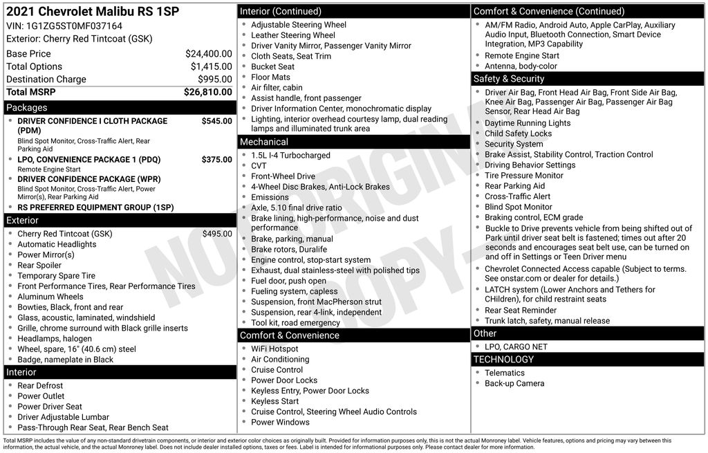 2021 Chevrolet Malibu RS Cherry Red Tintcoat RS FWD CVT 1.5L DOHC Jet Black Cloth, 18" Aluminum Wheels, 4-Wheel Disc Brakes, 6 Speakers, 6-Speaker Audio System Feature, 6-Way Manual Front Passenger Seat Adjuster, 8-Way Power Driver Seat Adjuster, ABS brakes, Air Conditioning, Alloy wheels, AM/FM radio, Brake assist, Bumpers: body-color, Cargo Net, Compass, Convenience Package 1 (LPO), Delay-off headlights, Driver Confidence I Cloth Package, Driver door bin, Driver vanity mirror, Dual front impact airbags, Dual front side impact airbags, Electronic Stability Control, Emergency communication system: OnStar and Chevrolet connected services capable, Exterior Parking Camera Rear, Four wheel independent suspension, Front anti-roll bar, Front Bucket Seats, Front Center Armrest, Front reading lights, Fully automatic headlights, Illuminated entry, Knee airbag, Lane Change Alert w/Side Blind Zone Alert, Low tire pressure warning, Occupant sensing airbag, Outside temperature display, Overhead airbag, Overhead console, Panic alarm, Passenger door bin, Passenger vanity mirror, Power door mirrors, Power Driver Lumbar Control Seat Adjuster, Power driver seat, Power steering, Power windows, Preferred Equipment Group 1SP, Premium audio system: Chevrolet Infotainment 3, Premium Cloth Seat Trim, Radio data system, Radio: Chevrolet Infotainment 3 System, Rear anti-roll bar, Rear Cross Traffic Alert, Rear Park Assist, Rear side impact airbag, Rear window defroster, Remote keyless entry, Remote Start Kit (LPO), Security system, Speed control, Split folding rear seat, Spoiler, Steering wheel mounted audio controls, Tachometer, Telescoping steering wheel, Tilt steering wheel, Traction control, Trip computer, Variably intermittent wipers, Voltmeter, Wireless Apple CarPlay/Android Auto, Wireless Apple CarPlay/Wireless Android Auto, Jet Black Cloth.