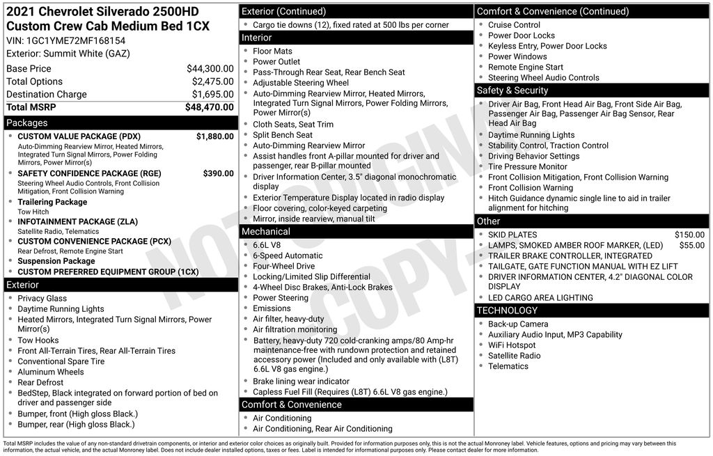 2021 Chevrolet Silverado 2500HD Custom Summit White Custom 4WD 6-Speed Automatic 6.6L V8 6-Speed Automatic, 4WD, Black Cloth, 170 Amp Alternator, 2-Speed Electronic Shift Transfer Case, 3.5" Diagonal Monochromatic Display DIC, 3.73 Rear Axle Ratio, 4-Wheel Disc Brakes, 4.2" Diagonal Color Display DIC, 4G LTE Wi-Fi Hotspot Capable, 6 Speakers, 6-Speaker Audio System, 720 Cold-Cranking Amps Heavy-Duty Battery, ABS brakes, Air Conditioning, Alloy wheels, AM/FM radio, Apple CarPlay/Android Auto, Auto-Dimming Inside Rear-View Mirror, Automatic Emergency Braking, Black Mirror Caps, Bluetooth® For Phone, Body Color Front Grille, Brake assist, Cloth Seat Trim, Color-Keyed Carpeting Floor Covering, Custom Convenience Package, Custom Value Package, Deep-Tinted Glass, Delay-off headlights, Driver door bin, Dual front impact airbags, Dual front side impact airbags, Electric Rear-Window Defogger, Electronic Cruise Control w/Set & Resume Speed, Electronic Stability Control, Forward Collision Alert, Front 40/20/40 Split-Bench Seat w/Storage, Front anti-roll bar, Front Center Armrest w/Storage, Front reading lights, Front Rubberized Vinyl Floor Mats, Front wheel independent suspension, Fully automatic headlights, Heated & Auto-Dimming Vertical Trailering Mirrors, Heated door mirrors, Heated Vertical Trailering Mirrors, Illuminated entry, Infotainment Package, Integrated Trailer Brake Controller, LED Cargo Area Lighting, LED Smoked Amber Roof Marker Lamps, Locking Tailgate, Low tire pressure warning, Manual Tailgate Function w/EZ Lift, Manual Tailgate Function w/No EZ Lift, Manual Tilt-Wheel Steering Column, Occupant sensing airbag, OnStar & Chevrolet Connected Services Capable, Outside temperature display, Overhead airbag, Overhead console, Panic alarm, Passenger door bin, Passenger vanity mirror, Power Door Locks, Power door mirrors, Power Front Windows w/Driver Express Up/Down, Power Front Windows w/Passenger Express Down, Power Rear Windows w/Express Down, Power steering, Power windows, Preferred Equipment Group 1CX, Premium audio system: Chevrolet Infotainment 3, Radio: Chevrolet Infotainment 3 System, Rear 60/40 Folding Bench Seat (Folds Up), Rear reading lights, Rear Rubberized Vinyl Floor Mats, Rear step bumper, Remote Keyless Entry, Remote keyless entry, Remote Vehicle Starter System, Safety Confidence Package, SiriusXM Radio, Speed control, Split folding rear seat, Steering Wheel Audio Controls, Suspension Package, Tachometer, Tilt steering wheel, Traction control, Trip computer, Turn signal indicator mirrors, Variably intermittent wipers, Voltmeter, Wheels: 20" 10-Spoke Machined Aluminum, 6-Speed Automatic, 4WD, Black Cloth.