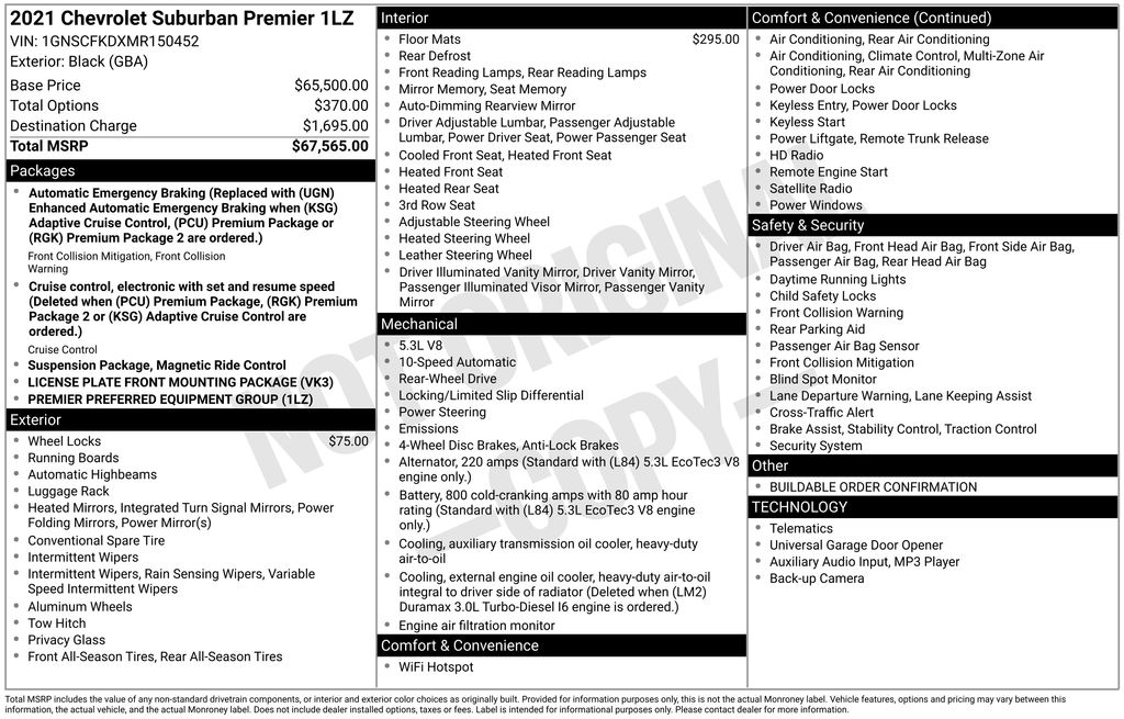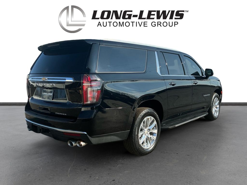 2021 Chevrolet Suburban Premier Black Premier RWD 10-Speed Automatic with Overdrive EcoTec3 5.3L V8 10 Speakers, 12-Way Power Driver & Passenger Seat Adjusters, 1st & 2nd Row Color-Keyed Carpeted Floor Mats, 1st, 2nd & 3rd Row All-Weather Floor Liners (LPO), 2 USB Data Ports, 20" x 9" Polished Aluminum Wheels, 3.23 Rear Axle Ratio, 3rd Row 60/40 Power-Folding Split-Bench, 3rd row seats: split-bench, 4-Wheel Disc Brakes, ABS brakes, Adaptive suspension, Air Conditioning, Alloy wheels, AM/FM radio: SiriusXM with 360L, Apple CarPlay/Android Auto, Auto High-beam Headlights, Auto-dimming door mirrors, Auto-Dimming Inside Rear-View Mirror, Auto-dimming Rear-View mirror, Auto-leveling suspension, Automatic Heated Steering Wheel, Automatic temperature control, Bose 10-Speaker Surround w/CenterPoint, Brake assist, Bright Front & Rear Door Sill Plates, Bumpers: body-color, Chrome Door Handles w/Body-Color Strip, Chrome Mirror Caps, Color-Keyed Carpeting Floor Covering, Compass, Delay-off headlights, Driver & Front Outboard Passenger Airbags, Driver door bin, Driver vanity mirror, Dual Exhaust System, Dual front impact airbags, Dual front side impact airbags, Electronic Stability Control, Emergency communication system: OnStar and Chevrolet connected services capable, Enhanced Driver Information Center, Floor Console w/Storage Area, Four wheel independent suspension, Front & Rear Park Assist, Front anti-roll bar, Front Bucket Seats, Front Center Armrest, Front dual zone A/C, Front reading lights, Fully automatic headlights, Garage door transmitter, Hands-Free Rear Power Programmable Liftgate, HD Radio, Heated & Ventilated Driver & Front Passenger Seats, Heated 2nd Row Outboard Seats, Heated door mirrors, Heated Driver & Front Passenger Seats, Heated front seats, Heated rear seats, Heated steering wheel, Illuminated entry, Infotainment Display, Lane Change Alert w/Side Blind Zone Alert, Lane Keep Assist w/Lane Departure Warning, Leather steering wheel, Leather-Wrapped Steering Wheel, LED Daytime Running Lamps, License Plate Front Mounting Package, Low tire pressure warning, Magnetic Ride Control Suspension, Memory seat, Memory Settings, Navigation System, Occupant sensing airbag, Outside Heated Power-Adjustable Mirrors, Outside temperature display, Overhead airbag, Overhead console, Panic alarm, Passenger door bin, Passenger vanity mirror, Perforated Leather Seating Surfaces, Power door mirrors, Power driver seat, Power Liftgate, Power passenger seat, Power Release 2nd Row Bucket Seats, Power steering, Power Tilt & Telescopic Steering Column, Power windows, Preferred Equipment Group 1LZ, Premium audio system: Chevrolet Infotainment 3 Premium, Radio: Chevrolet Infotainment 3 Premium System, Rain sensing wipers, Rear air conditioning, Rear anti-roll bar, Rear Cross Traffic Alert, Rear reading lights, Rear window defroster, Rear window wiper, Remote keyless entry, Remote Start, Roof rack: rails only, Safety Alert Seat, Security system, SiriusXM Radio w/360L, Speed control, Speed-sensing steering, Split folding rear seat, Spoiler, Steering wheel memory, Steering wheel mounted audio controls, Tachometer, Telescoping steering wheel, Tilt steering wheel, Traction control, Trip computer, Turn signal indicator mirrors, Universal Home Remote, Variably intermittent wipers, Ventilated front seats, Voltmeter, Wheel Locks (Set of 4) (LPO).