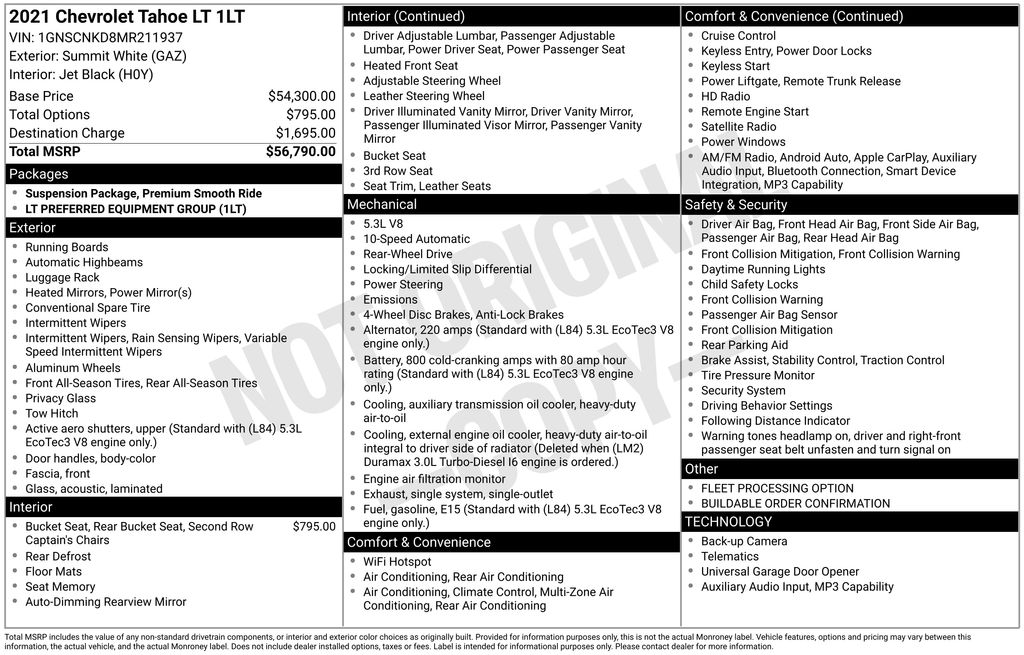 2021 Chevrolet Tahoe LT Summit White LT RWD 10-Speed Automatic with Overdrive EcoTec3 5.3L V8 Black Leather, 10-Way Power Driver & Passenger Seat Adjusters, 1st & 2nd Row Color-Keyed Carpeted Floor Mats, 2 USB Data Ports, 2nd Row Manual Bucket Seats, 3.23 Rear Axle Ratio, 3rd row seats: split-bench, 4-Wheel Disc Brakes, 9 Speakers, ABS brakes, Air Conditioning, Alloy wheels, AM/FM radio: SiriusXM with 360L, Apple CarPlay/Android Auto, Auto High-beam Headlights, Auto-Dimming Inside Rear-View Mirror, Auto-dimming Rear-View mirror, Automatic temperature control, Bose 9-Speaker Stereo Audio System Feature, Brake assist, Bright Front & Rear Door Sill Plates, Bumpers: body-color, Color-Keyed Carpeting Floor Covering, Compass, Delay-off headlights, Driver & Front Outboard Passenger Airbags, Driver door bin, Driver vanity mirror, Dual front impact airbags, Dual front side impact airbags, Electronic Stability Control, Emergency communication system: OnStar and Chevrolet connected services capable, Floor Console w/Storage Area, Four wheel independent suspension, Front anti-roll bar, Front Bucket Seats, Front Center Armrest, Front dual zone A/C, Front High-Back Reclining Bucket Seats, Front reading lights, Fully automatic headlights, Garage door transmitter, Hands-Free Rear Power Programmable Liftgate, HD Radio, Heated door mirrors, Heated Driver & Front Passenger Seats, Heated front seats, Illuminated entry, Infotainment Display, Leather Seat Trim, Leather steering wheel, Leather-Wrapped Steering Wheel, LED Daytime Running Lamps, Low tire pressure warning, Memory seat, Memory Settings for Driver, Occupant sensing airbag, Outside temperature display, Overhead airbag, Overhead console, Panic alarm, Passenger door bin, Passenger vanity mirror, Power door mirrors, Power driver seat, Power Liftgate, Power passenger seat, Power steering, Power windows, Preferred Equipment Group 1LT, Premium audio system: Chevrolet Infotainment 3, Premium Smooth Ride Suspension, Radio: Chevrolet Infotainment 3 Plus System, Rain sensing wipers, Rear air conditioning, Rear anti-roll bar, Rear reading lights, Rear seat center armrest, Rear window defroster, Rear window wiper, Remote keyless entry, Remote Start, Roof rack: rails only, Security system, SiriusXM Radio w/360L, Speed control, Speed-sensing steering, Split folding rear seat, Spoiler, Steering wheel mounted audio controls, Tachometer, Telescoping steering wheel, Tilt steering wheel, Traction control, Trip computer, Universal Home Remote, Variably intermittent wipers, Voltmeter, Wheels: 18" x 8.5" Bright Silver Painted Aluminum, Black Leather.