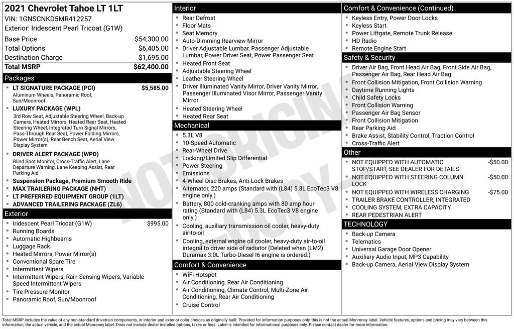 2021 Chevrolet Tahoe LT Iridescent Pearl Tricoat LT RWD 10-Speed Automatic with Overdrive EcoTec3 5.3L V8 Black Leather, 10-Way Power Driver & Passenger Seat Adjusters, 1st & 2nd Row Color-Keyed Carpeted Floor Mats, 2 USB Data Ports, 2nd Row Pwr Release 60/40 Split-Folding Bench Seat, 3.23 Rear Axle Ratio, 3rd Row 60/40 Power-Folding Split-Bench Seat, 3rd row seats: split-bench, 4-Wheel Disc Brakes, 9 Speakers, ABS brakes, Advanced Trailering Package, Advanced Trailering System, Air Conditioning, Alloy wheels, AM/FM radio: SiriusXM with 360L, Apple CarPlay/Android Auto, Auto High-beam Headlights, Auto-Dimming Inside Rear-View Mirror, Auto-dimming Rear-View mirror, Automatic Heated Steering Wheel, Automatic temperature control, Bose 9-Speaker Stereo Audio System Feature, Brake assist, Bright Front & Rear Door Sill Plates, Bumpers: body-color, Color-Keyed Carpeting Floor Covering, Compass, Delay-off headlights, Driver & Front Outboard Passenger Airbags, Driver Alert Package, Driver door bin, Driver vanity mirror, Dual front impact airbags, Dual front side impact airbags, Dual-Pane Power Panoramic Sunroof, Electronic Stability Control, Emergency communication system: OnStar and Chevrolet connected services capable, Extra Capacity Cooling System, Floor Console w/Storage Area, Four wheel independent suspension, Front & Rear Park Assist, Front anti-roll bar, Front Bucket Seats, Front Center Armrest, Front dual zone A/C, Front High-Back Reclining Bucket Seats, Front reading lights, Fully automatic headlights, Garage door transmitter, Hands-Free Rear Power Programmable Liftgate, HD Radio, HD Surround Vision, Heated 2nd Row Outboard Seats, Heated door mirrors, Heated Driver & Front Passenger Seats, Heated front seats, Hitch Guidance w/Hitch View, Illuminated entry, Infotainment Display, Integrated Trailer Brake Controller, Lane Change Alert w/Side Blind Zone Alert, Lane Keep Assist w/Lane Departure Warning, Leather Seat Trim, Leather steering wheel, Leather-Wrapped Steering Wheel, LED Daytime Running Lamps, Low tire pressure warning, LT Signature Package, Luxury Package, Max Trailering Package, Memory seat, Memory Settings, Memory Settings for Driver, Not Equipped w/Automatic Stop/Start, Not Equipped w/Steering Column Lock, Not Equipped w/Wireless Charging, Occupant sensing airbag, Outside Heated Power-Adjustable Mirrors, Outside temperature display, Overhead airbag, Overhead console, Panic alarm, Passenger door bin, Passenger vanity mirror, Power door mirrors, Power driver seat, Power Liftgate, Power passenger seat, Power steering, Power Tilt & Telescopic Steering Column, Power windows, Preferred Equipment Group 1LT, Premium audio system: Chevrolet Infotainment 3, Premium Smooth Ride Suspension, Radio: Chevrolet Infotainment 3 Plus System, Rain sensing wipers, Rear air conditioning, Rear anti-roll bar, Rear Cross Traffic Alert, Rear Pedestrian Alert, Rear reading lights, Rear seat center armrest, Rear window defroster, Rear window wiper, Remote keyless entry, Remote Start, Roof rack: rails only, Security system, SiriusXM Radio w/360L, Speed control, Speed-sensing steering, Split folding rear seat, Spoiler, Steering wheel mounted audio controls, Tachometer, Telescoping steering wheel, Tilt steering wheel, Traction control, Trip computer, Universal Home Remote, Variably intermittent wipers, Voltmeter, Wheels: 18" x 8.5" Bright Silver Painted Aluminum, Wheels: 20" x 9" Painted Aluminum, Black Leather.
