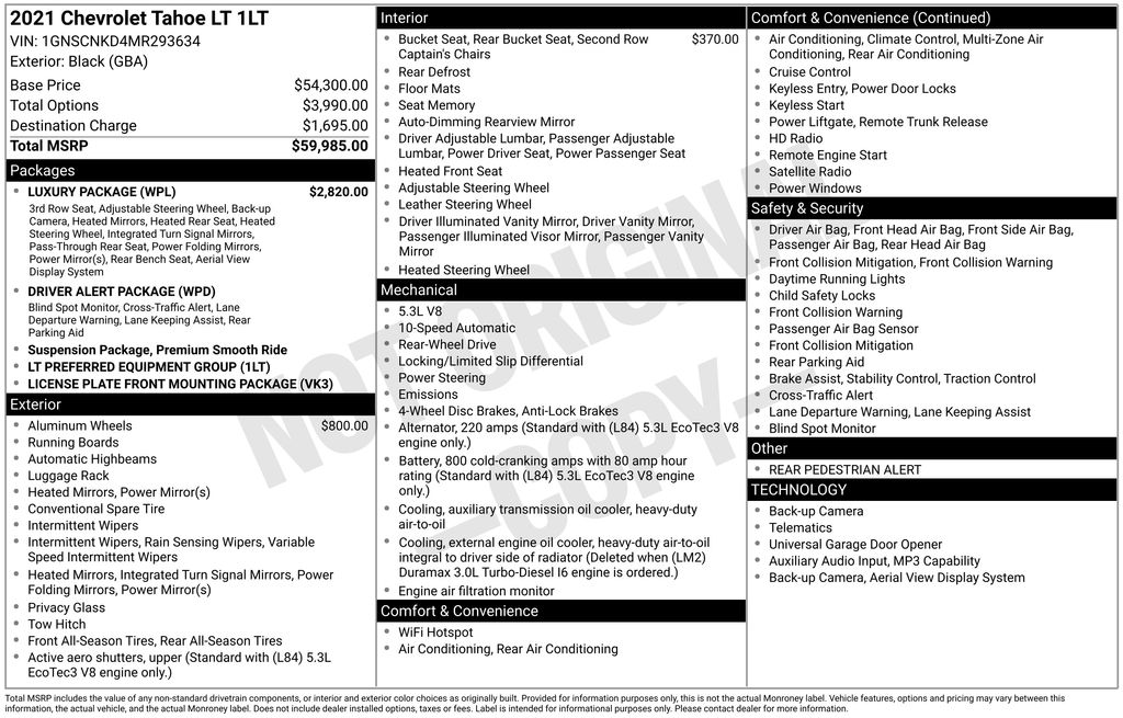 2021 Chevrolet Tahoe LT Black LT RWD 10-Speed Automatic with Overdrive EcoTec3 5.3L V8 Black Leather, 10-Way Power Driver & Passenger Seat Adjusters, 1st & 2nd Row Color-Keyed Carpeted Floor Mats, 2 USB Data Ports, 2nd Row Pwr Release 60/40 Split-Folding Bench Seat, 3.23 Rear Axle Ratio, 3rd Row 60/40 Power-Folding Split-Bench Seat, 3rd row seats: split-bench, 4-Wheel Disc Brakes, 9 Speakers, ABS brakes, Air Conditioning, Alloy wheels, AM/FM radio: SiriusXM with 360L, Apple CarPlay/Android Auto, Auto High-beam Headlights, Auto-Dimming Inside Rear-View Mirror, Auto-dimming Rear-View mirror, Automatic Heated Steering Wheel, Automatic temperature control, Bose 9-Speaker Stereo Audio System Feature, Brake assist, Bright Front & Rear Door Sill Plates, Bumpers: body-color, Color-Keyed Carpeting Floor Covering, Compass, Delay-off headlights, Driver & Front Outboard Passenger Airbags, Driver Alert Package, Driver door bin, Driver vanity mirror, Dual front impact airbags, Dual front side impact airbags, Electronic Stability Control, Emergency communication system: OnStar and Chevrolet connected services capable, Floor Console w/Storage Area, Four wheel independent suspension, Front & Rear Park Assist, Front anti-roll bar, Front Bucket Seats, Front Center Armrest, Front dual zone A/C, Front High-Back Reclining Bucket Seats, Front reading lights, Fully automatic headlights, Garage door transmitter, Hands-Free Rear Power Programmable Liftgate, HD Radio, HD Surround Vision, Heated 2nd Row Outboard Seats, Heated door mirrors, Heated Driver & Front Passenger Seats, Heated front seats, Illuminated entry, Infotainment Display, Lane Change Alert w/Side Blind Zone Alert, Lane Keep Assist w/Lane Departure Warning, Leather Seat Trim, Leather steering wheel, Leather-Wrapped Steering Wheel, LED Daytime Running Lamps, License Plate Front Mounting Package, Low tire pressure warning, Luxury Package, Memory seat, Memory Settings, Memory Settings for Driver, Occupant sensing airbag, Outside Heated Power-Adjustable Mirrors, Outside temperature display, Overhead airbag, Overhead console, Panic alarm, Passenger door bin, Passenger vanity mirror, Power door mirrors, Power driver seat, Power Liftgate, Power passenger seat, Power Release 2nd Row Bucket Seats, Power steering, Power Tilt & Telescopic Steering Column, Power windows, Preferred Equipment Group 1LT, Premium audio system: Chevrolet Infotainment 3, Premium Smooth Ride Suspension, Radio: Chevrolet Infotainment 3 Plus System, Rain sensing wipers, Rear air conditioning, Rear anti-roll bar, Rear Cross Traffic Alert, Rear Pedestrian Alert, Rear reading lights, Rear seat center armrest, Rear window defroster, Rear window wiper, Remote keyless entry, Remote Start, Roof rack: rails only, Security system, SiriusXM Radio w/360L, Speed control, Speed-sensing steering, Split folding rear seat, Spoiler, Steering wheel mounted audio controls, Tachometer, Telescoping steering wheel, Tilt steering wheel, Traction control, Trip computer, Universal Home Remote, Variably intermittent wipers, Voltmeter, Wheels: 18" x 8.5" Bright Silver Painted Aluminum, Wheels: 20" x 9" Painted Aluminum, Black Leather.