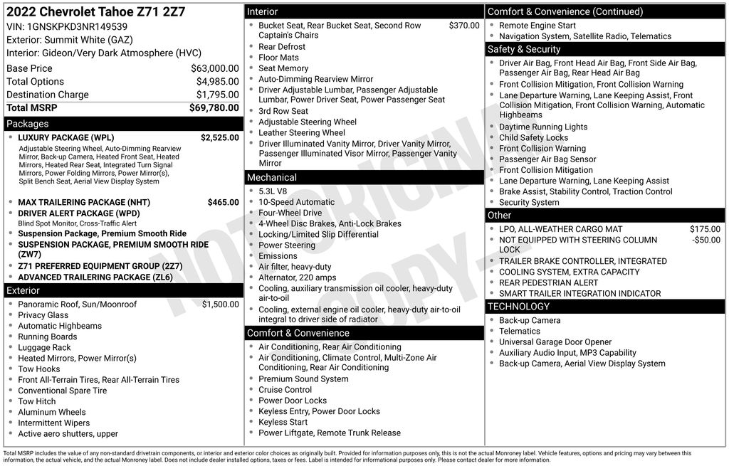 2022 Chevrolet Tahoe Z71 Summit White Z71 4WD 10-Speed Automatic with Overdrive EcoTec3 5.3L V8 4WD, Gideon/Very Dark Atmosphere Leather, 10-Way Power Driver & Passenger Seat Adjusters, 1st & 2nd Row Color-Keyed Carpeted Floor Mats, 2-Speed Active Electronic AutoTrac Transfer Case, 2nd Row Pwr Release 60/40 Split-Folding Bench Seat, 3.23 Rear Axle Ratio, 3rd Row 60/40 Power-Folding Split-Bench Seat, 3rd row seats: split-bench, 4-Wheel Disc Brakes, 9 Speakers, ABS brakes, Advanced Trailering Package, Air Conditioning, All-Weather Cargo Mat (LPO), Alloy wheels, AM/FM radio: SiriusXM with 360L, Apple CarPlay/Android Auto, Auto High-beam Headlights, Auto-Dimming Inside Rear-View Mirror, Auto-dimming Rear-View mirror, Automatic Stop/Start, Automatic temperature control, Black Tubular Assist Steps, Bose 9-Speaker Stereo Audio System Feature, Brake assist, Bright Front & Rear Door Sill Plates, Bumpers: body-color, Color-Keyed Carpeting Floor Covering, Compass, Delay-off headlights, Driver & Front Outboard Passenger Airbags, Driver Alert Package, Driver door bin, Driver vanity mirror, Dual front impact airbags, Dual front side impact airbags, Dual-Pane Power Panoramic Sunroof, Electronic Stability Control, Emergency communication system: OnStar and Chevrolet connected services capable, Enhanced Driver Information Center, Extra Capacity Cooling System, Floor Console w/Storage Area, Four wheel independent suspension, Front anti-roll bar, Front Bucket Seats, Front Center Armrest, Front dual zone A/C, Front High-Approach Angle Fascia, Front High-Back Reclining Bucket Seats, Front reading lights, Fully automatic headlights, Garage door transmitter, Hands-Free Rear Power Programmable Liftgate, HD Surround Vision, Heated 2nd Row Outboard Seats, Heated door mirrors, Heated Driver & Front Passenger Seats, Heated front seats, Heated Steering Wheel, Hill Descent Control, Hitch Guidance w/Hitch View, Illuminated entry, Infotainment Display, Integrated Trailer Brake Controller, Lane Change Alert w/Side Blind Zone Alert, Leather steering wheel, Leather-Appointed Seat Trim, Leather-Wrapped Steering Wheel, LED Daytime Running Lamps, Low tire pressure warning, Luxury Package, Max Trailering Package, Memory seat, Memory Settings, Memory Settings for Driver, Navigation System, Not Equipped w/Steering Column Lock, Occupant sensing airbag, Outside Heated Power-Adjustable Mirrors, Outside temperature display, Overhead airbag, Overhead console, Panic alarm, Passenger door bin, Passenger vanity mirror, Power door mirrors, Power driver seat, Power Liftgate, Power passenger seat, Power Release 2nd Row Bucket Seats, Power steering, Power Tilt & Telescopic Steering Column, Power windows, Preferred Equipment Group 2Z7, Premium audio system: Chevrolet Infotainment System 3, Premium Smooth Ride Suspension, Radio: Chevrolet Infotainment 3 Premium System, Rain sensing wipers, Rear air conditioning, Rear anti-roll bar, Rear Cross Traffic Alert, Rear Pedestrian Alert, Rear reading lights, Rear seat center armrest, Rear window defroster, Rear window wiper, Red Horizontal-Mounted Recovery Hooks, Remote keyless entry, Remote Start, Roof rack: rails only, Security system, SiriusXM Radio w/360L, Smart Trailer Integration Indicator, Speed control, Speed-sensing steering, Split folding rear seat, Spoiler, Start/Stop System Disable Button, Steering wheel mounted audio controls, Tachometer, Telescoping steering wheel, Tilt steering wheel, Traction control, Trip computer, Universal Home Remote, Variably intermittent wipers, Voltmeter, Wheels: 20" x 9" Machined Aluminum, Wireless Charging, 4WD, Gideon/Very Dark Atmosphere Leather.