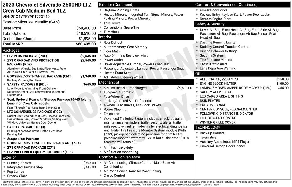 2023 Chevrolet Silverado 2500HD LTZ Silver Ice Metallic LTZ 4WD 10-Speed Automatic Duramax 6.6L V8 Turbodiesel 10-Speed Automatic, 4WD, Gideon/Very Dark Atmosphere Leather, 10-Way Power Driver Seat Adjuster w/Lumbar, 10-Way Power Passenger Seat Adjuster w/Lumbar, 12-Volt Rear Auxiliary Power Outlet, 120-Volt Bed Mounted Power Outlet, 120-Volt Instrument Panel Power Outlet, 170 Amp Alternator, 1st & 2nd Row All-Weather Floor Liners (LPO) (AAK), 2 USB Ports (1st Row), 2 USB Ports & 1 SD Card Reader, 2-Speed Active Electronic AutoTrac Transfer Case, 220 Amp Alternator, 4-Wheel Disc Brakes, 4.2" Diagonal Color Display Driver Info Center, 6 Speakers, 6-Speaker Audio System, 6" Rectangular Chromed Tubular Assist Steps, 720 Cold-Cranking Amps Heavy-Duty Battery, ABS brakes, Advanced Trailering System, Air Conditioning, Alloy wheels, AM/FM radio: SiriusXM with 360L, Apple CarPlay/Android Auto, Auto-dimming door mirrors, Auto-Dimming Inside Rear-View Mirror, Auto-dimming Rear-View mirror, Automatic Emergency Braking, Automatic temperature control, Bed View Camera w/2 Trailer Camera Provisions, Black Chevytec Spray-On Bedliner, Bluetooth® For Phone, Brake assist, Bumpers: chrome, Chevrolet Connected Access Capable, Chrome Front Grille, Chrome Mirror Caps, Color-Keyed Carpeting Floor Covering, Compass, Deep-Tinted Glass, Delay-off headlights, Driver door bin, Driver Memory, Driver vanity mirror, Dual Charge-Only USB Ports (2nd Row), Dual front impact airbags, Dual front side impact airbags, Electric Rear-Window Defogger, Electrical Lock Control Steering Column, Electronic Cruise Control w/Set & Resume Speed, Electronic Stability Control, Engine Block Heater, Exhaust Brake, EZ Lift Power Lock & Release Tailgate, Floor-Mounted Center Console, Following Distance Indicator, Forward Collision Alert, Front 40/20/40 Split-Bench Seats w/Lockable Storage, Front anti-roll bar, Front Bucket Seats, Front Center Armrest w/Storage, Front dual zone A/C, Front fog lights, Front LED Fog Lamps, Front reading lights, Front Rubberized Vinyl Floor Mats, Front wheel independent suspension, Fully automatic headlights, Gooseneck/5th Wheel Package, Gooseneck/5th Wheel Prep Package, HD Rear Vision Camera, Heated & Auto-Dim Pwr Vertical Trailering Mirrors, Heated 2nd Row Outboard Seats, Heated door mirrors, Heated Driver & Front Outboard Passenger Seating, Heated front seats, Heated Steering Wheel, Heated steering wheel, Hill Descent Control, Hitch Guidance w/Hitch View, Illuminated entry, Integrated Trailer Brake Controller, IntelliBeam Automatic High Beam On/Off, Keyless Open & Start, Lane Change Alert w/Side Blind Zone Alert, Lane Departure Warning System, LED Cargo Area Lighting, LED Smoked Amber Roof Marker Lamps, Low tire pressure warning, LTZ Convenience Package, LTZ Plus Package, Manual Tilt & Telescoping Steering Column, Memory seat, Multi-Flex Tailgate, Occupant sensing airbag, Off-Road Suspension, OnStar & Chevrolet Connected Services Capable, Outside temperature display, Overhead airbag, Overhead console, Panic alarm, Passenger door bin, Passenger vanity mirror, Perf Leather-Appointed Front Outboard Seat Trim, Power Door Locks, Power door mirrors, Power driver seat, Power Front Windows w/Driver Express Up/Down, Power Front Windows w/Passenger Express Up/Down, Power passenger seat, Power Rear Windows w/Express Down, Power Sliding Rear Window w/Defogger, Power steering, Power windows, Preferred Equipment Group 1LZ, Premium audio system: Chevrolet Infotainment 3 Premium, Radio: Chevrolet Infotainment 3 Plus System, Rear Cross Traffic Alert, Rear reading lights, Rear Rubberized Vinyl Floor Mats, Rear seat center armrest, Rear step bumper, Rear Wheelhouse Liners, Rear window defroster, Remote keyless entry, Remote Vehicle Starter System, Safety Alert Seat, Safety Package, Safety Package II, Security system, SiriusXM w/360L, Speed control, Speed-sensing steering, Split folding rear seat, Standard Tailgate, Steering Wheel Audio Controls, Steering wheel mount