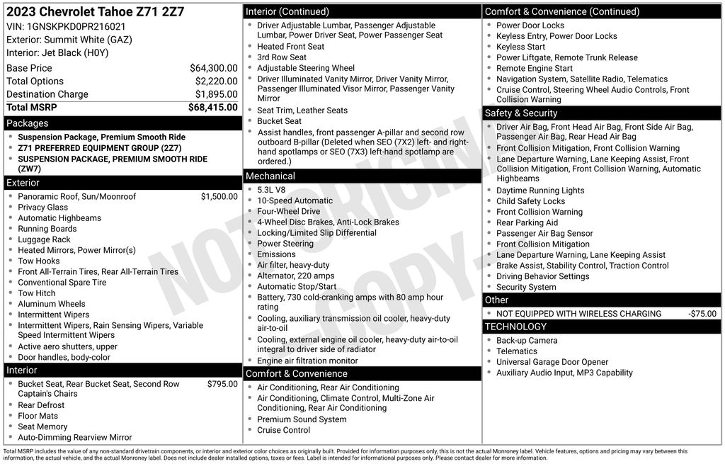 2023 Chevrolet Tahoe Z71 Summit White Z71 4WD 10-Speed Automatic with Overdrive EcoTec3 5.3L V8 4WD, Black Leather, 10-Way Power Driver & Passenger Seat Adjusters, 1st & 2nd Row Color-Keyed Carpeted Floor Mats, 2-Speed Active Electronic AutoTrac Transfer Case, 2nd Row Manual Bucket Seats, 3.23 Rear Axle Ratio, 3rd row seats: split-bench, 4-Wheel Disc Brakes, 9 Speakers, ABS brakes, Air Conditioning, Alloy wheels, AM/FM radio: SiriusXM with 360L, Apple CarPlay/Android Auto, Auto High-beam Headlights, Auto-Dimming Inside Rear-View Mirror, Auto-dimming Rear-View mirror, Automatic temperature control, Black Tubular Assist Steps, Bose 9-Speaker Stereo Audio System Feature, Brake assist, Bright Front & Rear Door Sill Plates, Bumpers: body-color, Color-Keyed Carpeting Floor Covering, Compass, Delay-off headlights, Driver & Front Outboard Passenger Airbags, Driver door bin, Driver vanity mirror, Dual front impact airbags, Dual front side impact airbags, Dual-Pane Power Panoramic Sunroof, Electronic Stability Control, Emergency communication system: OnStar and Chevrolet connected services capable, Enhanced Driver Information Center, Floor Console w/Storage Area, Four wheel independent suspension, Front anti-roll bar, Front Bucket Seats, Front Center Armrest, Front dual zone A/C, Front High-Approach Angle Fascia, Front High-Back Reclining Bucket Seats, Front reading lights, Fully automatic headlights, Garage door transmitter, Hands-Free Rear Power Programmable Liftgate, Heated door mirrors, Heated Driver & Front Passenger Seats, Heated front seats, Hill Descent Control, Illuminated entry, Infotainment Display, Leather-Appointed Seat Trim, LED Daytime Running Lamps, Low tire pressure warning, Memory seat, Memory Settings for Driver, Navigation System, Not Equipped w/Wireless Charging, Occupant sensing airbag, Outside temperature display, Overhead airbag, Overhead console, Panic alarm, Passenger door bin, Passenger vanity mirror, Power door mirrors, Power driver seat, Power Liftgate, Power passenger seat, Power steering, Power windows, Preferred Equipment Group 2Z7, Premium audio system: Chevrolet Infotainment 3 Premium, Premium Smooth Ride Suspension, Radio: Chevrolet Infotainment 3 Premium System, Rain sensing wipers, Rear air conditioning, Rear anti-roll bar, Rear reading lights, Rear seat center armrest, Rear window defroster, Rear window wiper, Red Horizontal-Mounted Recovery Hooks, Remote keyless entry, Remote Start, Roof rack: rails only, Security system, SiriusXM Radio w/360L, Speed control, Speed-sensing steering, Split folding rear seat, Spoiler, Steering wheel mounted audio controls, Tachometer, Telescoping steering wheel, Tilt steering wheel, Traction control, Trip computer, Universal Home Remote, Variably intermittent wipers, Voltmeter, Wheels: 20" x 9" Machined Aluminum, Wireless Charging, Wrapped Steering Wheel, 4WD, Black Leather.