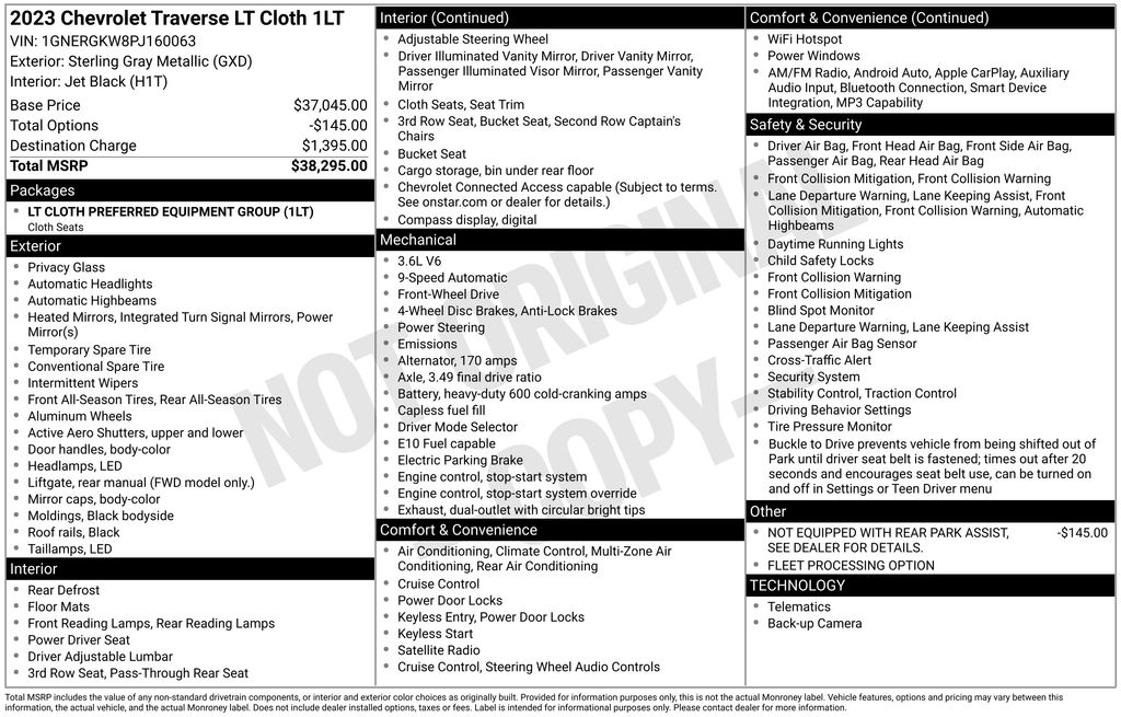 2023 Chevrolet Traverse LT 1LT Sterling Gray Metallic LT 1LT FWD 9-Speed Automatic 3.6L V6 SIDI VVT 2-Way Manual Front Passenger Seat Adjuster, 3.49 Axle Ratio, 3rd row seats: split-bench, 4-Wheel Disc Brakes, 6 Speakers, 6-Speaker Audio System Feature, 8-Way Power Driver Seat Adjuster, ABS brakes, Air Conditioning, Alloy wheels, AM/FM radio: SiriusXM, Apple CarPlay/Android Auto, Auto High-beam Headlights, Automatic temperature control, Black Roof Rails, Brake assist, Bumpers: body-color, Compass, Delay-off headlights, Driver door bin, Driver vanity mirror, Dual front impact airbags, Dual front side impact airbags, Electronic Stability Control, Emergency communication system, Exterior Parking Camera Rear, Four wheel independent suspension, Front anti-roll bar, Front Bucket Seats, Front Center Armrest, Front dual zone A/C, Front reading lights, Fully automatic headlights, Heated door mirrors, Illuminated entry, Leather steering wheel, Low tire pressure warning, Not Equipped w/Rear Park Assist (060), Occupant sensing airbag, Outside temperature display, Overhead airbag, Overhead console, Panic alarm, Passenger door bin, Passenger vanity mirror, Power door mirrors, Power Driver Lumbar Control, Power driver seat, Power steering, Power windows, Preferred Equipment Group 1LT, Premium Cloth Seat Trim, Radio data system, Radio: Chevrolet Infotainment System AM/FM Stereo, Rear air conditioning, Rear anti-roll bar, Rear reading lights, Rear window defroster, Rear window wiper, Remote keyless entry, Security system, SiriusXM Radio, Speed control, Speed-sensing steering, Spoiler, Steering wheel mounted audio controls, Tachometer, Telescoping steering wheel, Tilt steering wheel, Traction control, Trip computer, Turn signal indicator mirrors, Variably intermittent wipers, Voltmeter, Wheels: 18" Bright Silver-Painted Aluminum.