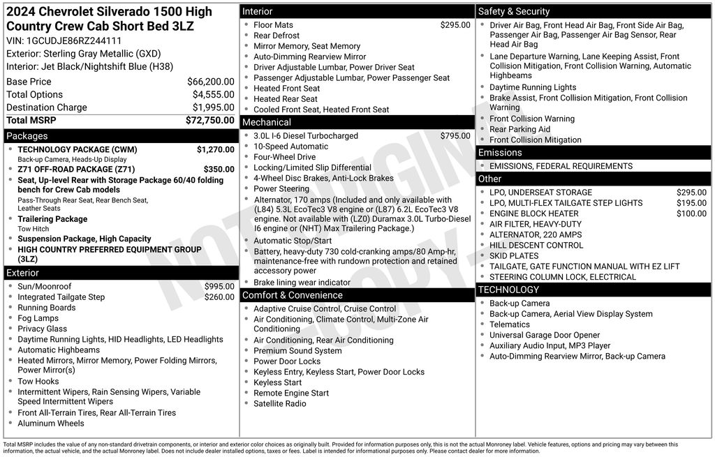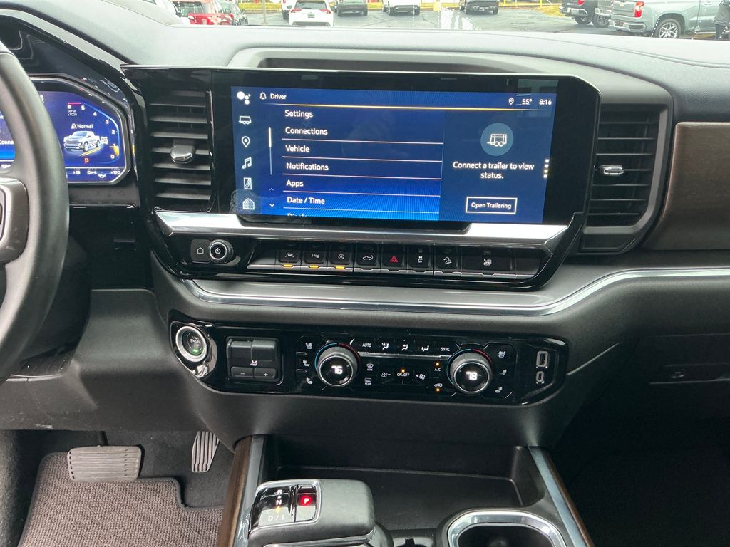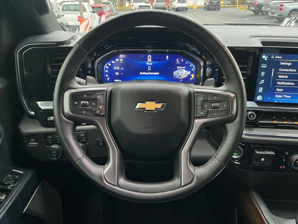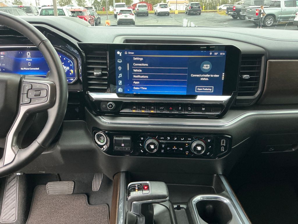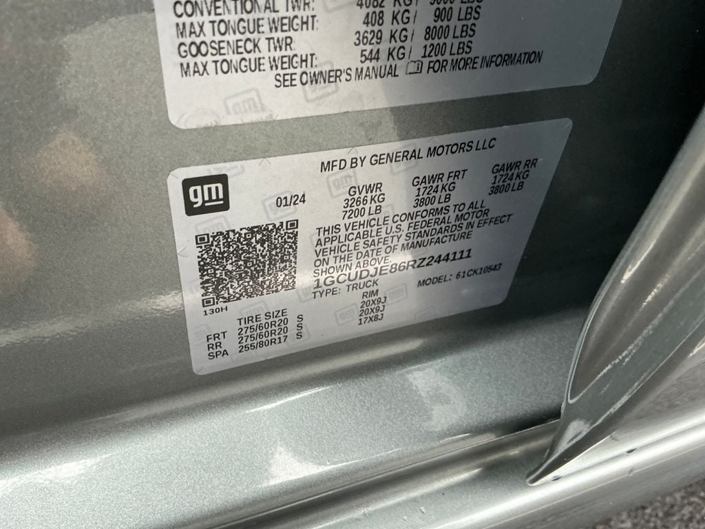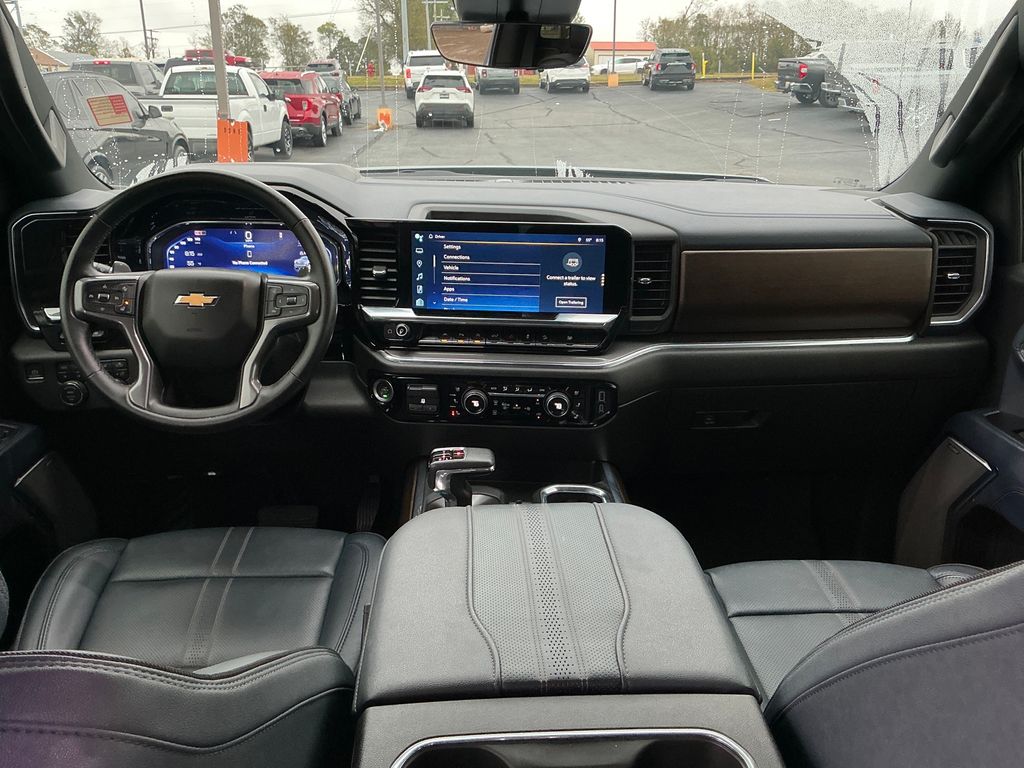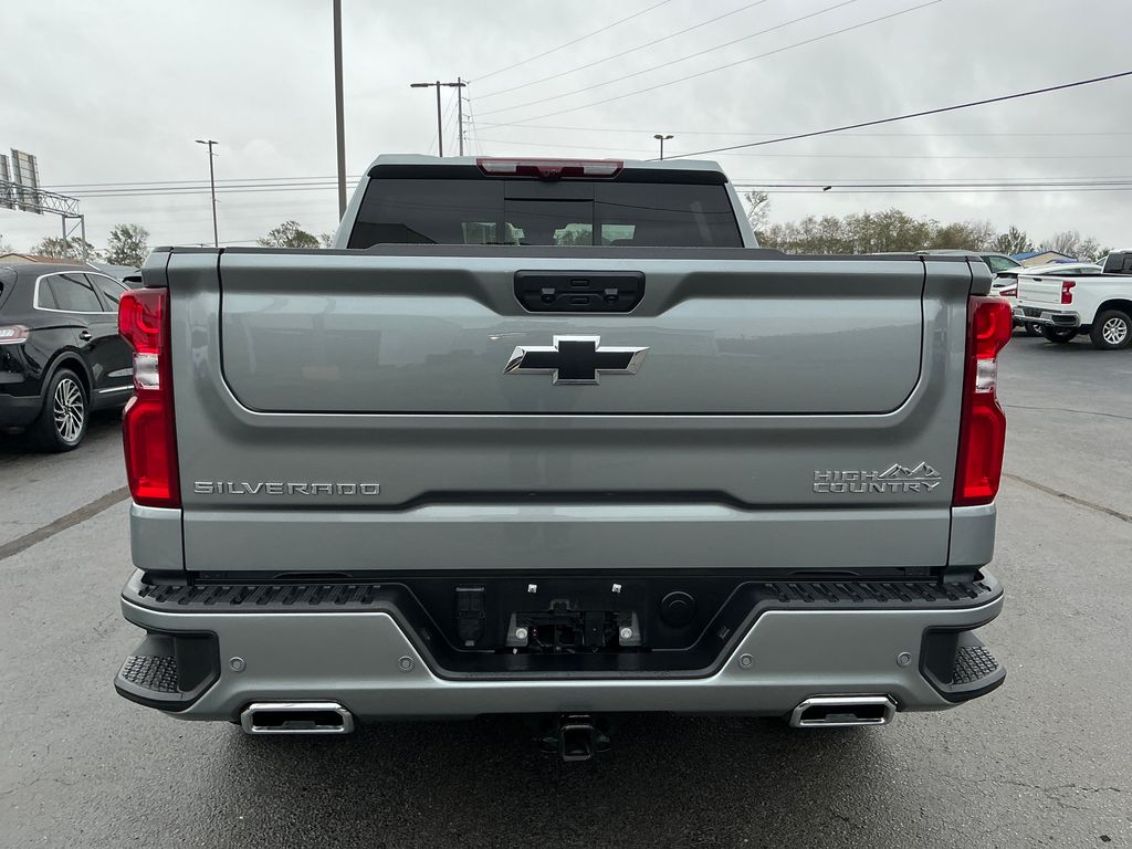 2024 Chevrolet Silverado 1500 High Country Sterling Gray Metallic High Country 4WD 10-Speed Automatic 3.0L I6 10-Speed Automatic, 4WD, Jet Black/Nightshift Blue Leather, 10-Way Power Driver Seat w/Lumbar, 10-Way Power Passenger Seat Adjuster w/Lumbar, 12.3" Multicolor Reconfigurable Digital Display, 120-Volt Bed Mounted Power Outlet, 120-Volt Interior Power Outlet, 15" Diagonal Multicolor Head-Up Display, 170 Amp Alternator, 2 USB Data Ports, 220 Amp Alternator, 2nd Row Heated Outboard Seats, 3.23 Rear Axle Ratio, 4-Wheel Disc Brakes, 7 Speakers, ABS brakes, Adaptive Cruise Control, Air Conditioning, All-Weather Floor Liner (LPO) (AAK), Alloy wheels, AM/FM radio: SiriusXM with 360L, Auto High-beam Headlights, Auto-dimming door mirrors, Auto-Dimming Inside Rear-View Mirror, Auto-dimming Rear-View mirror, Auto-Locking Rear Differential, Automatic temperature control, Bed View Camera, Bluetooth® For Phone, Body-Color Painted Mirror Caps, Bodyside moldings, Brake assist, Bumpers: body-color, Chevrolet Connected Access Capable, Chevytec Spray-On Black Bedliner, Chrome Assist Steps, Chrome Recovery Hooks, Color-Keyed Carpeting Floor Covering, Compass, Deep-Tinted Glass, Delay-off headlights, Driver door bin, Driver Memory, Driver vanity mirror, Dual Exhaust w/Polished Outlets, Dual front impact airbags, Dual front side impact airbags, Dual Rear USB Ports (Charge Only), Electric Rear-Window Defogger, Electrical Steering Column Lock, Electronic Stability Control, Electronic Transmission Range Selector Shifter, Engine Block Heater, Enhanced Automatic Emergency Braking, EZ Lift Power Lock & Release Tailgate, Floor Mounted Center Console, Following Distance Indicator, Forward Collision Alert, Front anti-roll bar, Front Bucket Seats, Front Carpeted Floor Mats, Front Center Armrest, Front dual zone A/C, Front fog lights, Front LED Fog Lamps, Front Pedestrian Braking, Front Rain-Sensing Wipers, Front reading lights, Front wheel independent suspension, Fully automatic headlights, Garage door transmitter, Genuine wood console insert, Genuine wood dashboard insert, Genuine wood door panel insert, HD Surround Vision, Heated door mirrors, Heated Driver & Front Outboard Passenger Seats, Heated front seats, Heated rear seats, Heated Steering Wheel, Heated steering wheel, Heavy-Duty Air Filter, High Capacity Suspension Package, Hill Descent Control, Hitch Guidance, Hitch Guidance w/Hitch View, Illuminated entry, In-Vehicle Trailering System App, Integrated Trailer Brake Controller, IntelliBeam Automatic High Beam On/Off, Keyless Open & Start, Lane Keep Assist w/Lane Departure Warning, LED Cargo Area Lighting, Low tire pressure warning, Memory seat, Multi-Flex Tailgate, Multi-Flex Tailgate Step Lights (LPO), Occupant sensing airbag, Off-Road Suspension, OnStar & Chevrolet Connected Services Capable, Outside Heated Power-Adjustable Mirrors, Outside temperature display, Overhead airbag, Overhead console, Panic alarm, Passenger door bin, Passenger vanity mirror, Perforated Leather Seat Trim, Perimeter Lighting, Power door mirrors, Power driver seat, Power Front Passenger Windows w/Express Up/Down, Power Front Windows w/Driver Express Up/Down, Power passenger seat, Power Rear Windows w/Express Down, Power Sliding Rear Window w/Rear Defogger, Power steering, Power Sunroof, Power Tailgate, Power Tilt & Telescoping Steering Column, Power windows, Preferred Equipment Group 3LZ, Premium audio system: Chevrolet Infotainment 3 Premium, Premium Bose 7-Speaker Sound System, Radio data system, Radio: Chevrolet Infotainment 3 Premium System, Rain sensing wipers, Rear Camera Mirror, Rear Carpeted Floor Mats, Rear Cross Traffic Braking, Rear Pedestrian Alert, Rear reading lights, Rear seat center armrest, Rear step bumper, Rear Wheelhouse Liners, Rear window defroster, Remote keyless entry, Remote Vehicle Starter System, Safety Alert Seat, Security system, SiriusXM w/360L, Speed control, Speed-sensing steering, Split folding rear seat, Standard Tailgate, Steering W