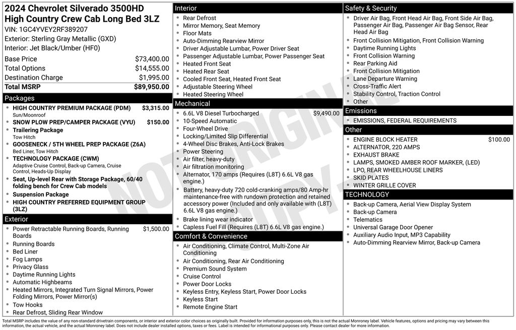 2024 Chevrolet Silverado 3500HD High Country Sterling Gray Metallic High Country 4WD 10-Speed Automatic Duramax 6.6L V8 Turbodiesel 10-Speed Automatic, 4WD, Jet Black/Umber Leather, 10-Way Power Driver Seat Adjuster w/Lumbar, 10-Way Power Passenger Seat Adjuster w/Lumbar, 120-Volt Bed Mounted Power Outlet, 120-Volt Interior Power Outlet, 170 Amp Alternator, 220 Amp Alternator, 4-Wheel Disc Brakes, 6" Rectangular Chromed Tubular Assist Steps, 7 Speakers, ABS brakes, Adaptive Cruise Control, Air Conditioning, Alloy wheels, AM/FM radio: SiriusXM with 360L, Apple CarPlay/Android Auto, Auto High-beam Headlights, Auto-dimming door mirrors, Auto-Dimming Inside Rear-View Mirror, Auto-Dimming Inside Rearview Mirror w/Camera, Auto-dimming Rear-View mirror, Automatic temperature control, Bed View Camera w/2 Trailer Camera Provisions, Bluetooth® For Phone, Bodyside moldings, Bose Premium 7-Speaker Sound System, Brake assist, Bumpers: body-color, Chevrolet Connected Access Capable, Chevytec Spray-On Black Bedliner, Chrome Door Handles, Chrome Mirror Caps, Color-Keyed Carpeting Floor Covering, Compass, Compass Located In Instrument Cluster, Deep-Tinted Glass, Delay-off headlights, Driver door bin, Driver Memory, Driver vanity mirror, Dual front impact airbags, Dual front side impact airbags, Durabed Pickup Bed, Electric Rear-Window Defogger, Electronic Stability Control, Engine Block Heater, Exhaust Brake, Floor-Mounted Center Console, Front anti-roll bar, Front Bucket Seats, Front Carpeted Floor Mats, Front Center Armrest, Front Chrome Recovery Hooks, Front dual zone A/C, Front fog lights, Front LED Fog Lamps, Front Rain-Sensing Wipers, Front reading lights, Front wheel independent suspension, Fully automatic headlights, Garage door transmitter, Genuine wood console insert, Genuine wood dashboard insert, Genuine wood door panel insert, Gooseneck/5th Wheel Prep Package, Heated 2nd Row Outboard Seats, Heated door mirrors, Heated Driver & Front Outboard Passenger Seats, Heated front seats, Heated rear seats, Heated Steering Wheel, Heated steering wheel, Heavy-Duty 80 Amp-Hr Battery, High Country Premium Package, Hitch Guidance w/Hitch View, Illuminated entry, In-Vehicle Trailering App System, Keyless Open & Start, LED Cargo Area Lighting, Low tire pressure warning, Manual Tilt-Wheel/Telescoping Steering Column, Memory seat, Multicolor 15" Diagonal Head-Up Display, Occupant sensing airbag, OnStar & Chevrolet Connected Services Capable, Outside temperature display, Overhead airbag, Overhead console, Panic alarm, Passenger door bin, Passenger vanity mirror, Perforated Leather Seating Surfaces, Polished Exhaust Tip, Power Door Locks, Power door mirrors, Power driver seat, Power Front Windows w/Driver Express Up/Down, Power Front Windows w/Passenger Express Up/Down, Power passenger seat, Power Rear Windows w/Express Down, Power Sliding Rear Window w/Defogger, Power steering, Power Sunroof, Power Tailgate, Power windows, Power-Retractable Assist Steps, Preferred Equipment Group 3LZ, Premium audio system: Chevrolet Infotainment 3 Premium, Push Button Start, Radio: Chevrolet Infotainment 3 Premium System, Rain sensing wipers, Rear Carpeted Floor Mats, Rear Cross Traffic Alert, Rear reading lights, Rear seat center armrest, Rear step bumper, Rear window defroster, Remote keyless entry, Remote Vehicle Starter System, Security system, SiriusXM w/360L, Snow Plow Prep/Camper Package, Speed control, Speed-sensing steering, Split folding rear seat, Standard Tailgate, Steering Wheel Audio Controls, Steering wheel mounted audio controls, Steering Wheel Mounted Electronic Cruise Control, Suspension Package, Tachometer, Technology Package, Telescoping steering wheel, Tilt steering wheel, Traction control, Trailer Camera Provisions, Trailer Side Blind Zone Alert, Trip computer, Turn signal indicator mirrors, Ultrasonic Front & Rear Park Assist, Unauthorized Entry Theft-Deterrent System, Universal Home Remote, Up-Level Rear Seat w/Storage Package, Variably inter