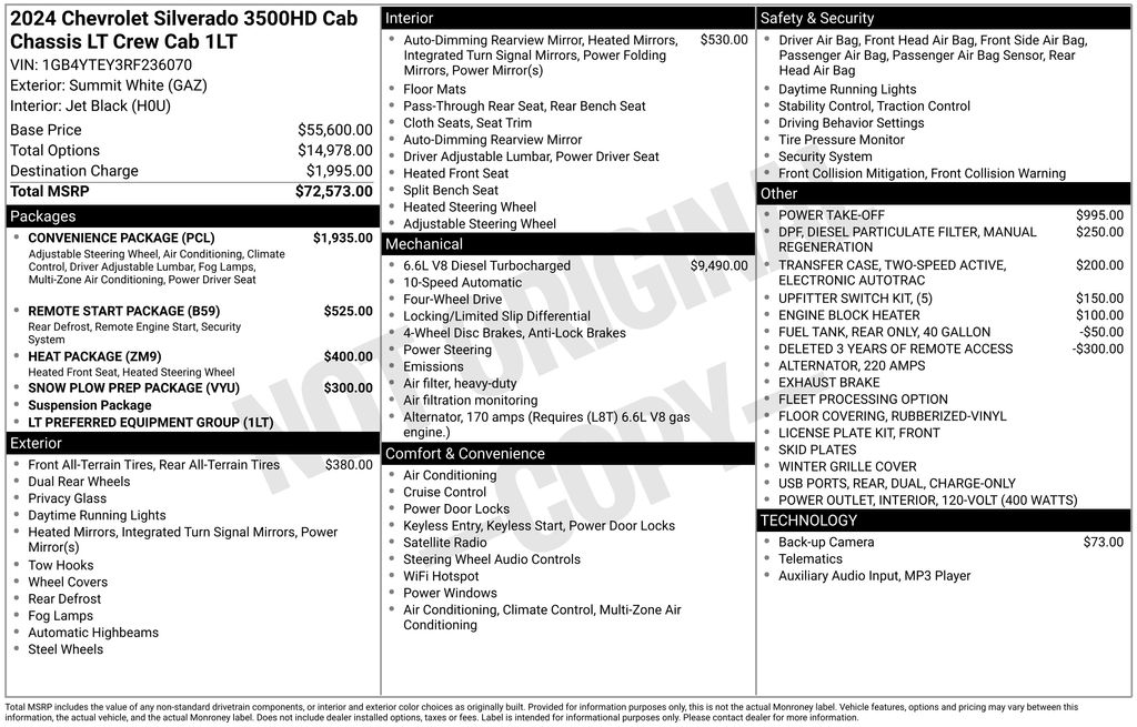 2024 Chevrolet Silverado 3500HD LT Summit White LT 4WD 10-Speed Automatic Duramax 6.6L V8 Turbodiesel 10-Speed Automatic, 4WD, Jet Black Cloth, 10-Way Power Driver Seat Adjuster w/Lumbar, 120-Volt (400 Watts) Interior Power Outlet (DISC), 17" Painted Steel Wheels, 170 Amp Alternator, 2-Speed Active Electronic AutoTrac Transfer Case, 2-Speed Electronic Shift Transfer Case, 220 Amp Alternator, 4-Way Manual Driver Seat Adjuster, 4-Way Manual Passenger Seat Adjuster, 4-Wheel Disc Brakes, 40 Gallon (151L) Rear Only Fuel Tank, 6 Speakers, 6-Speaker Audio System Feature, ABS brakes, Air Conditioning, AM/FM radio: SiriusXM with 360L, Auto High-beam Headlights, Auto-Dimming Inside Rear-View Mirror, Black Frame-Mounted Front Recovery Hooks, Black Mirror Caps, Bluetooth® For Phone, Brake assist, Bumpers: chrome, Chrome Front Grille Bar, Cloth Seat Trim, Color-Keyed Carpeting Floor Covering, Compass, Compass Located In Instrument Cluster, Convenience Package, Deep-Tinted Glass, Delay-off headlights, Deleted 3 Years of Remote Access, Driver door bin, Driver vanity mirror, Dual front impact airbags, Dual front side impact airbags, Dual Rear USB Ports (Charge Only), Dual rear wheels, Dual-Zone Automatic Climate Control, Electric Rear-Window Defogger, Electronic Stability Control, Engine Block Heater, Enhanced 12.3" Diagonal Driver Information Center, Exhaust Brake, Front 40/20/40 Split-Bench Seat, Front anti-roll bar, Front Center Armrest w/Storage, Front LED Fog Lamps, Front License Plate Kit, Front reading lights, Front Rubberized Vinyl Floor Mats, Front wheel independent suspension, Fully automatic headlights, Heat Package, Heated door mirrors, Heated Driver & Front Outboard Passenger Seats, Heated Steering Wheel, Heavy-Duty 80 Amp-Hr Battery, Illuminated entry, Keyless Open & Start, Low tire pressure warning, Manual Tilt Inside Rearview Mirror, Manual Tilt-Wheel Steering Column, Manual Tilt-Wheel/Telescoping Steering Column, Occupant sensing airbag, OnStar & Chevrolet Connected Services Capable, Outside temperature display, Overhead airbag, Overhead console, Panic alarm, Passenger door bin, Passenger vanity mirror, Perimeter Lighting, Power door mirrors, Power Rear Windows w/Express Down, Power steering, Power Take-Off, Power windows, Power-Adjustable Outside Mirrors, Preferred Equipment Group 1LT, Premium audio system: Chevrolet Infotainment 3 Premium, Radio: Chevrolet Infotainment 3 Premium System, Rear 60/40 Folding Bench Seat (Folds Up), Rear reading lights, Rear Rubberized-Vinyl Floor Mats, Remote keyless entry, Remote Start Package, Remote Vehicle Starter System, Rubberized-Vinyl Floor Covering, SiriusXM Radio, Snow Plow Prep Package, Speed control, Split folding rear seat, Steering Wheel Audio Controls, Steering wheel mounted audio controls, Steering Wheel Mounted Electronic Cruise Control, Suspension Package, Tachometer, Tilt steering wheel, Traction control, Trip computer, Turn signal indicator mirrors, Unauthorized Entry Theft-Deterrent System, Upfitter Switch Kit (5), Variably intermittent wipers, Voltmeter, Winter Grille Cover, Wrapped Steering Wheel, 10-Speed Automatic, 4WD, Jet Black Cloth.