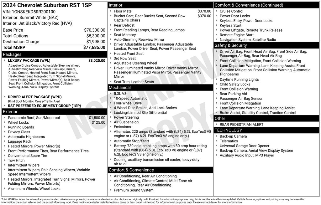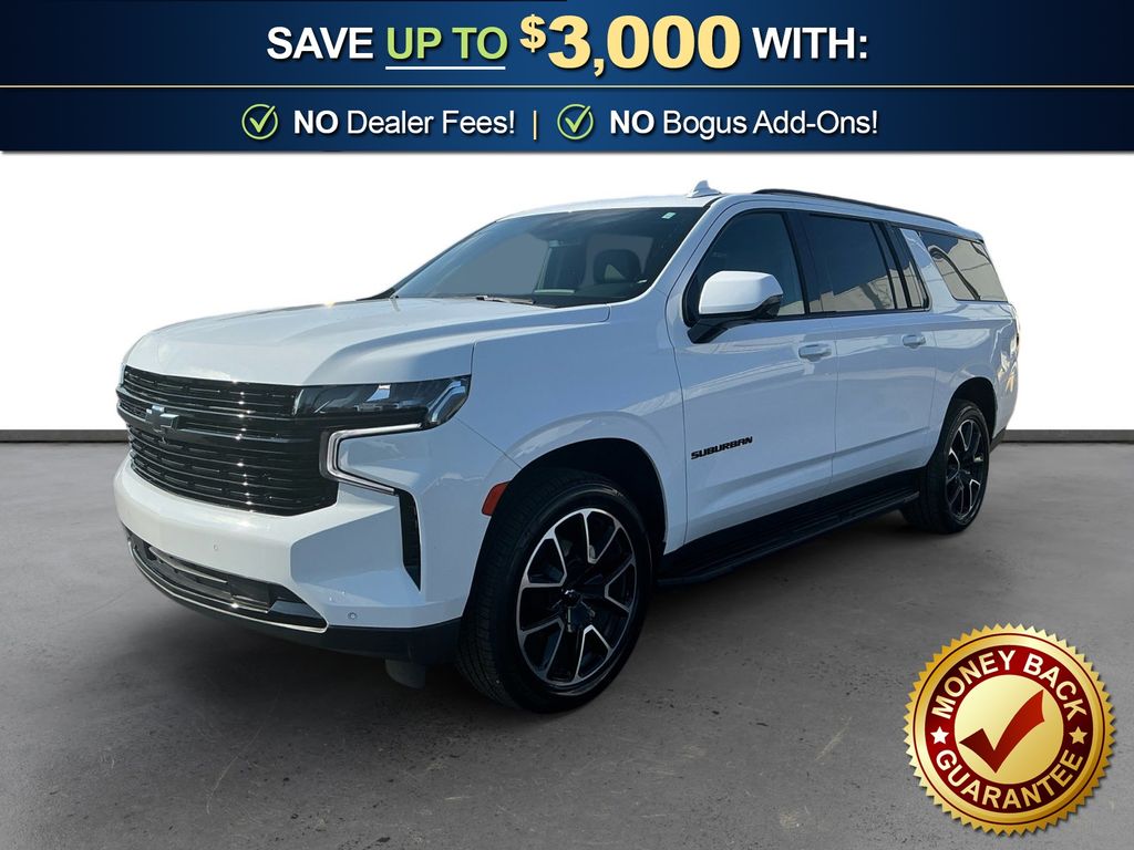 2024 Chevrolet Suburban RST Summit White RST 4WD 10-Speed Automatic with Overdrive EcoTec3 5.3L V8 10-Way Power Driver & Passenger Seat Adjusters, 1st & 2nd Row Color-Keyed Carpeted Floor Mats, 1st, 2nd & 3rd Row All-Weather Floor Liners (LPO), 2nd Row Pwr Release 60/40 Split-Folding Bench Seat, 3.23 Rear Axle Ratio, 3rd Row 60/40 Power-Folding Split-Bench, 3rd row seats: split-bench, 4-Wheel Disc Brakes, 9 Speakers, ABS brakes, Adaptive Cruise Control, Air Conditioning, Alloy wheels, AM/FM radio: SiriusXM with 360L, Apple CarPlay/Android Auto, Auto High-beam Headlights, Auto-Dimming Inside Rear-View Mirror, Auto-dimming Rear-View mirror, Automatic temperature control, Bose 9-Speaker Stereo Audio System Feature, Brake assist, Bright Front & Rear Door Sill Plates, Bumpers: body-color, Color-Keyed Carpeting Floor Covering, Compass, Delay-off headlights, Driver & Front Outboard Passenger Airbags, Driver Alert Package, Driver door bin, Driver vanity mirror, Dual front impact airbags, Dual front side impact airbags, Dual-Pane Power Panoramic Sunroof, Electronic Stability Control, Emergency communication system: OnStar and Chevrolet connected services capable, Enhanced Automatic Emergency Braking, Enhanced Driver Information Center, Floor Console w/Storage Area, Four wheel independent suspension, Front anti-roll bar, Front Bucket Seats, Front Center Armrest, Front dual zone A/C, Front reading lights, Fully automatic headlights, Garage door transmitter, Hands-Free Rear Power Programmable Liftgate, HD Surround Vision, Heated 2nd Row Outboard Seats, Heated door mirrors, Heated Driver & Front Passenger Seats, Heated front seats, Heated Steering Wheel, Illuminated entry, Infotainment Display, Lane Change Alert w/Side Blind Zone Alert, LED Daytime Running Lamps, Low tire pressure warning, Luxury Package, Memory seat, Memory Settings, Memory Settings For Driver, Navigation System, Occupant sensing airbag, Outside Heated Power-Adjustable Mirrors, Outside temperature display, Overhead airbag, Overhead console, Panic alarm, Passenger door bin, Passenger vanity mirror, Perforated Leather Seating Surfaces, Power door mirrors, Power driver seat, Power Liftgate, Power passenger seat, Power Release 2nd Row Bucket Seats, Power steering, Power Tilt & Telescopic Steering Column, Power windows, Preferred Equipment Group 1SP, Premium audio system: Chevrolet Infotainment 3 Premium, Premium Smooth Ride Suspension, Radio: Chevrolet Infotainment 3 Premium System, Rain sensing wipers, Rear air conditioning, Rear anti-roll bar, Rear Cross Traffic Alert, Rear Pedestrian Alert, Rear reading lights, Rear seat center armrest, Rear window defroster, Rear window wiper, Remote keyless entry, Remote Start, Roof rack: xxxxxx, Security system, SiriusXM w/360L, Speed control, Speed-sensing steering, Split folding rear seat, Spoiler, Steering wheel mounted audio controls, Tachometer, Telescoping steering wheel, Tilt steering wheel, Traction control, Trip computer, Universal Home Remote, Variably intermittent wipers, Voltmeter, Wheel Locks (Set of 4) (LPO), Wheels: 22" x 9" Bright Machined, Wireless Charging, Wrapped Steering Wheel.