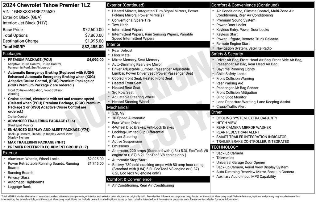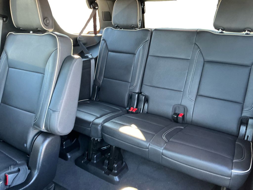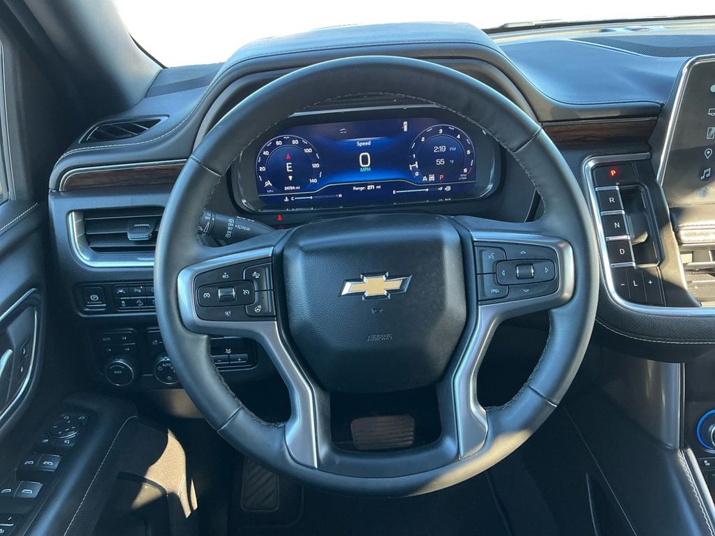 2024 Chevrolet Tahoe Premier Black Premier 4WD 10-Speed Automatic with Overdrive EcoTec3 5.3L V8 4WD, Jet Black Leather, 10 Speakers, 12-Way Power Driver & Passenger Seat Adjusters, 15" Diagonal Multi-Color Head-Up Display, 1st & 2nd Row Color-Keyed Carpeted Floor Mats, 2-Speed Active Electronic AutoTrac Transfer Case, 20" x 9" Polished Aluminum Wheels, 3.23 Rear Axle Ratio, 3rd Row 60/40 Power-Folding Split-Bench Seat, 3rd row seats: split-bench, 4-Wheel Disc Brakes, ABS brakes, Adaptive Cruise Control, Adaptive suspension, Advanced Trailering Package, Air Conditioning, Alloy wheels, AM/FM radio: SiriusXM with 360L, Apple CarPlay/Android Auto, Auto High-beam Headlights, Auto-dimming door mirrors, Auto-Dimming Inside Rear-View Mirror, Auto-dimming Rear-View mirror, Auto-leveling suspension, Automatic temperature control, Bose 10-Speaker Centerpoint Surround Audio Sys Ft, Brake assist, Bright Front & Rear Door Sill Plates, Bumpers: body-color, Chrome Door Handles w/Body-Color Strip, Chrome Mirror Caps, Color-Keyed Carpeting Floor Covering, Compass, Delay-off headlights, Driver & Front Outboard Passenger Airbags, Driver & Front Passenger Heated & Ventilated Seats, Driver door bin, Driver vanity mirror, Dual Exhaust System, Dual front impact airbags, Dual front side impact airbags, Dual-Pane Power Panoramic Sunroof, Electronic Stability Control, Emergency communication system: OnStar and Chevrolet connected services capable, Enhanced Automatic Emergency Braking, Enhanced Display & Alert Package, Enhanced Driver Information Center, Extra Capacity Cooling System, Floor Console, Four wheel independent suspension, Front anti-roll bar, Front Bucket Seats, Front Center Armrest, Front dual zone A/C, Front High-Back Reclining Bucket Seats, Front reading lights, Fully automatic headlights, Garage door transmitter, Hands-Free Rear Power Programmable Liftgate, HD Surround Vision, Heated 2nd Row Outboard Seats, Heated door mirrors, Heated Driver & Front Passenger Seats, Heated front seats, Heated rear seats, Heated Steering Wheel, Heated steering wheel, Hill Descent Control, Hitch View w/Pan/Zoom Image Adjustment, Illuminated entry, Infotainment Display, Inside Rearview Auto-Dimming Rear Camera Mirror, Integrated Trailer Brake Controller, Lane Change Alert w/Side Blind Zone Alert, LED Daytime Running Lamps, Low tire pressure warning, Magnetic Ride Control Suspension, Max Trailering Package, Memory seat, Memory Settings, Navigation System, Occupant sensing airbag, Outside Heated Power-Adjustable Mirrors, Outside temperature display, Overhead airbag, Overhead console, Panic alarm, Passenger door bin, Passenger vanity mirror, Perforated Leather Seat Trim, Power door mirrors, Power driver seat, Power Liftgate, Power passenger seat, Power Release 2nd Row Bucket Seats, Power steering, Power Tilt & Telescopic Steering Column, Power windows, Power-Retractable Assist Steps, Preferred Equipment Group 1LZ, Premium audio system: Chevrolet Infotainment 3 Premium, Premium Package, Radio: Chevrolet Infotainment 3 Premium System, Rain sensing wipers, Rear air conditioning, Rear anti-roll bar, Rear Camera Mirror Washer, Rear Cross Traffic Alert, Rear Pedestrian Alert, Rear reading lights, Rear window defroster, Rear window wiper, Remote keyless entry, Remote Start, Roof rack: xxxxxx, Safety Alert Seat, Security system, Set of 4 Wheel Locks (LPO), SiriusXM w/360L, Smart Trailer Integration Indicator, Speed control, Speed-sensing steering, Split folding rear seat, Spoiler, Steering wheel memory, Steering wheel mounted audio controls, Tachometer, Telescoping steering wheel, Tilt steering wheel, Traction control, Trailer Side Blind Zone Alert, Trip computer, Turn signal indicator mirrors, Universal Home Remote, Variably intermittent wipers, Ventilated front seats, Voltmeter, Wheels: 22" x 9" Polished Aluminum (RVA), Wireless Charging, Wrapped Steering Wheel, 4WD, Jet Black Leather.