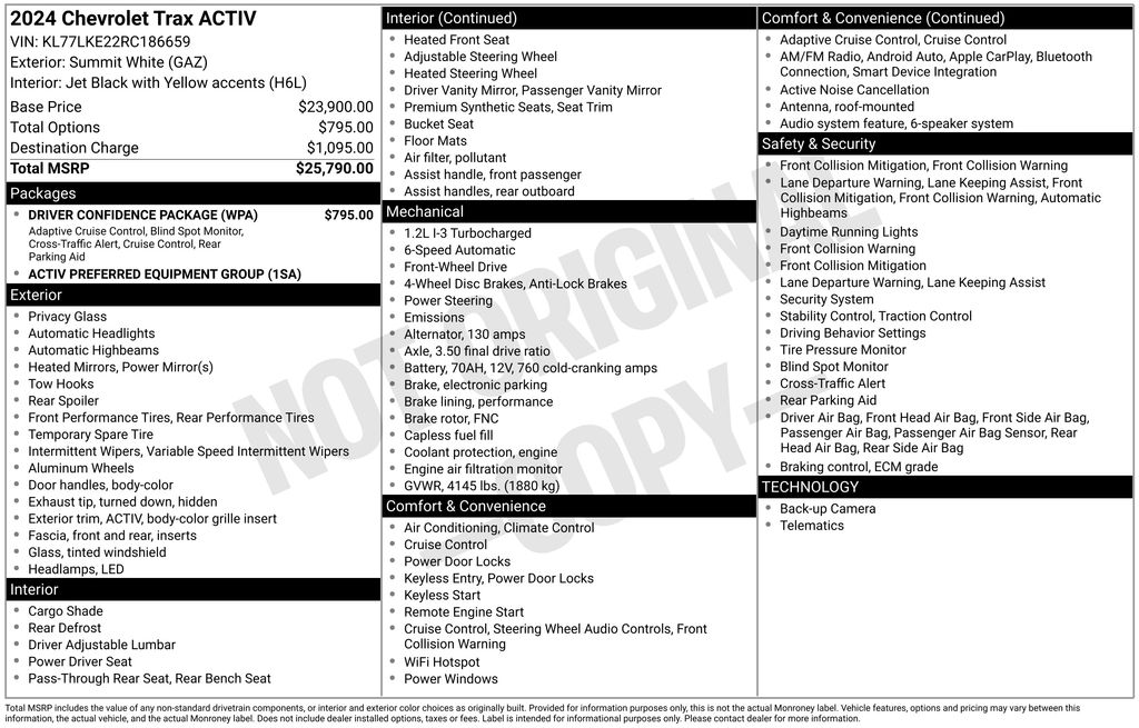 2024 Chevrolet Trax ACTIV Summit White ACTIV FWD 6-Speed Automatic 1.2L Ecotec Turbo DOHC DI w/VVT 2-Way Adjustable Front Head Restraints, 2-Way Power Driver Lumbar Seat Adjuster, 3.50 Final Drive Axle Ratio, 4-Way Manual Front Passenger Seat Adjuster, 4-Wheel Disc Brakes, 6 Speakers, 6-Speaker Audio System Feature, 8-Way Power Driver Seat Adjuster, ABS brakes, Adaptive Cruise Control, Air Conditioning, Alloy wheels, AM/FM radio: SiriusXM, Auto High-beam Headlights, Automatic temperature control, Brake assist, Bumpers: body-color, Compass, Delay-off headlights, Driver Confidence Package, Driver door bin, Driver vanity mirror, Dual front impact airbags, Dual front side impact airbags, Electronic Stability Control, Emergency communication system: OnStar and Chevrolet connected services capable, Evotex Seat Trim, Exterior Parking Camera Rear, Front anti-roll bar, Front Bucket Seats, Front Center Armrest, Front reading lights, Front wheel independent suspension, Fully automatic headlights, Heated door mirrors, Heated Driver & Front Passenger Seats, Heated front seats, Heated steering wheel, Illuminated entry, Lane Change Alert w/Side Blind Zone Alert, Low tire pressure warning, Occupant sensing airbag, Outside temperature display, Overhead airbag, Overhead console, Panic alarm, Passenger door bin, Passenger vanity mirror, Power door mirrors, Power driver seat, Power steering, Power windows, Preferred Equipment Group 1SA, Premium audio system: Chevrolet Infotainment 3, Radio data system, Radio: Audio System w/AM/FM, Rear Cross-Traffic Alert, Rear Park Assist (DISC), Rear window defroster, Rear window wiper, Remote keyless entry, Security system, SiriusXM, Speed control, Split folding rear seat, Spoiler, Steering wheel mounted audio controls, Tachometer, Telescoping steering wheel, Tilt steering wheel, Traction control, Trip computer, Variably intermittent wipers, Wheels: 18" Black-Painted Aluminum.