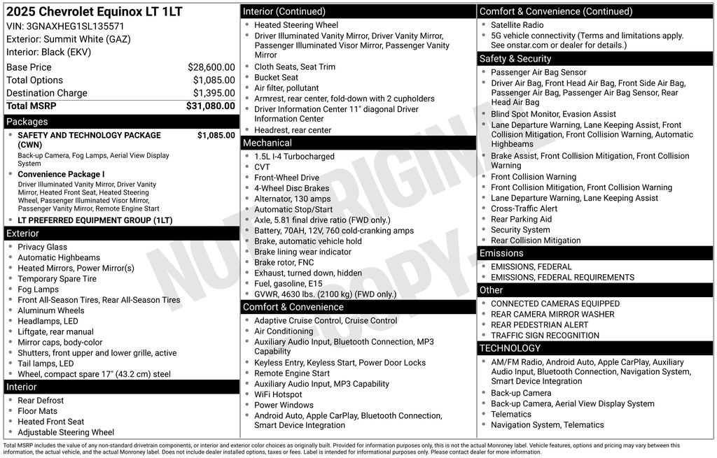 2025 Chevrolet Equinox LT Summit White LT FWD CVT 1.5L DOHC 4-Wheel Disc Brakes, 5.81 Final Drive Axle Ratio, 6 Speakers, ABS brakes, Air Conditioning, Alloy wheels, AM/FM radio: SiriusXM, Auto High-beam Headlights, Brake assist, Bumpers: body-color, Cloth Seat Trim, Compass, Delay-off headlights, Driver 6-Way Manual Seat Adjuster, Driver door bin, Driver vanity mirror, Dual front impact airbags, Dual front side impact airbags, Electronic Stability Control, Emergency communication system: OnStar and Chevrolet connected services capable, Four wheel independent suspension, Front anti-roll bar, Front Bucket Seats, Front Center Armrest, Front Fog Lamps, Front Passenger 4-Way Manual Seat Adjuster, Front reading lights, Fully automatic headlights, HD Surround Vision, Heated door mirrors, Heated Driver & Front Passenger Seats, Heated front seats, Heated steering wheel, Illuminated entry, Low tire pressure warning, Navigation System, Occupant sensing airbag, Outside temperature display, Overhead airbag, Overhead console, Panic alarm, Passenger door bin, Passenger vanity mirror, Power door mirrors, Power steering, Power windows, Preferred Equipment Group 1LT, Premium audio system: Chevrolet Infotainment 3, Radio data system, Radio: 11.3" Diagonal Advanced Color LCD Display, Rear anti-roll bar, Rear Camera Mirror Washer, Rear Pedestrian Alert, Rear reading lights, Rear seat center armrest, Rear window defroster, Rear window wiper, Remote keyless entry, Safety & Technology Package, Security system, SiriusXM, Speed control, Speed-sensing steering, Split folding rear seat, Spoiler, Steering wheel mounted audio controls, Tachometer, Telescoping steering wheel, Tilt steering wheel, Traction control, Traffic Sign Recognition, Trip computer, Variably intermittent wipers, Wheels: 17" Grazen Metallic Machined-Face Aluminum.