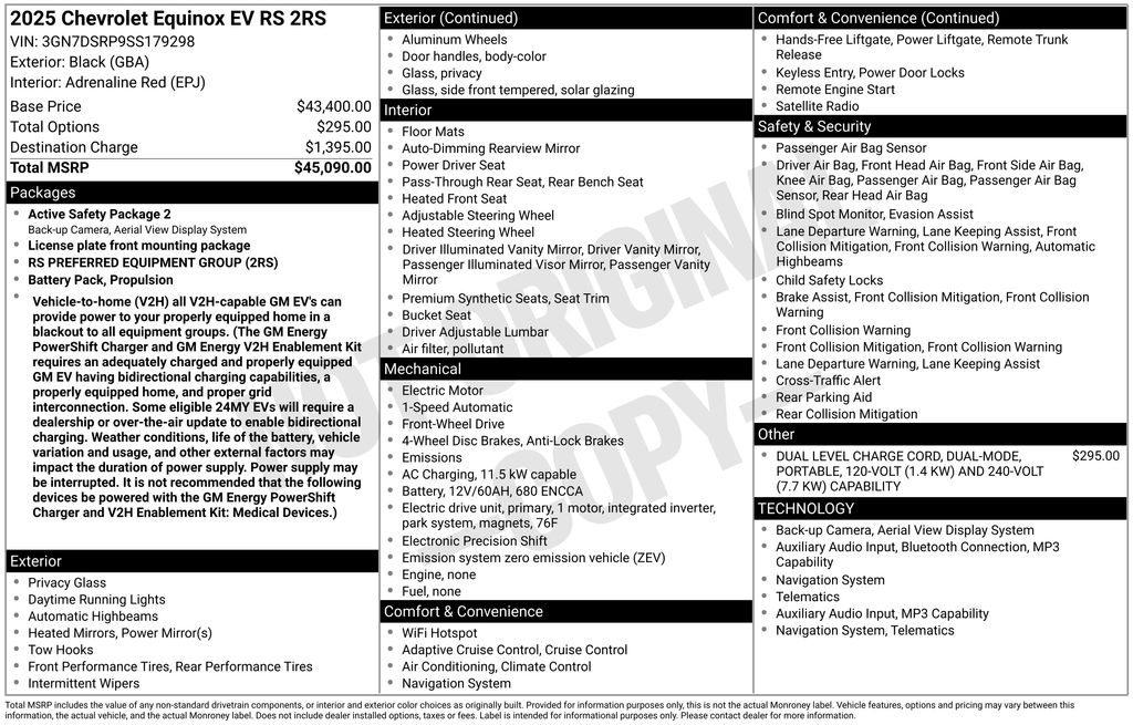 2025 Chevrolet Equinox EV RS Black RS FWD 1-Speed Automatic Electric Drive Unit 4-Wheel Disc Brakes, 6 Speakers, 6-Speaker Audio System Feature, 6-Way Manual Front Passenger Seat Adjuster, 8-Way Power Driver Seat Adjuster, ABS brakes, Air Conditioning, Alloy wheels, AM/FM radio: SiriusXM with 360L, Auto High-beam Headlights, Auto-dimming Rear-View mirror, Automatic temperature control, Brake assist, Bumpers: body-color, Compass, Delay-off headlights, Driver door bin, Driver vanity mirror, Dual front impact airbags, Dual front side impact airbags, Dual Level Charge Cord, Electronic Stability Control, Emergency communication system: OnStar and Chevrolet connected services capable, Evotex Seat Trim, Four wheel independent suspension, Front anti-roll bar, Front Bucket Seats, Front Center Armrest, Front reading lights, Fully automatic headlights, Heated door mirrors, Heated Driver and Front Passenger Seats Cushion and Seatback, Heated front seats, Heated steering wheel, Illuminated entry, Knee airbag, Low tire pressure warning, Navigation system: Google built-in compatibility (select service plan required, terms and limitations apply), Occupant sensing airbag, Outside temperature display, Overhead airbag, Overhead console, Panic alarm, Passenger door bin, Passenger vanity mirror, Power door mirrors, Power Driver Lumbar Control, Power driver seat, Power Liftgate, Power steering, Power windows, Preferred Equipment Group 2RS, Radio: 17.7" Diagonal Advanced Color LCD Display, Rear anti-roll bar, Rear reading lights, Rear seat center armrest, Rear window defroster, Rear window wiper, Remote keyless entry, Security system, SiriusXM with 360L Trial Subscription, Speed control, Split folding rear seat, Spoiler, Sport steering wheel, Steering wheel mounted audio controls, Telescoping steering wheel, Tilt steering wheel, Traction control, Trip computer, Turn signal indicator mirrors, Variably intermittent wipers, Wheels: 21" Black Painted Aluminum.