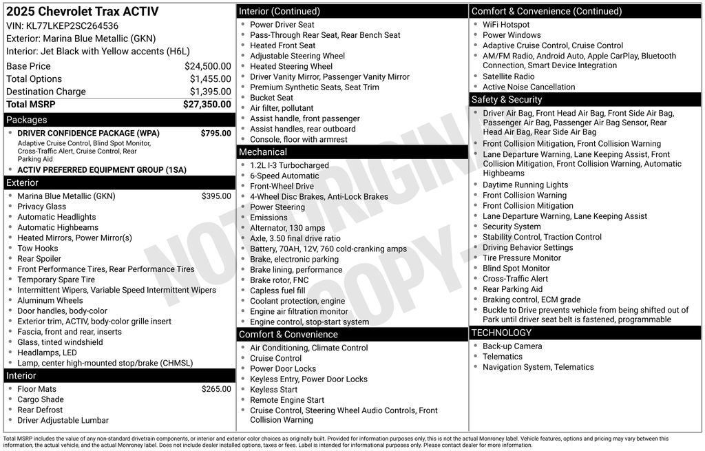 2025 Chevrolet Trax ACTIV Marina Blue Metallic ACTIV FWD 6-Speed Automatic 1.2L I3 DI Turbocharged DOHC 12V LEV3-ULEV70 137hp 2-Way Adjustable Front Head Restraints, 2-Way Power Driver Lumbar Seat Adjuster, 3.50 Final Drive Axle Ratio, 4-Way Manual Front Passenger Seat Adjuster, 4-Wheel Disc Brakes, 6 Speakers, 6-Speaker Audio System Feature, 8-Way Power Driver Seat Adjuster, ABS brakes, Adaptive Cruise Control, Air Conditioning, Alloy wheels, AM/FM radio: SiriusXM, Auto High-beam Headlights, Automatic temperature control, Brake assist, Bumpers: body-color, Compass, Delay-off headlights, Driver Confidence Package, Driver door bin, Driver vanity mirror, Dual front impact airbags, Dual front side impact airbags, Electronic Stability Control, Emergency communication system: OnStar One Essentials, Evotex Seat Trim, Exterior Parking Camera Rear, Front and Rear All-Weather Floor Liners, Front anti-roll bar, Front Bucket Seats, Front Center Armrest, Front reading lights, Front wheel independent suspension, Fully automatic headlights, Heated door mirrors, Heated Driver and Front Passenger Seats, Heated front seats, Heated steering wheel, Illuminated entry, Lane Change Alert with Side Blind Zone Alert, Leather steering wheel, Low tire pressure warning, Occupant sensing airbag, Outside temperature display, Overhead airbag, Overhead console, Panic alarm, Passenger door bin, Passenger vanity mirror, Power door mirrors, Power driver seat, Power steering, Power windows, Preferred Equipment Group 1SA, Premium audio system: Chevrolet Infotainment 3, Radio data system, Radio: AM/FM Stereo Audio System, Rear Cross-Traffic Alert, Rear Park Assist, Rear window defroster, Rear window wiper, Remote keyless entry, Security system, SiriusXM Trial Subscription, Speed control, Split folding rear seat, Spoiler, Steering wheel mounted audio controls, Tachometer, Telescoping steering wheel, Tilt steering wheel, Traction control, Trip computer, Variably intermittent wipers, Wheels: 18" Black-Painted Aluminum.