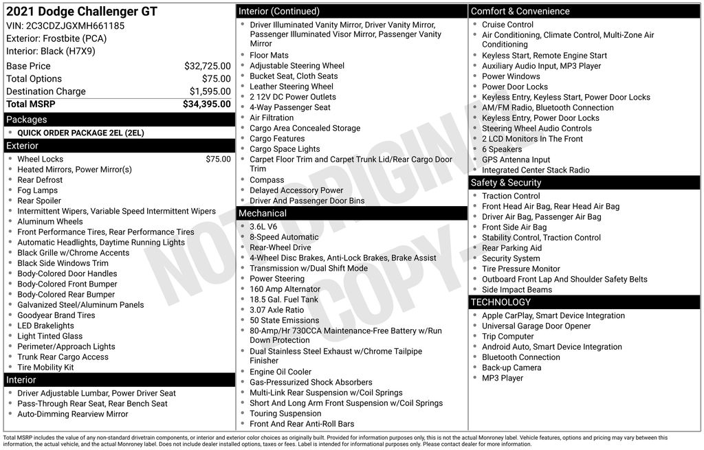 2021 Dodge Challenger GT Frostbite GT RWD 8-Speed Automatic 3.6L V6 24V VVT 4-Wheel Disc Brakes, 6 Speakers, ABS brakes, Air Conditioning, Alloy wheels, AM/FM radio, Anti-whiplash front head restraints, Apple CarPlay, Apple CarPlay/Android Auto, Auto-dimming Rear-View mirror, Automatic temperature control, Brake assist, Bumpers: body-color, Compass, Delay-off headlights, Driver door bin, Driver vanity mirror, Dual front impact airbags, Dual front side impact airbags, Electronic Stability Control, Four wheel independent suspension, Front anti-roll bar, Front Bucket Seats, Front Center Armrest, Front dual zone A/C, Front fog lights, Front reading lights, Fully automatic headlights, Garage door transmitter, Google Android Auto, GPS Antenna Input, Heated door mirrors, Houndstooth Cloth Performance Seats, Illuminated entry, Integrated Center Stack Radio, Integrated Voice Command w/Bluetooth, Leather Shift Knob, Low tire pressure warning, Media Hub (2 USB, AUX), Outside temperature display, Overhead airbag, Overhead console, Panic alarm, ParkView Rear Back-Up Camera, Passenger door bin, Passenger vanity mirror, Power door mirrors, Power driver seat, Power steering, Power windows, Quick Order Package 2EL, Radio data system, Radio: Uconnect 4 w/7" Display, Rear anti-roll bar, Rear reading lights, Rear seat center armrest, Rear window defroster, Remote keyless entry, Security system, Speed control, Speed-sensing steering, Split folding rear seat, Spoiler, Sport steering wheel, Steering wheel mounted audio controls, Tachometer, Telescoping steering wheel, Tilt steering wheel, Traction control, Trip computer, USB Host Flip, Variably intermittent wipers, Wheels: 20" x 8.0" Satin Carbon Painted.
