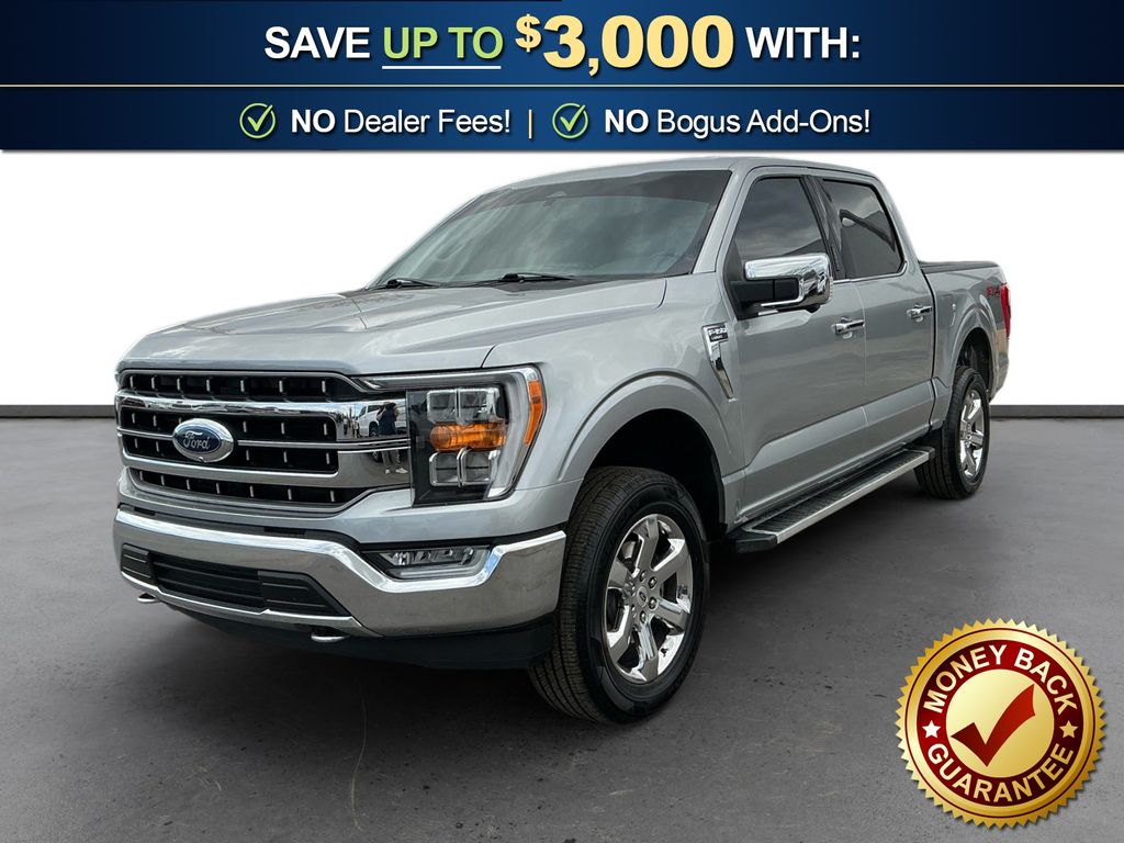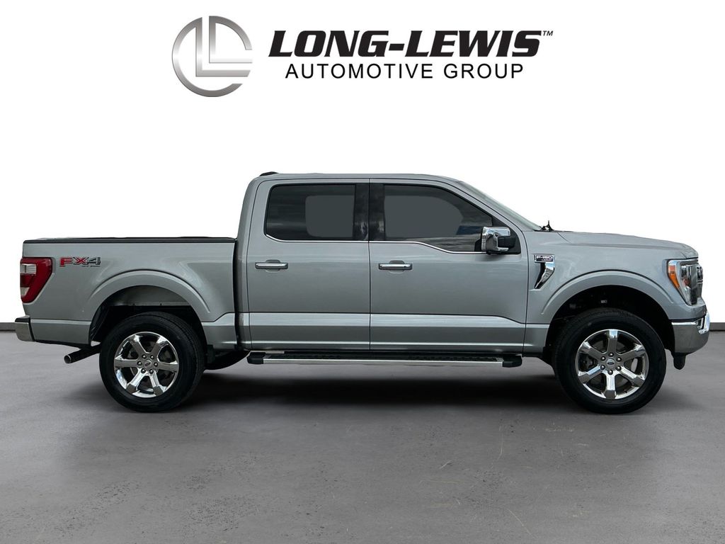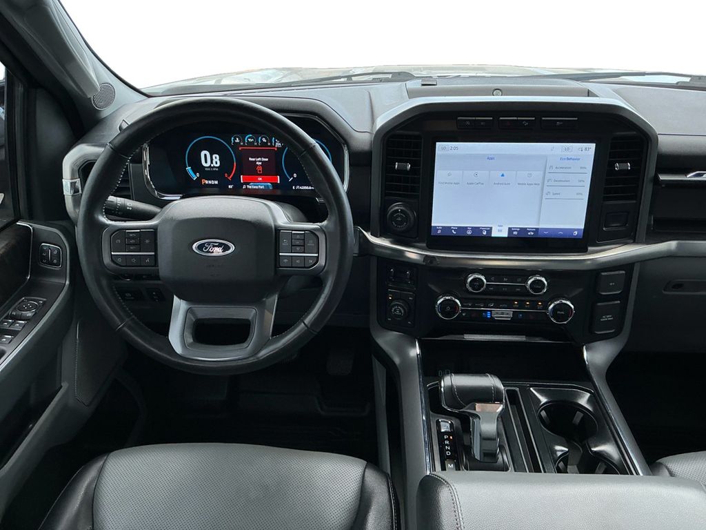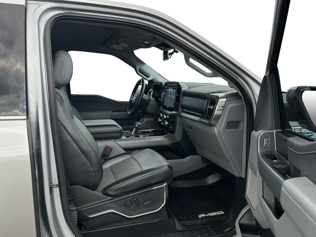 2023 Ford F-150 Lariat Iconic Silver Metallic Lariat 4WD 10-Speed Automatic 5.0L V8 4WD, 360 Degree Camera, 4-Wheel Disc Brakes, 8 Speakers, ABS brakes, Adjustable pedals, Air Conditioning, Alloy wheels, AM/FM radio: SiriusXM with 360L, Auto High-beam Headlights, Auto-dimming door mirrors, Auto-dimming Rear-View mirror, Automatic temperature control, Bed Divider, BoxLink, Brake assist, Bumpers: chrome, Center High-Mounted Stop Lamp CHMSL Camera Removal, Chrome wheels, Class IV Trailer Hitch Receiver, Compass, Delay-off headlights, Driver door bin, Driver vanity mirror, Dual front impact airbags, Dual front side impact airbags, Electronic Stability Control, Emergency communication system: SYNC 4 911 Assist, Equipment Group 501A Standard, Extended Range 36 Gallon Fuel Tank, Exterior Parking Camera Rear, Front anti-roll bar, Front Bucket Seats, Front Center Armrest, Front dual zone A/C, Front fog lights, Front License Plate Bracket, Front reading lights, Front wheel independent suspension, Fully automatic headlights, FX4 Off-Road Package, Garage door transmitter, Heated door mirrors, Heated front seats, Heated steering wheel, Illuminated entry, Inclination/Intrusion Sensor Removal, Integrated Trailer Brake Controller, Leather-Trimmed Bucket Seats, LED Sideview Mirror Spotlights, Low tire pressure warning, Max Trailer Tow Package, Memory seat, Occupant sensing airbag, Outside temperature display, Overhead airbag, Overhead console, Panic alarm, Passenger door bin, Passenger vanity mirror, Pedal memory, Power door mirrors, Power driver seat, Power passenger seat, Power steering, Power windows, Pro Trailer Backup Assist & Pro Trailer Hitch Assist, Radio data system, Radio: B&O Sound System by Bang & Olufsen, Rear reading lights, Rear seat center armrest, Rear step bumper, Rear window defroster, Remote keyless entry, Security system, Speed control, Speed-sensing steering, Split folding rear seat, Steering Wheel Heat Removal (DISC), Steering wheel mounted audio controls, SYNC 4 w/Enhanced Voice Recognition, Tachometer, Telescoping steering wheel, Tilt steering wheel, Traction control, Tray Style Floor Liner (47W), Trip computer, Turn signal indicator mirrors, Variably intermittent wipers, Ventilated front seats, Voltmeter, Wheels: 18" Chrome-Like PVD, Wheels: 20" Chrome-Like PVD, Wireless Charging Pad, 4WD.