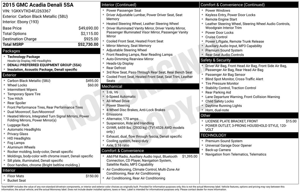 2015 GMC Acadia Denali Carbon Black Metallic Denali AWD 6-Speed Automatic 3.6L V6 SIDI AWD, Ebony Leather, 10 Speakers, 120-Volt 3-Prong Household-Style Power Outlet, 1st & 2nd Row All-Weather Floor Mats, 2-Position Memory For Driver's Seat Adjuster, 20" x 7.5" Aluminum Wheels, 3.16 Axle Ratio, 3rd row seats: split-bench, 4-Wheel Disc Brakes, 7-Passenger Seating (2-2-3 Seating Configuration), 8-Passenger Seating (2-3-3 Seating Configuration), 8-Way Power Driver Seat, 8-Way Power Passenger Seat Adjuster, ABS brakes, Air Conditioning, Alloy wheels, AM/FM radio: SiriusXM, Auto-dimming door mirrors, Auto-dimming Rear-View mirror, Automatic temperature control, Body-Color Moldings w/Chrome Insert, Bodyside moldings, Bose Advanced 10-Speaker Audio System, Bose Premium 10-Speaker Audio System, Brake assist, Bumpers: body-color, CD player, Compass, Delay-off headlights, Denali Specific Acoustic Insulation Package, Denali Specific Body-Color Rocker Molding, Denali Specific Bright Side Rails Luggage Rack, Denali Specific Dual Flow Through Fascia Exhaust, Denali Specific Front Fascia, Denali Specific Illuminated Sill Plate, Driver door bin, Driver vanity mirror, Dual front impact airbags, Dual front side impact airbags, Dual SkyScape 2-Panel Power Sunroof, Electronic Stability Control, Emergency communication system: OnStar Directions & Connections, Exterior Parking Camera Rear, Forward Collision Alert & Lane Departure Warning, Four wheel independent suspension, Front anti-roll bar, Front Bucket Seats, Front Center Armrest w/Storage, Front dual zone A/C, Front fog lights, Front License Plate Bracket, Front reading lights, Fully automatic headlights, Garage door transmitter, Head-Up Display, Heads-Up Display, Heated & Cooled Front Seats, Heated door mirrors, Heated front seats, Heated Leather Wrapped Steering Wheel, Heated Power-Adjustable Outside Mirrors, Heated steering wheel, Heavy-Duty Cooling System, High-Intensity Discharge Headlights, High-Intensity Discharge Projector Low Beam Headlamps, Illuminated entry, Inside Rear-View Auto-Dimming Mirror, Leather Shift Knob, Leather steering wheel, Leather-Wrapped Steering Wheel w/Wood Trim, Low tire pressure warning, Memory seat, Navigation System, NavTraffic, Occupant sensing airbag, Outside temperature display, Overhead airbag, Overhead console, Panic alarm, Passenger door bin, Passenger vanity mirror, Perforated Leather-Appointed Seat Trim, Power door mirrors, Power driver seat, Power Liftgate, Power moonroof: Dual SkyScape, Power passenger seat, Power Rear Liftgate Body, Power steering, Power Tilt & Telescopic Steering Column, Power windows, Power Windows w/Driver Express-Up & -Down, Preferred Equipment Group 5SA, Premium Carpeted Front 2nd & 3rd Row Floor Mats, Radio data system, Radio: Color Touch Navigation w/IntelliLink, Radio: Color Touch w/Navigation & IntelliLink, Rear air conditioning, Rear anti-roll bar, Rear audio controls, Rear Audio System Controls, Rear Cargo Area Audio System Controls, Rear Parking Sensors, Rear reading lights, Rear Seat Entertainment System, Rear window defroster, Rear window wiper, Remote keyless entry, Remote Vehicle Start, Roof rack: rails only, Security system, Side Blind Zone Alert & Rear Cross Traffic Alert, SiriusXM Satellite Radio, Speed control, Speed-sensing steering, Spoiler, Steering wheel memory, Steering Wheel Mounted Audio Controls, Steering wheel mounted audio controls, Tachometer, Technology Package, Telescoping steering wheel, Tilt steering wheel, Traction control, Trailer Hitch, Trailering Equipment, Tri-Zone Automatic Climate Control, Trip computer, Turn signal indicator mirrors, Universal Home Remote, Variable Effort Power Steering, Variably intermittent wipers, Ventilated front seats, Voltmeter, Wheel Locks, AWD, Ebony Leather.
