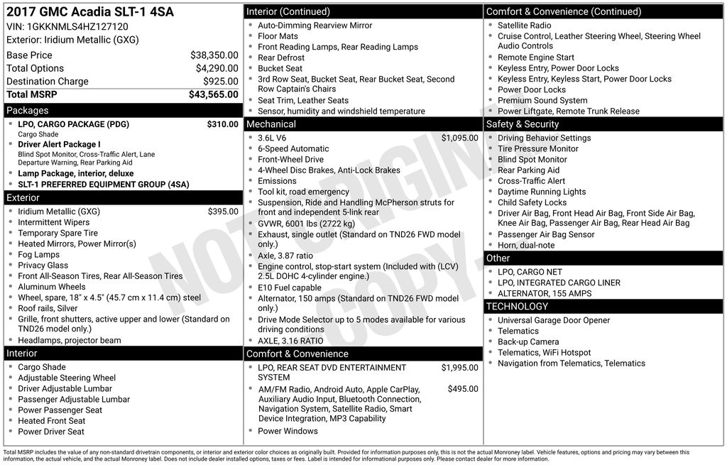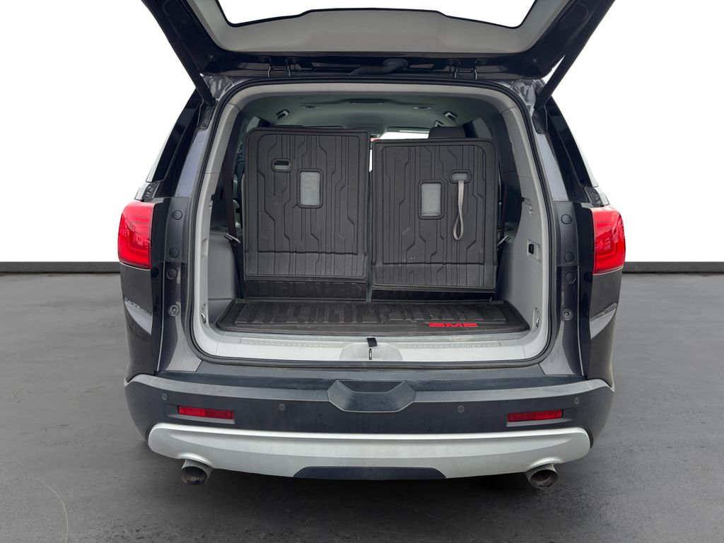 2017 GMC Acadia SLT-1 Iridium Metallic SLT-1 FWD 6-Speed Automatic 3.6L V6 SIDI DOHC VVT FWD, Cocoa/ Light Ash Gray Leather, 155 Amp Alternator, 18" x 7.5" Aluminum (4) Wheels, 3rd row seats: split-bench, 4-Wheel Disc Brakes, 6-Passenger (2-2-2 Seating Configuration), 8 Speakers, ABS brakes, Air Conditioning, Alloy wheels, AM/FM radio: SiriusXM, Apple CarPlay/Android Auto, Auto-dimming door mirrors, Auto-dimming Rear-View mirror, Automatic temperature control, Brake assist, Bumpers: body-color, Cargo Package (LPO), Compass, Delay-off headlights, Driver door bin, Driver vanity mirror, Dual front impact airbags, Dual front side impact airbags, Electronic Stability Control, Emergency communication system: OnStar Guidance, Exterior Parking Camera Rear, Four wheel independent suspension, Front anti-roll bar, Front Bucket Seats, Front Center Armrest, Front dual zone A/C, Front fog lights, Front reading lights, Fully automatic headlights, Garage door transmitter, Heated door mirrors, Heated front seats, Illuminated entry, Integrated Cargo Liner (LPO), Knee airbag, Low tire pressure warning, Occupant sensing airbag, Outside temperature display, Overhead airbag, Overhead console, Panic alarm, Passenger door bin, Passenger vanity mirror, Perforated Leather-Appointed Seat Trim, Power door mirrors, Power driver seat, Power Liftgate, Power passenger seat, Power steering, Power windows, Preferred Equipment Group 4SA, Premium audio system: IntelliLink, Radio data system, Radio: AM/FM 8" Diagonal Color Touch Navigation, Radio: AM/FM 8" Diagonal Color Touch Screen, Rear air conditioning, Rear anti-roll bar, Rear reading lights, Rear Seat DVD Entertainment System, Rear window defroster, Rear window wiper, Remote keyless entry, Retractable Cargo Shade, Roof rack: rails only, Security system, SiriusXM Satellite Radio, Speed control, Speed-sensing steering, Spoiler, Steering wheel mounted audio controls, Tachometer, Telescoping steering wheel, Tilt steering wheel, Traction control, Trip computer, Variably intermittent wipers, Vertical Cargo Net (LPO), Voltmeter, FWD, Cocoa/ Light Ash Gray Leather.
