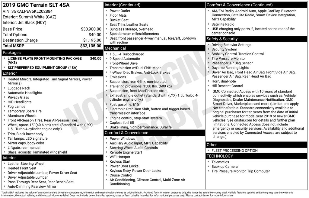 2019 GMC Terrain SLT Summit White SLT FWD 9-Speed Automatic 1.5L DOHC 2 USB Data Ports, 2 USB Data Ports w/SD Card Reader, 3.47 Axle Ratio, 4-Way Manual Front Passenger Seat, 4-Wheel Disc Brakes, 6 Speakers, 6-Speaker Audio System Feature, 8-Way Power Driver Seat Adjuster, ABS brakes, Air Conditioning, Alloy wheels, AM/FM radio: SiriusXM, Apple CarPlay/Android Auto, Auto-dimming door mirrors, Auto-dimming Rear-View mirror, Automatic temperature control, Bluetooth® For Phone, Brake assist, Bumpers: body-color, Compass, Delay-off headlights, Driver & Front Passenger Heated Seats, Driver door bin, Driver vanity mirror, Dual front impact airbags, Dual front side impact airbags, Electronic Stability Control, Emergency communication system, Exterior Parking Camera Rear, Four wheel independent suspension, Front anti-roll bar, Front Bucket Seats, Front Center Armrest, Front dual zone A/C, Front fog lights, Front reading lights, Fully automatic headlights, Heated door mirrors, Heated front seats, High-Intensity Discharge Headlights, Illuminated entry, License Plate Front Mounting Package, Low tire pressure warning, Occupant sensing airbag, Outside temperature display, Overhead airbag, Overhead console, Panic alarm, Passenger door bin, Passenger vanity mirror, Perforated Leather-Appointed Seat Trim, Power door mirrors, Power Driver Lumbar Control, Power driver seat, Power steering, Power windows, Preferred Equipment Group 4SA, Radio data system, Radio: GMC Infotainment Audio System w/8" Display, Rear anti-roll bar, Rear seat center armrest, Rear window defroster, Rear window wiper, Remote keyless entry, Roof rack: rails only, Security system, SiriusXM Radio, Speed control, Speed-sensing steering, Split folding rear seat, Spoiler, Steering wheel mounted audio controls, Tachometer, Telescoping steering wheel, Tilt steering wheel, Traction control, Trip computer, Turn signal indicator mirrors, Variably intermittent wipers, Wheels: 18" x 7" Machined Aluminum w/Gray Accents.