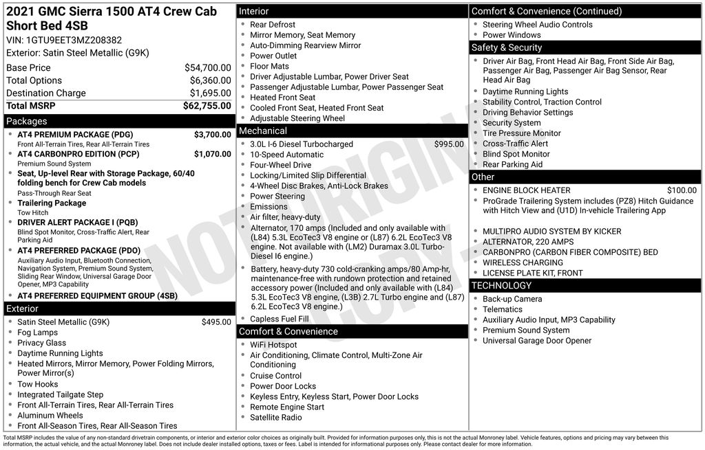 2021 GMC Sierra 1500 AT4 Satin Steel Metallic AT4 4WD 10-Speed Automatic 3.0L I6 10-Speed Automatic, 4WD, Jet Black With Kalahari Accents Leather, 10-Way Power Driver Seat Adjuster w/Lumbar, 10-Way Power Passenger Seat Adjuster w/Lumbar, 12-Volt Rear Auxiliary Power Outlet, 120-Volt Bed Mounted Power Outlet, 120-Volt Instrument Panel Power Outlet, 170 Amp Alternator, 18" x 8.5" Machined Aluminum Wheels, 2 USB Ports, 2 USB Ports (1st Row), 220 Amp Alternator, 3.23 Rear Axle Ratio, 4-Wheel Disc Brakes, 4.2" Diagonal Color Display Driver Info Center, 4G LTE Wi-Fi Hotspot Capable, 6 Speakers, 6-Speaker Audio System Feature, ABS brakes, Air Conditioning, Alloy wheels, AM/FM radio: SiriusXM with 360L, Apple CarPlay/Android Auto, AT4 Carbon Hard Badge, AT4 CarbonPro Edition, AT4 High Clearance Step (LPO), AT4 Preferred Package, AT4 Premium Package, Auto-dimming door mirrors, Auto-dimming Rear-View mirror, Auto-Locking Rear Differential, Automatic temperature control, Auxiliary External Transmission Oil Cooler, Black Dual Exhaust Tips, Body-Color Surround Grille, Brake assist, Bumpers: body-color, CarbonPro (Carbon Fiber Composite) Bed, Color-Keyed Carpeting Floor Covering, Compass, Deep-Tinted Glass, Delay-off headlights, Driver Alert Package I, Driver door bin, Driver Memory, Driver vanity mirror, Dual front impact airbags, Dual front side impact airbags, Electric Rear-Window Defogger, Electrical Lock Control Steering Column, Electronic Stability Control, Engine Block Heater, Floor-Mounted Center Console, Front anti-roll bar, Front Bucket Seats, Front Center Armrest, Front dual zone A/C, Front fog lights, Front License Plate Kit, Front Prem Floor Liners w/Removable Carpet Insert, Front reading lights, Front wheel independent suspension, Fully automatic headlights, GMC Connected Access Capable, HD Rear Vision Camera, Heated 2nd Row Outboard Seats, Heated door mirrors, Heated Driver & Front Outboard Passenger Seating, Heated front seats, Heated steering wheel, Heavy-Duty Air Filter, Hill Descent Control, Hitch Guidance, Hitch Guidance w/Hitch View, Illuminated entry, In-Vehicle Trailering App, Integrated Trailer Brake Controller, Keyless Open & Start, Lane Change Alert w/Side Blind Zone Alert, LED Cargo Area Lighting, Low tire pressure warning, Manual Tilt-Wheel & Telescoping Steering Column, Memory seat, MultiPro Audio System by Kicker, Occupant sensing airbag, Off-Road Suspension, OnStar & GMC Connected Services Capable, Outside temperature display, Overhead airbag, Overhead console, Panic alarm, Passenger door bin, Passenger vanity mirror, Perforated Leather-Appointed Front Seat Trim, Perimeter Lighting, Power Door Locks, Power door mirrors, Power driver seat, Power Front Passenger Windows w/Express Up/Down, Power Front Windows w/Driver Express Up/Down, Power passenger seat, Power Rear Windows w/Express Down, Power Sliding Rear Window w/Rear Defogger, Power steering, Power windows, Preferred Equipment Group 4SB, Premium audio system: GMC Infotainment System, Premium Bose 7-Speaker Sound System, ProGrade Trailering System, Radio data system, Radio: Premium GMC Infotainment Sys w/Multi-Touch, Radio: Premium GMC Infotainment Sys w/Navigation, Rear Cross Traffic Alert, Rear Dual USB Charging-Only Ports, Rear Prem Floor Liners w/Removable Carpet Insert, Rear reading lights, Rear seat center armrest, Rear step bumper, Rear Wheelhouse Liners, Rear window defroster, Red Recovery Hooks, Remote keyless entry, Remote Vehicle Starter System, Security system, SiriusXM w/360L, Speed control, Speed-sensing steering, Split folding rear seat, Spray-On Pickup Bed Liner w/AT4 Logo, Steering Wheel Audio Controls, Steering wheel mounted audio controls, Tachometer, Telescoping steering wheel, Theft Deterrent System (Unauthorized Entry), Tilt steering wheel, Traction control, Trailering Package, Trip computer, Ultrasonic Front & Rear Park Assist, Unique Grille Surround w/Black Chrome Finish, Universal Home Remote, Variably intermittent wipers, Ventilated