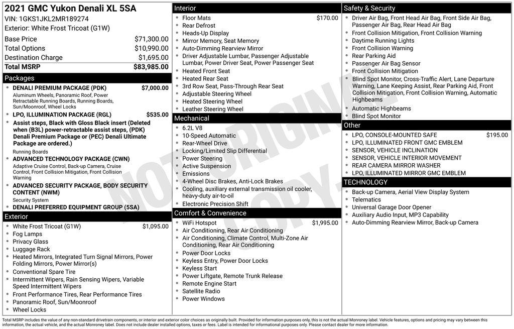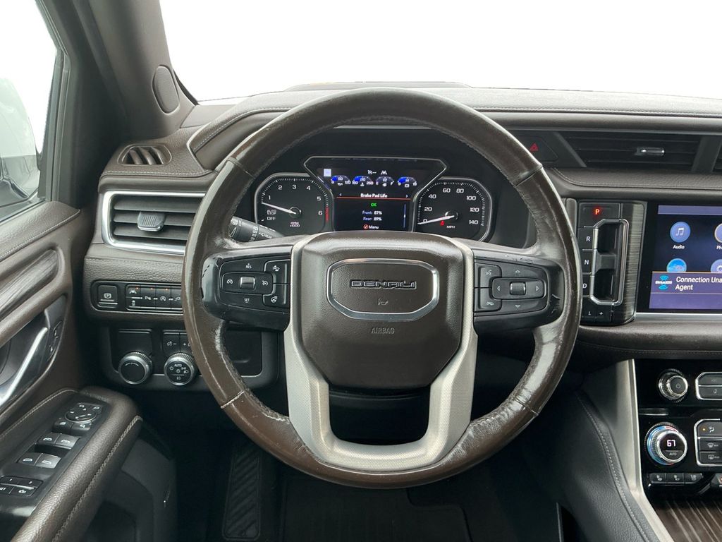 2021 GMC Yukon XL Denali White Frost Tricoat Denali RWD 10-Speed Automatic with Overdrive EcoTec3 6.2L V8 12-Way Power Seat Adjusters, 14 Speakers, 15" Diagonal Multi-Color Head-Up Display, 2 Presets For Outside Rearview Mirrors, 3.23 Rear Axle Ratio, 3rd Row 60/40 Power-Folding Split-Bench Seat, 3rd row seats: split-bench, 4-Wheel Disc Brakes, ABS brakes, Adaptive Cruise Control, Adaptive suspension, Advanced Security Package, Advanced Technology Package, Air Conditioning, All-Weather Floor Mats, Alloy wheels, AM/FM radio: SiriusXM with 360L, Apple CarPlay/Android Auto, Auto High-beam Headlights, Auto-dimming door mirrors, Auto-dimming Rear-View mirror, Auto-leveling suspension, Automatic Emergency Braking, Automatic temperature control, Bodyside moldings, Bose 14-Speaker Surround w/CenterPoint, Brake assist, Bright Front & Rear Door Sill Plates, Bumpers: body-color, Chrome Door Handles w/Body-Color Strip, Compass, Console-Mounted Safe (LPO), Delay-off headlights, Denali Premium Package, Driver door bin, Driver vanity mirror, Dual Exhaust System, Dual front impact airbags, Dual front side impact airbags, Dual-Pane Panoramic Power Sunroof, Electronic Stability Control, Emergency communication system: OnStar and GMC connected services capable, Enhanced Automatic Emergency Braking, Following Distance Indicator, Forward Collision Alert, Four wheel independent suspension, Front & Rear Park Assist, Front anti-roll bar, Front Bucket Seats, Front Center Armrest, Front dual zone A/C, Front fog lights, Front Pedestrian Braking, Front reading lights, Fully automatic headlights, Galvano Bodyside Moldings, Garage door transmitter, Glass Breakage Sensor, Hands-Free Power Programmable Rear Liftgate, HD Radio, HD Surround Vision, Heads-Up Display, Heated & Ventilated Driver & Front Passenger Seats, Heated 2nd Row Outboard Position Seats, Heated Automatic Steering Wheel, Heated door mirrors, Heated Driver & Front Passenger Seats, Heated front seats, Heated rear seats, Heated steering wheel, Illuminated entry, Illuminated Front GMC Emblem (LPO), Illuminated Mirror GMC Emblem (LPO), Illumination Package (LPO), Inside Rear-View Auto-Dimming Mirror, Inside Rearview Auto-Dimming Rear Camera Mirror, IntelliBeam Automatic High Beam On/Off, Lane Change Alert w/Side Blind Zone Alert, Lane Keep Assist w/Lane Departure Warning, Leather steering wheel, Low tire pressure warning, Magnetic Ride Control Suspension, Memory seat, Navigation System, Occupant sensing airbag, Outside Heated Power-Adjustable Mirrors, Outside temperature display, Overhead airbag, Overhead console, Panic alarm, Passenger door bin, Passenger vanity mirror, Perforated Leather Seating Surfaces, Power door mirrors, Power driver seat, Power Liftgate, Power passenger seat, Power Release 2nd Row Bucket Seats, Power steering, Power Tilt & Telescopic Steering Column, Power windows, Power-Retractable Assist Steps, Preferred Equipment Group 5SA, Radio: AM/FM/SiriusXM w/Navigation, Rain sensing wipers, Rear air conditioning, Rear anti-roll bar, Rear Camera Mirror Washer, Rear Cross Traffic Alert, Rear Pedestrian Alert, Rear reading lights, Rear Seat Media System, Rear window defroster, Rear window wiper, Remote keyless entry, Roof rack: rails only, Safety Alert Seat, Security system, SiriusXM w/360L, Speed control, Speed-sensing steering, Split folding rear seat, Spoiler, Steering wheel memory, Steering wheel mounted audio controls, Tachometer, Telescoping steering wheel, Theft-Deterrent Alarm System, Tilt steering wheel, Traction control, Trip computer, Turn signal indicator mirrors, Universal Home Remote, Variably intermittent wipers, Vehicle Inclination Sensor, Vehicle Interior Movement Sensor, Ventilated front seats, Voltmeter, Wheel Locks, Wheels: 20" x 9" 6-Spoke Polished Aluminum, Wheels: 22" x 9" Bright Machined Aluminum.
