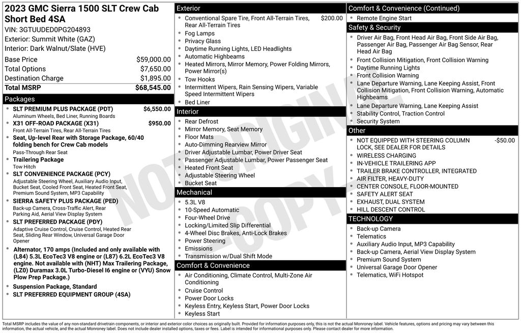 2023 GMC Sierra 1500 SLT Summit White SLT 4WD 10-Speed Automatic EcoTec3 5.3L V8 10-Speed Automatic, 4WD, Dark Walnut/Slate Leather, 10-Way Power Driver Seat Adjuster w/Lumbar, 10-Way Power Passenger Seat Adjuster w/Lumbar, 120-Volt Bed Mounted Power Outlet, 120-Volt Instrument Panel Power Outlet, 170 Amp Alternator, 2 Charge/Data USB Ports, 2 Charge/Data USB Ports Inside Center Console, 2 Type-C Charge-Only Rear USB Ports, 20" Polished Aluminum Wheels, 3.23 Rear Axle Ratio, 4-Wheel Disc Brakes, 6 Speakers, 6-Speaker Audio System Feature, ABS brakes, Adaptive Cruise Control, Air Conditioning, Alloy wheels, AM/FM radio, Apple CarPlay/Android Auto, Auto High-beam Headlights, Auto-dimming door mirrors, Auto-dimming Rear-View mirror, Auto-Locking Rear Differential, Automatic Emergency Braking, Automatic temperature control, Auxiliary External Transmission Oil Cooler, Brake assist, Buckle to Drive, Bumpers: chrome, Chrome Header & Chrome Grille Insert Bars, Chrome Wheel To Wheel Assist Steps, Color-Keyed Carpeting Floor Covering, Compass, Deep-Tinted Glass, Delay-off headlights, Driver door bin, Driver Memory, Driver vanity mirror, Dual Exhaust System, Dual front impact airbags, Dual front side impact airbags, Electric Rear-Window Defogger, Electrical Steering Column Lock, Electronic Precision Shift, Electronic Stability Control, Emergency communication system: OnStar and GMC connected services capable, Floor-Mounted Center Console, Following Distance Indicator, Forward Collision Alert, Front 40/20/40 Split-Bench Seat, Front anti-roll bar, Front Bucket Seats, Front Center Armrest w/Storage, Front dual zone A/C, Front fog lights, Front Frame-Mounted Black Recovery Hooks, Front Pedestrian Braking, Front Rainsensing Wipers, Front reading lights, Front wheel independent suspension, Fully automatic headlights, GMC Connected Access Capable, HD Rear Vision Camera, HD Surround Vision, Heated 2nd Row Outboard Seats, Heated door mirrors, Heated Driver & Front Outboard Passenger Seating, Heated front seats, Heated steering wheel, Heavy-Duty Air Filter, High Capacity Suspension Package, Hill Descent Control, Hitch Guidance, Hitch Guidance w/Hitch View, Illuminated entry, In-Vehicle Trailering App, Integrated Trailer Brake Controller, IntelliBeam Automatic High Beam On/Off, Keyless Open & Start, Lane Keep Assist w/Lane Departure Warning, LED Cargo Area Lighting, Low tire pressure warning, Manual Tilt-Wheel & Telescoping Steering Column, Memory seat, Navigation System, Not Equipped w/Steering Column Lock, Occupant sensing airbag, Off-Road Suspension, OnStar & GMC Connected Services Capable, Outside temperature display, Overhead airbag, Overhead console, Panic alarm, Passenger door bin, Passenger vanity mirror, Perf Leather-Appointed Front Outboard Seat Trim, Perimeter Lighting, Power Door Locks, Power door mirrors, Power driver seat, Power Front Passenger Windows w/Express Up/Down, Power Front Windows w/Driver Express Up/Down, Power passenger seat, Power Rake & Telescoping Steering Column, Power Rear Windows w/Express Down, Power Sliding Rear Window w/Rear Defogger, Power steering, Power windows, Preferred Equipment Group 4SA, Premium audio system: GMC Infotainment System, Premium Bose 7-Speaker Sound System, ProGrade Trailering System, Push Button Start, Radio data system, Radio: Premium GMC Infotainment Audio System, Rain sensing wipers, Rear Cross Traffic Braking, Rear Pedestrian Detection, Rear reading lights, Rear seat center armrest, Rear step bumper, Rear Wheelhouse Liners, Rear window defroster, Remote keyless entry, Remote Vehicle Starter System, Safety Alert Seat, Security system, Sierra Safety Plus Package, SiriusXM w/360L, SLT Convenience Package, SLT Preferred Package, SLT Premium Plus Package, Speed control, Speed-sensing steering, Split folding rear seat, Spray-On Pickup Bed Liner w/GMC Logo, Standard Suspension Package, Steering Wheel Audio Controls, Steering wheel mounted audio controls, Tachometer, Telescoping steering wheel, T