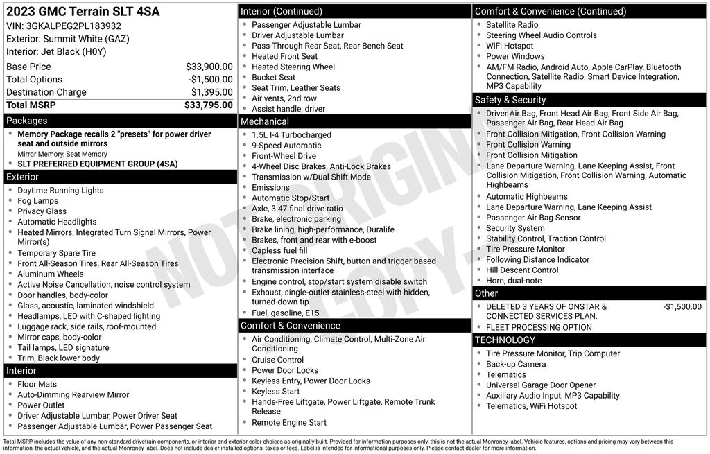 2023 GMC Terrain SLT Summit White SLT FWD 9-Speed Automatic 1.5L DOHC 2 USB Data Ports, 2 USB Data Ports w/SD Card Reader, 3.47 Axle Ratio, 4-Wheel Disc Brakes, 6 Speakers, 6-Speaker Audio System Feature, 6-Way Power Front Passenger Seat, 8-Way Power Driver Seat Adjuster, ABS brakes, Air Conditioning, Alloy wheels, AM/FM radio: SiriusXM, Auto High-beam Headlights, Auto-dimming Rear-View mirror, Automatic temperature control, Bluetooth® For Phone, Brake assist, Bumpers: body-color, Compass, Delay-off headlights, Deleted 3 Years of OnStar & Connected Services Plan, Driver & Front Passenger Heated Seats, Driver door bin, Driver vanity mirror, Dual front impact airbags, Dual front side impact airbags, Electronic Stability Control, Emergency communication system: OnStar and GMC connected services capable, Four wheel independent suspension, Front anti-roll bar, Front Bucket Seats, Front Center Armrest, Front dual zone A/C, Front fog lights, Front Passenger 2-Way Power Lumbar, Front reading lights, Fully automatic headlights, Garage door transmitter, Heated door mirrors, Heated front seats, Heated steering wheel, Illuminated entry, Low tire pressure warning, Memory seat, Occupant sensing airbag, Outside temperature display, Overhead airbag, Overhead console, Panic alarm, Passenger door bin, Passenger vanity mirror, Perforated Leather-Appointed Seat Trim, Power door mirrors, Power Driver Lumbar Control, Power driver seat, Power Liftgate, Power passenger seat, Power steering, Power windows, Preferred Equipment Group 4SA, Radio data system, Radio: GMC Infotainment Audio System w/8" Display, Rear anti-roll bar, Rear seat center armrest, Rear window defroster, Rear window wiper, Remote keyless entry, Roof rack: rails only, Security system, SiriusXM Radio, Speed control, Speed-sensing steering, Split folding rear seat, Spoiler, Steering wheel mounted audio controls, Tachometer, Telescoping steering wheel, Tilt steering wheel, Traction control, Trip computer, Turn signal indicator mirrors, Variably intermittent wipers, Wheels: 18" x 7" Silver Painted Aluminum, Wireless Apple CarPlay/Wireless Android Auto.