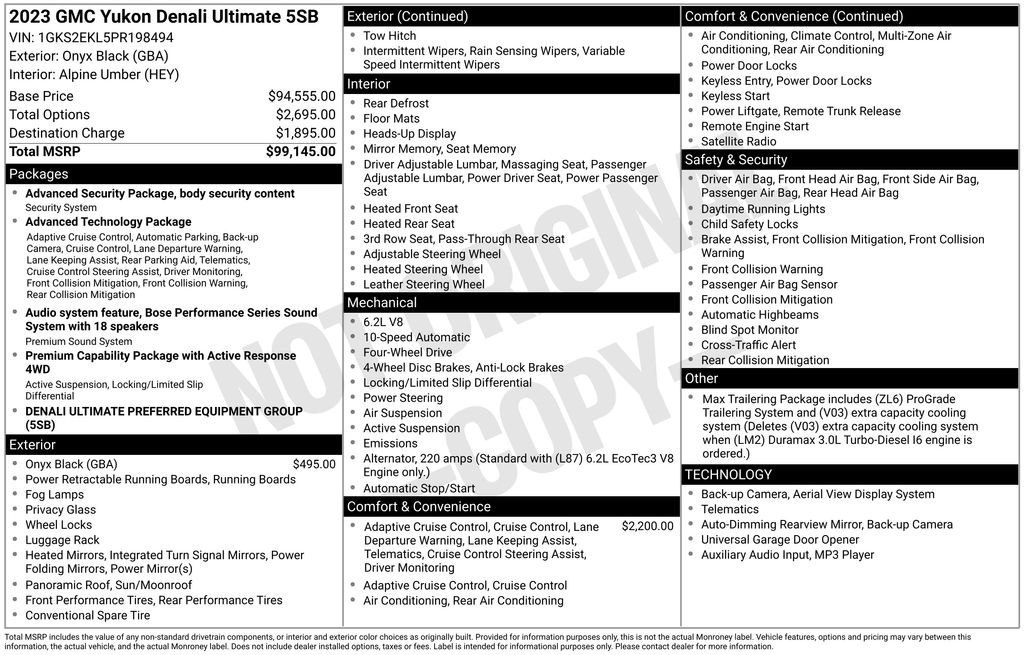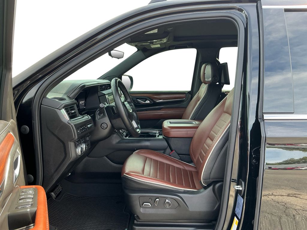 2023 GMC Yukon Denali Ultimate Onyx Black Denali Ultimate 4WD 10-Speed Automatic with Overdrive EcoTec3 6.2L V8 4WD, 15" Diagonal Multi-Color Head-Up Display, 16-Way Power Seat Adjusters, 18 Speakers, 2 Presets For Outside Rearview Mirrors, 3 Years of GMC Connected Services, 3 Years of OnStar Safety & Security, 3 Years of OnStar Safety & Security (DISC), 3.23 Rear Axle Ratio, 3rd Row 60/40 Power-Folding Split-Bench Seat, 3rd row seats: split-bench, 4-Wheel Disc Brakes, ABS brakes, Adaptive Cruise Control, Adaptive suspension, Advanced Security Package, Advanced Technology Package, Air Conditioning, Air Ride Adaptive Suspension, Alloy wheels, AM/FM radio: SiriusXM with 360L, AM/FM Stereo, Apple CarPlay/Android Auto, Auto High-beam Headlights, Auto-dimming door mirrors, Auto-dimming Rear-View mirror, Auto-leveling suspension, Automatic temperature control, Bodyside moldings, Bose Performance Series Sound System w/18 Speakers, Brake assist, Bright Front & Rear Door Sill Plates, Bumpers: body-color, Chrome Door Handles w/Body-Color Strip, Compass, Delay-off headlights, Driver door bin, Driver vanity mirror, Dual Exhaust System, Dual front impact airbags, Dual front side impact airbags, Dual-Pane Panoramic Power Sunroof, Electronic Limited Slip Differential (eLSD), Electronic Stability Control, Emergency communication system: OnStar and GMC connected services capable, Enhanced Automatic Emergency Braking, Enhanced Automatic Parking Assist, Extra Capacity Cooling System, Floor Console, Four wheel independent suspension, Front anti-roll bar, Front Bucket Seats, Front Center Armrest, Front dual zone A/C, Front fog lights, Front reading lights, Full Grain Leather Seats, Fully automatic headlights, Garage door transmitter, Glass Breakage Sensor, Hands-Free Power Programmable Rear Liftgate, HD Surround Vision, Headphones, Heads-Up Display, Heated & Ventilated Driver & Front Passenger Seats, Heated 2nd Row Outboard Position Seats, Heated door mirrors, Heated Driver & Front Passenger Seats, Heated front seats, Heated rear seats, Heated Steering Wheel, Heated steering wheel, Hill Descent Control, Hitch Guidance w/Hitch View, Illuminated entry, Inside Rearview Auto-Dimming Rear Camera Mirror, Integrated Trailer Brake Controller, Lane Departure Warning System, Leather steering wheel, Leather-Wrapped Steering Wheel, Low tire pressure warning, Magnetic Ride Control Suspension, Max Trailering Package, Memory seat, Navigation System, Occupant sensing airbag, Outside Heated Power-Adjustable Mirrors, Outside temperature display, Overhead airbag, Overhead console, Panic alarm, Passenger door bin, Passenger vanity mirror, Power door mirrors, Power driver seat, Power Liftgate, Power moonroof, Power passenger seat, Power Release 2nd Row Bucket Seats, Power steering, Power Tilt & Telescopic Steering Column, Power windows, Power-Retractable Assist Steps, Preferred Equipment Group 5SB, Premium Capability Package w/Active Response 4WD, Rain sensing wipers, Rear air conditioning, Rear anti-roll bar, Rear audio controls, Rear Camera Mirror Washer, Rear Cross Traffic Alert, Rear Pedestrian Alert, Rear reading lights, Rear Seat Media System, Rear window defroster, Rear window wiper, Remote keyless entry, Reverse Automatic Braking, Roof rack: rails only, Safety Alert Seat, Security system, SiriusXM w/360L, Smart Trailer Integration Indicator, Speed control, Speed-sensing steering, Split folding rear seat, Spoiler, Sport Pedal Cover Kit (LPO), Steering wheel memory, Steering wheel mounted audio controls, Super Cruise, Tachometer, Telescoping steering wheel, Theft-Deterrent Alarm System, Tilt steering wheel, Traction control, Trailer Side Blind Zone Alert, Trip computer, Turn signal indicator mirrors, Universal Home Remote, Vader Bodyside Moldings, Variably intermittent wipers, Vehicle Inclination Sensor, Vehicle Interior Movement Sensor, Ventilated front seats, Voltmeter, Wheel Locks (Set of 4) (LPO), Wheels: 22" 7-Spoke Ultra-Bright Machined, Wireless Charging,