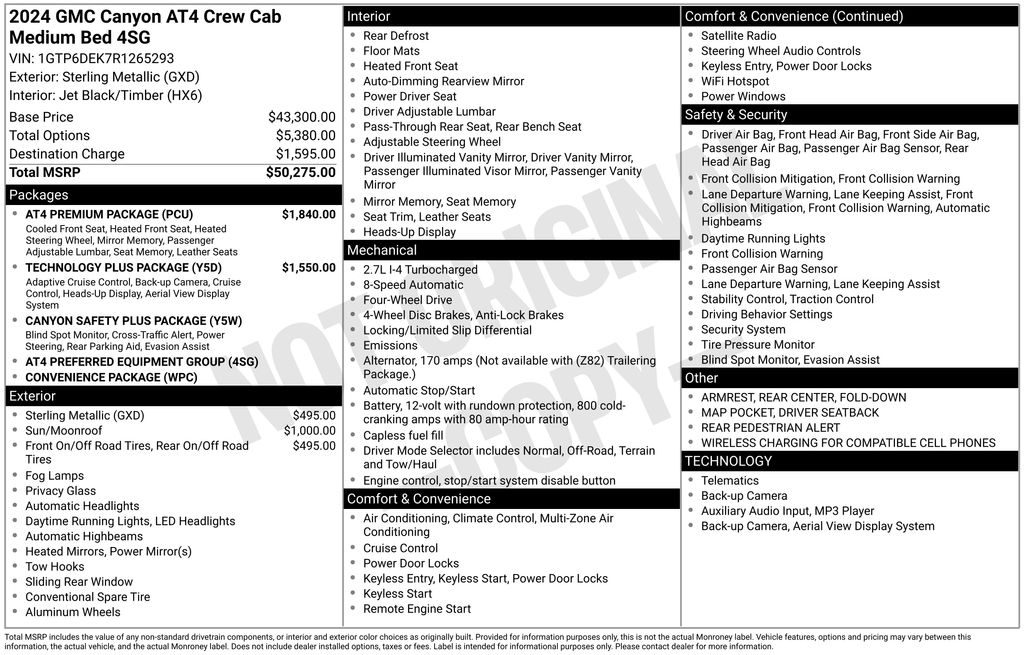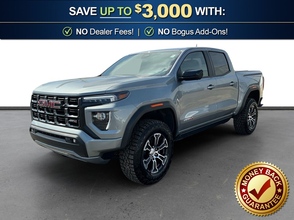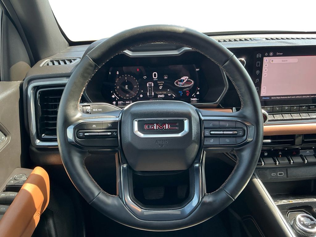 2024 GMC Canyon AT4 Sterling Metallic AT4 4WD 8-Speed Automatic 2.7L I4 Turbocharged DOHC 16V LEV3-SULEV30 310hp 4WD, 120-Volt Bed Mounted Power Outlet, 2 1st Row USB Charge/Data Ports, 2 Rear USB Ports in Center Console (Charge-Only), 3.42 Rear Axle Ratio, 4-Way Manual Front Passenger Seat Adjuster, 4-Wheel Disc Brakes, 6 Speakers, 6-Speaker Audio System Feature, 6-Way Power Passenger Seat Adjuster, 8-Way Power Driver Seat Adjuster, ABS brakes, Adaptive Cruise Control, Air Conditioning, Alloy wheels, AM/FM radio, Apple CarPlay/Android Auto, AT4 Premium Package, Auto High-beam Headlights, Auto-dimming Rear-View mirror, Automatic Emergency Braking, Automatic Locking Rear Differential, Automatic Stop/Start, Automatic temperature control, Blind Zone Steering Assist, Brake assist, Bumpers: body-color, Canyon Pro Safety, Canyon Safety Plus Package, Cloth/CoreTec Seat Trim, Compass, Delay-off headlights, Driver & Front Passenger Illuminated Visors, Driver & Front Passenger Ventilated Seats, Driver door bin, Driver Memory, Driver Mode Selector, Driver Seatback Map Pocket, Driver vanity mirror, Dual front impact airbags, Dual front side impact airbags, Dual-Zone Automatic Air Conditioning, Electronic Stability Control, EZ-Lift & Lower Tailgate, Following Distance Indicator, Forward Collision Alert, Front anti-roll bar, Front Bucket Seats, Front Center Armrest, Front dual zone A/C, Front fog lights, Front LED Fog Lamps, Front Passenger Seatback Map Pocket, Front Pedestrian & Bicyclist Braking, Front reading lights, Front wheel independent suspension, HD Surround Vision, Heated door mirrors, Heated Driver & Front Passenger Seats, Heated front seats, Heated Power-Adjustable Outside Mirrors, Heated Steering Wheel, Illuminated entry, Inside Rear-View Auto-Dimming Mirror, IntelliBeam Automatic High Beam On/Off, Interior Overhead Courtesy Light w/Dual Reading Lamp, Lane Keep Assist w/Lane Departure Warning, Low tire pressure warning, Manual Rear-Sliding Window, Multicolor 6.3" Diagonal Head-Up Display, MultiStow Tailgate, Navigation System, Occupant sensing airbag, Outside temperature display, Overhead airbag, Overhead console, Panic alarm, Passenger door bin, Passenger vanity mirror, Perforated Leather-Appointed Seat Trim, Power door mirrors, Power Driver Lumbar Control Seat Adjuster, Power driver seat, Power Inner Sliding Glass Sunroof w/Manual Shade, Power Passenger Lumbar Control Seat Adjuster, Power steering, Power windows, Preferred Equipment Group 4SG, Radio data system, Radio: 11.3" Diagonal Premium GMC Infotainment Sys, Rear Center Fold-Down Armrest w/2 Cupholders, Rear Cross Traffic Braking, Rear of Console 120-Volt Power Outlet, Rear Pedestrian Alert, Rear reading lights, Rear step bumper, Rear window defroster, Rear-Window Electric Defogger, Remote keyless entry, Remote Vehicle Starter System, Security system, SiriusXM w/360L, Speed control, Speed-sensing steering, Split folding rear seat, Steering wheel mounted audio controls, Stop/Start System Disable Button Engine Control, Tachometer, Tailgate Keyed Cylinder Lock, Technology Plus Package, Telescoping steering wheel, Tilt & Telescopic Manual Steering Column, Tilt steering wheel, Traction control, Trip computer, Ultrasonic Rear Park Assist, Variably intermittent wipers, Wheels: 18" x 8.5" Dark Gray Machined Finish Alum, Wireless Apple CarPlay/Wireless Android Auto, Wireless Charging, 4WD.