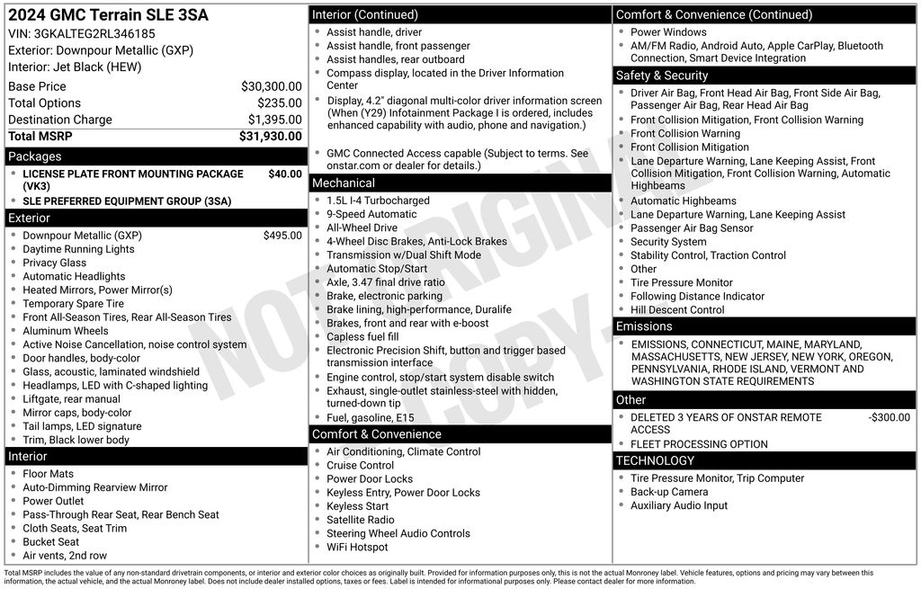 2024 GMC Terrain SLE Downpour Metallic SLE AWD 9-Speed Automatic 1.5L DOHC AWD, 2 USB Data Ports w/Auxiliary Input Jack, 3.47 Final Drive Axle Ratio, 4-Way Manual Driver's Seat, 4-Way Manual Front Passenger Seat, 4-Wheel Disc Brakes, 4.2" Multi-Color Driver Information Screen, 6 Speakers, 6-Speaker Audio System Feature, ABS brakes, Air Conditioning, Alloy wheels, AM/FM radio: SiriusXM, Auto High-beam Headlights, Auto-dimming Rear-View mirror, Automatic temperature control, Bluetooth® For Phone, Brake assist, Bumpers: body-color, Compass, Delay-off headlights, Deleted 3 Years of Remote Access, Driver door bin, Driver vanity mirror, Dual front impact airbags, Dual front side impact airbags, Electronic Stability Control, Emergency communication system: OnStar and GMC connected services capable, Four wheel independent suspension, Front anti-roll bar, Front Bucket Seats, Front Center Armrest, Front reading lights, Fully automatic headlights, Heated door mirrors, Illuminated entry, License Plate Front Mounting Package, Low tire pressure warning, Occupant sensing airbag, Outside temperature display, Overhead airbag, Overhead console, Panic alarm, Passenger door bin, Passenger vanity mirror, Power door mirrors, Power steering, Power windows, Preferred Equipment Group 3SA, Premium Cloth Seat Trim, Radio data system, Radio: GMC Infotainment Audio System w/7" Display, Rear anti-roll bar, Rear seat center armrest, Rear window defroster, Rear window wiper, Remote keyless entry, Security system, SiriusXM, Speed control, Speed-sensing steering, Split folding rear seat, Spoiler, Steering wheel mounted audio controls, Tachometer, Telescoping steering wheel, Tilt steering wheel, Traction control, Trip computer, Variably intermittent wipers, Wheels: 17" x 7" Silver Painted Aluminum, Wireless Apple CarPlay/Wireless Android Auto, AWD.